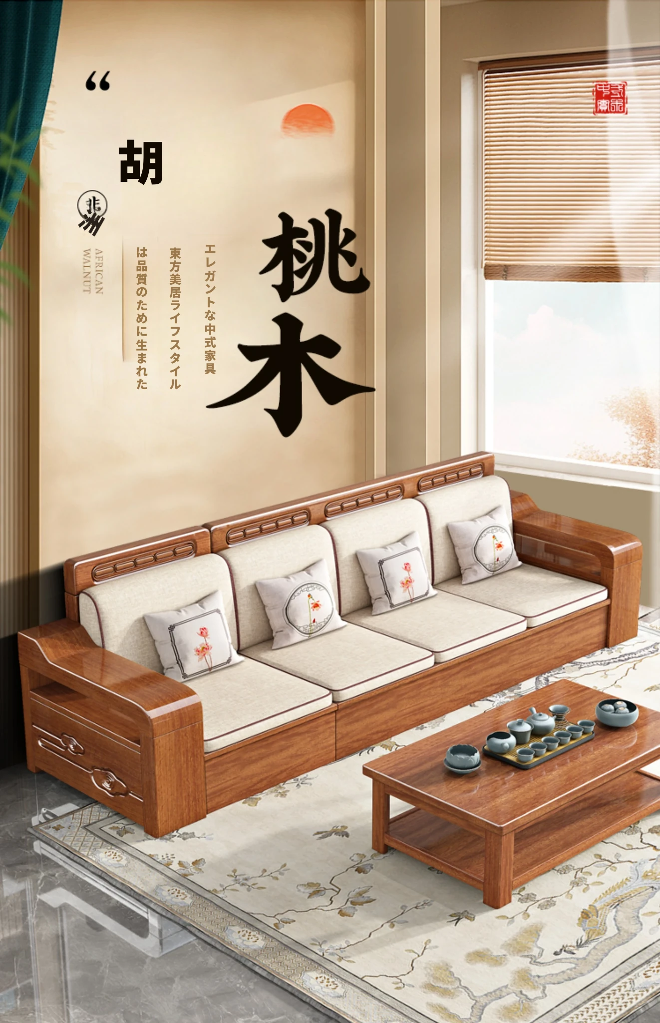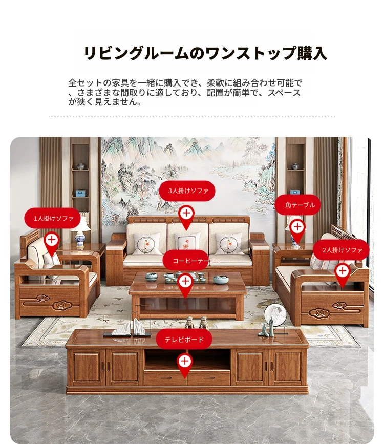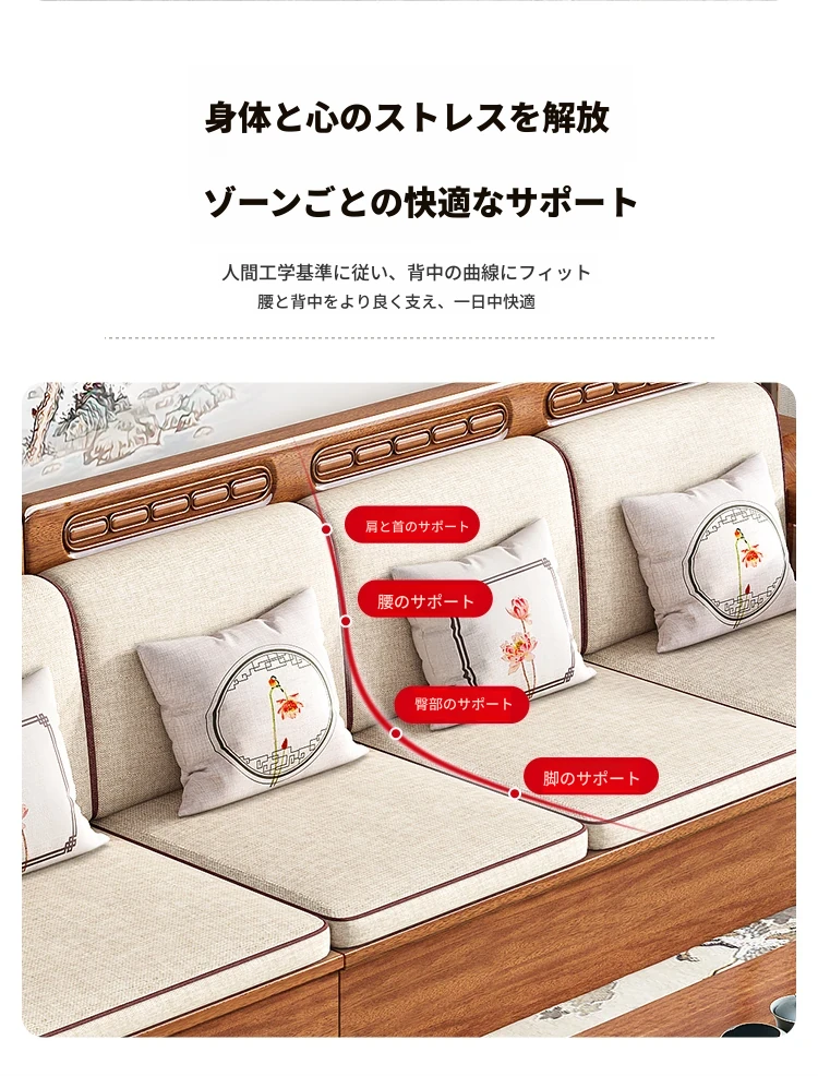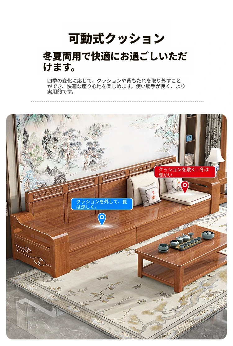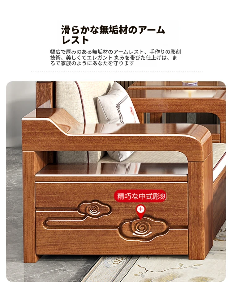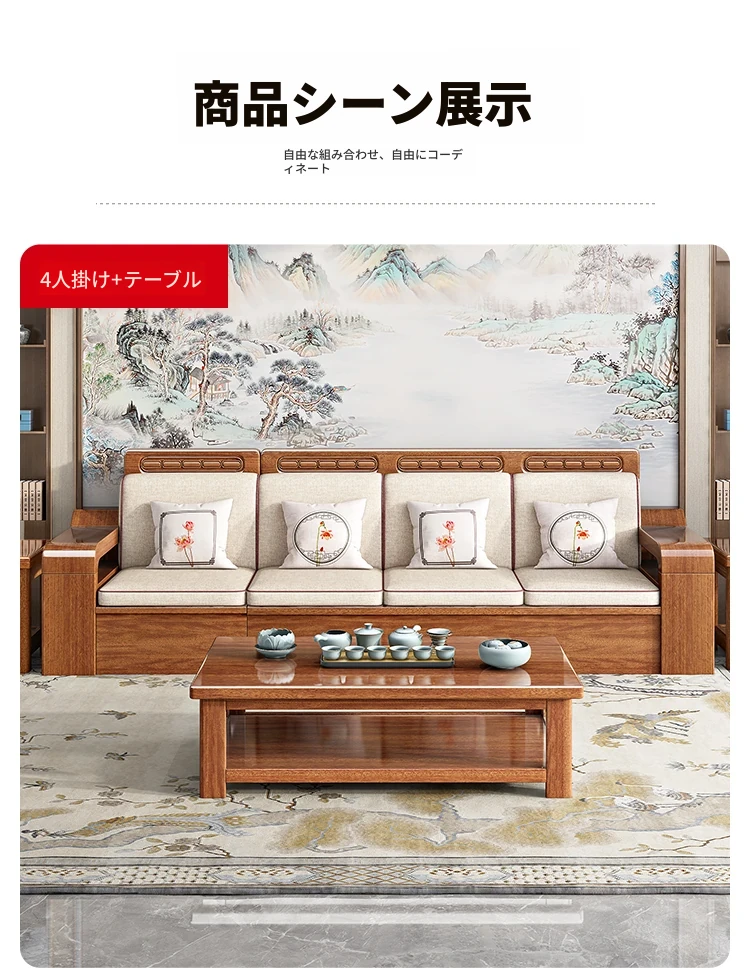 新中式スタイルの無垢材ソファセット - コンパクトなリビングにぴったり!4人掛け、全て無垢材使用で高級感あふれるデザイン。茶卓付きで、快適なひとときをお楽しみください!