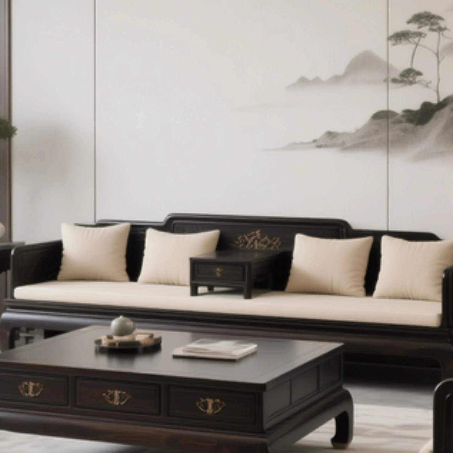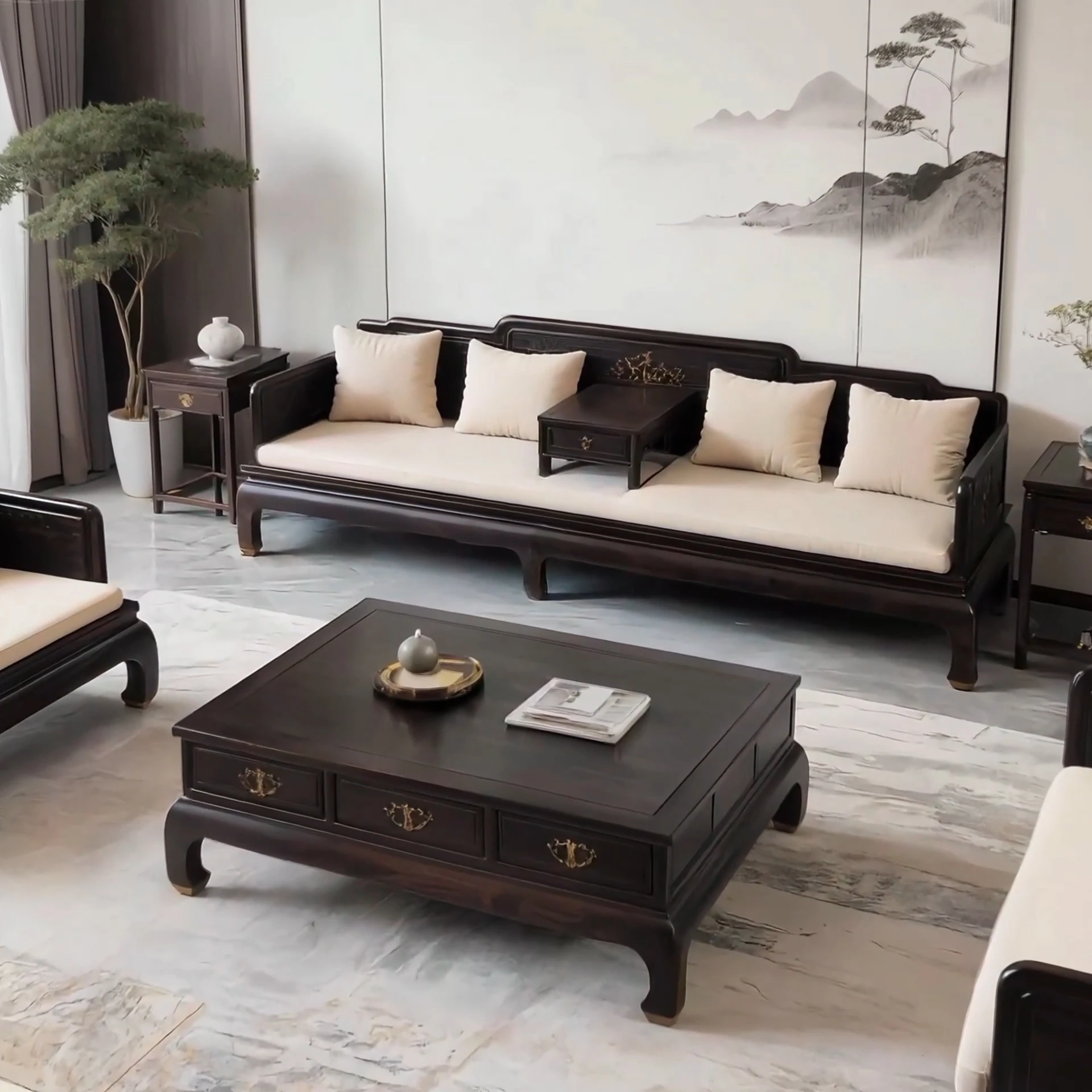 新中式スタイルの北米ブラックウォールナット無垢材ローハンソファセット - 高級感溢れるウッディなデザインで、ヴィラやホテルのインテリアに最適!快適さと美しさを兼ね備えた家具です。