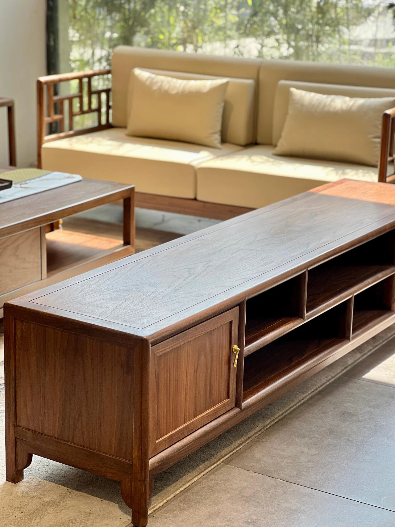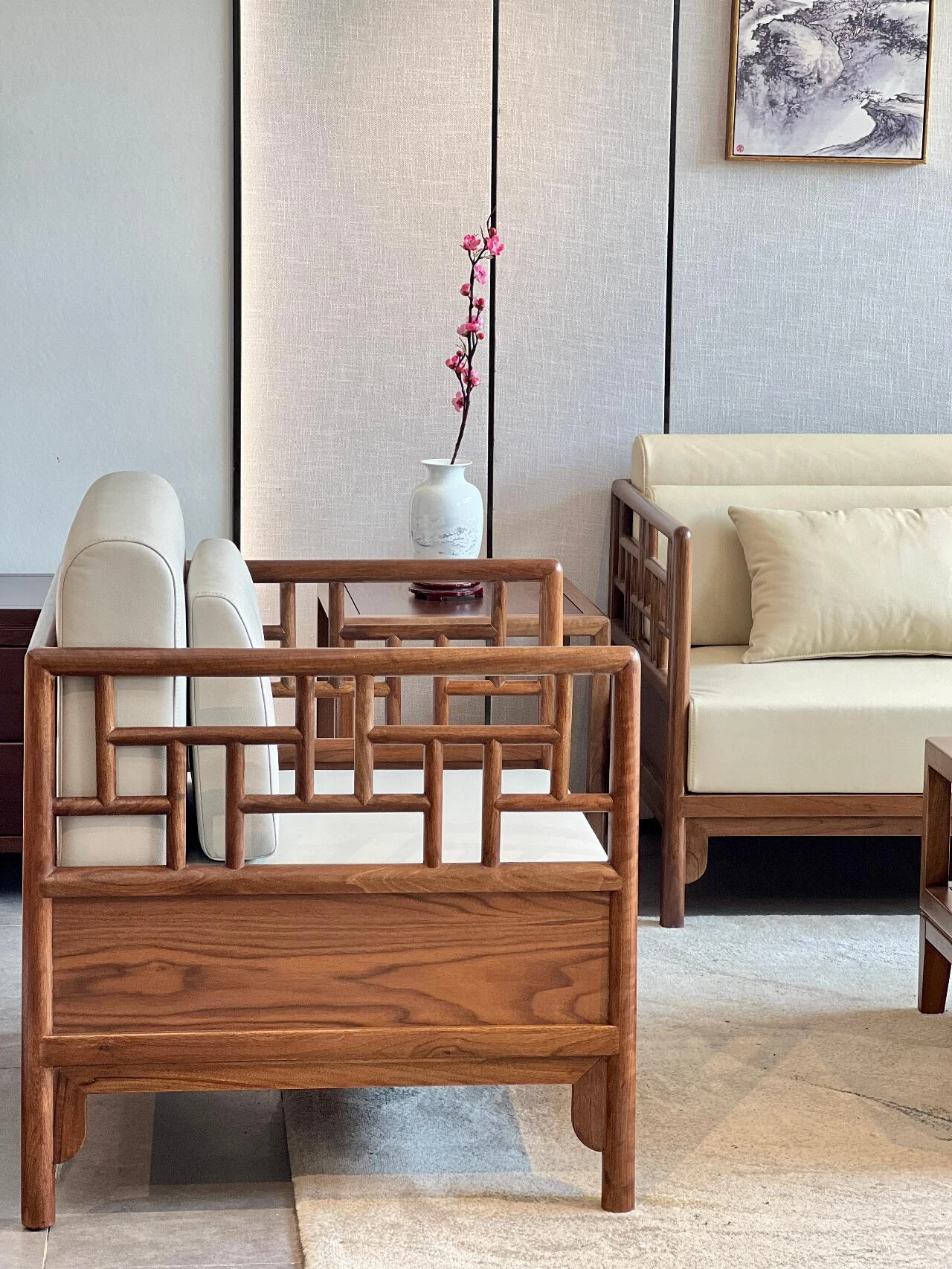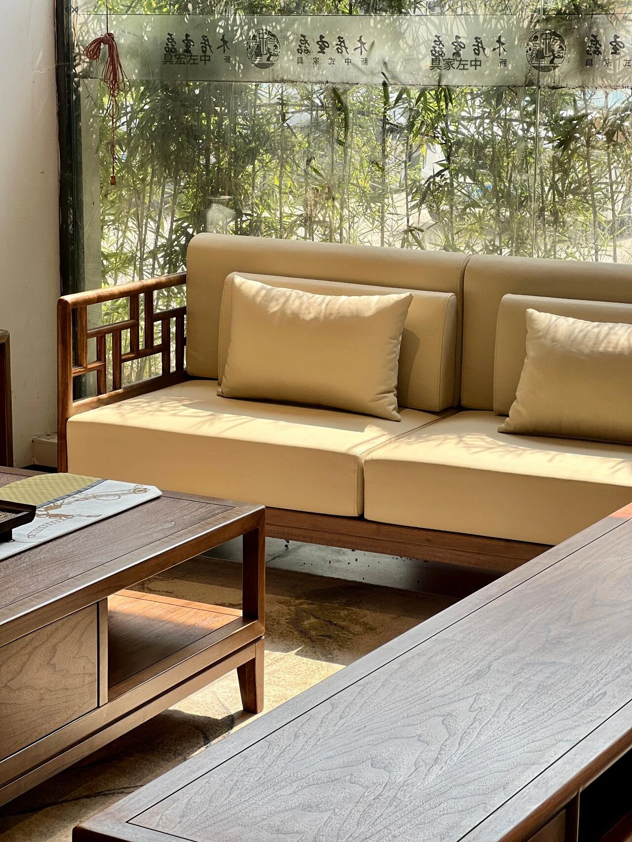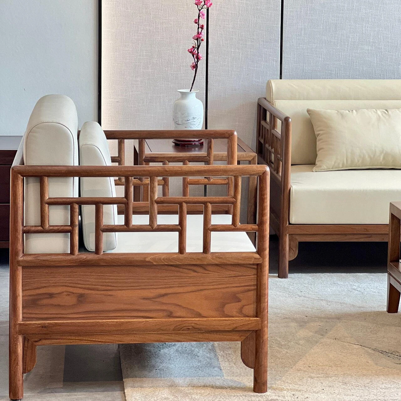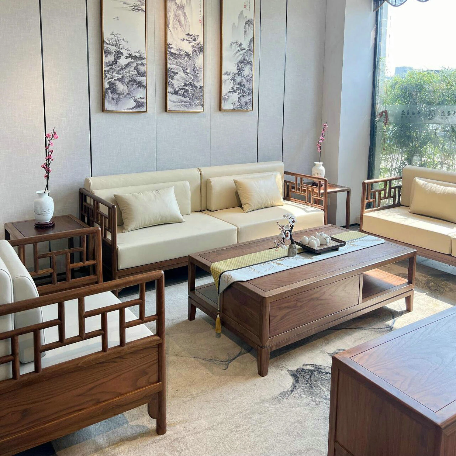 宋スタイルの新中式ソファセット 大型ブラックウォールナットリビングソファ シンプルでモダンな布張りの実木ソファで、洗練された空間を演出します。快適さと美しさを兼ね備えた一品です!