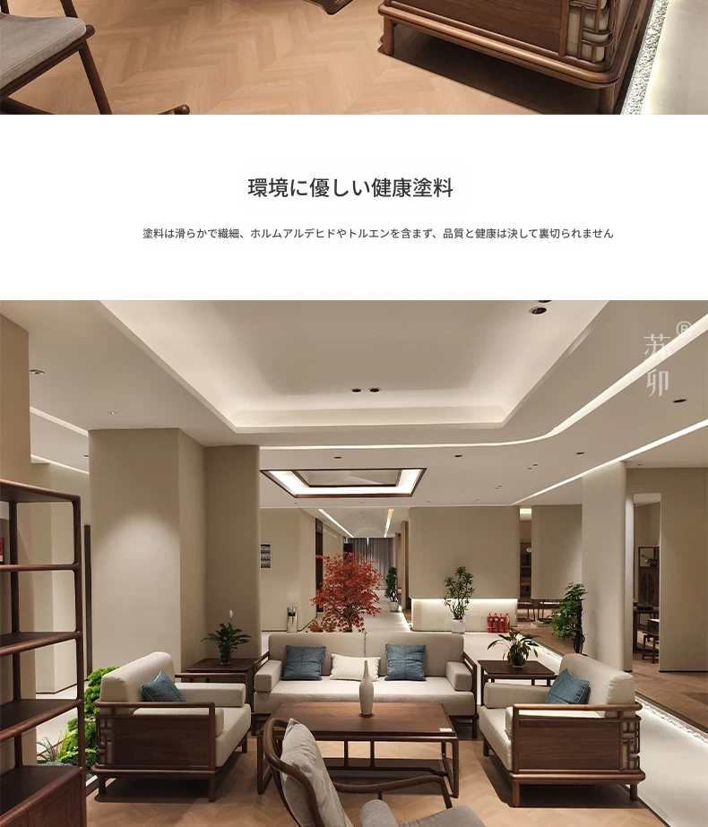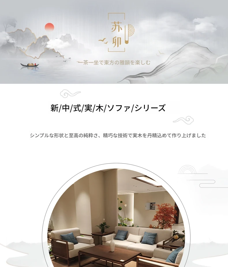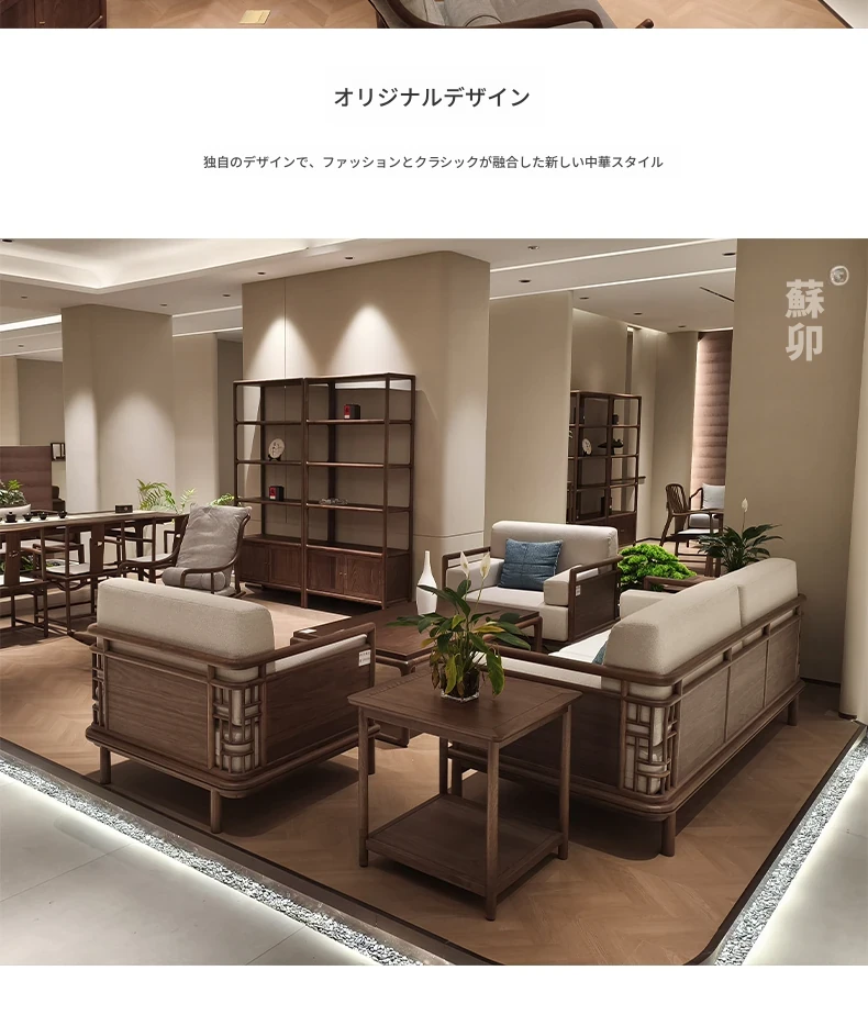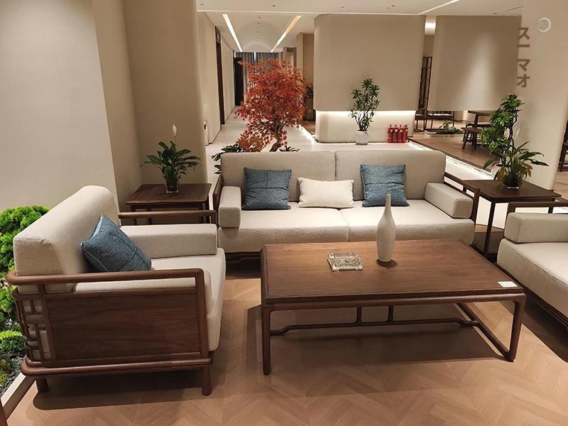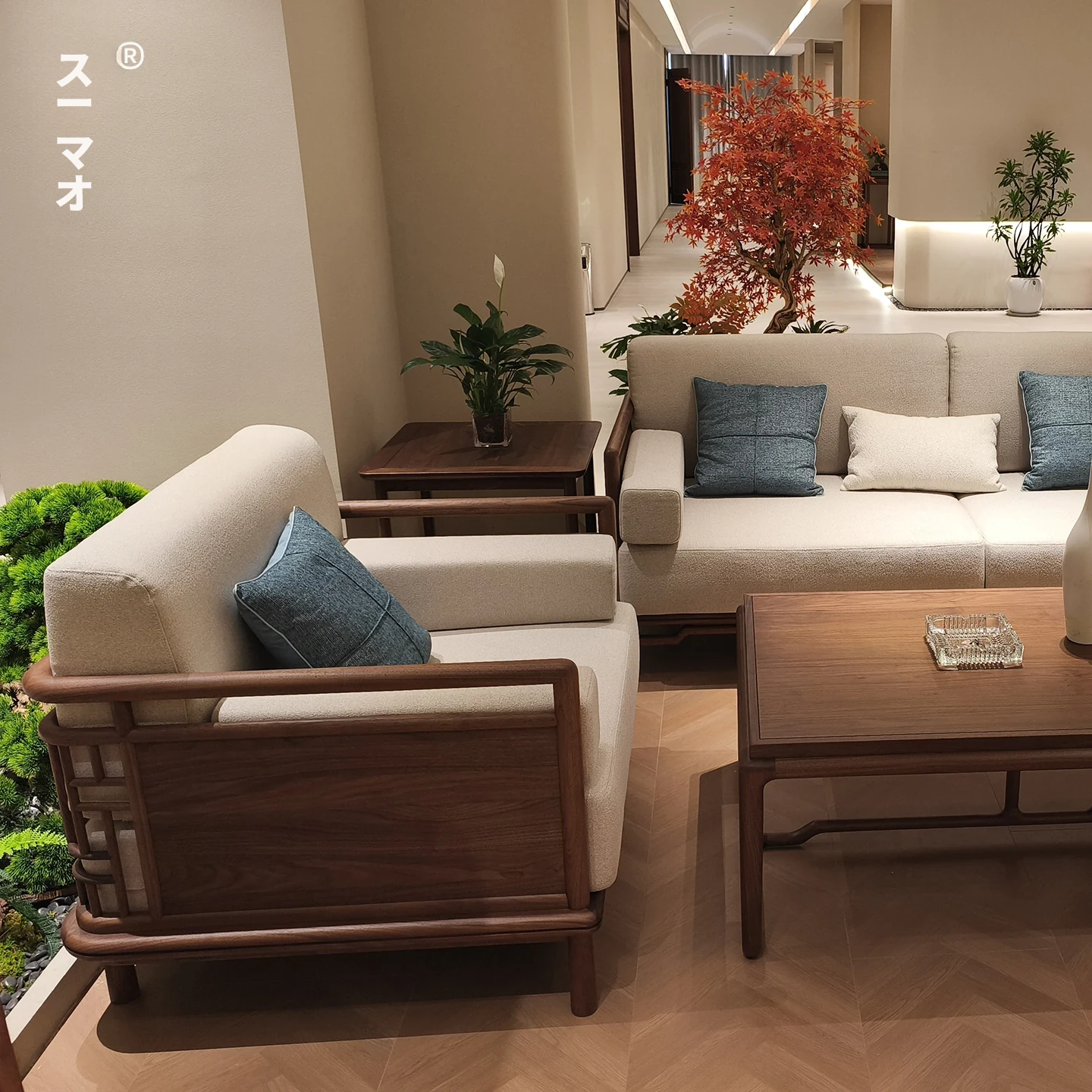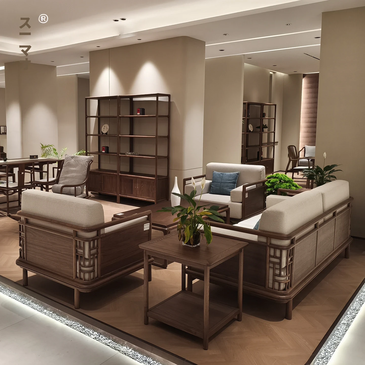 宋風新中式無垢材ソファセット|ブラックウォールナット材|オフィス接待に最適なシンプルなデザイン|リビングルームにぴったりな布製ソファで、上質な寛ぎを提供します。