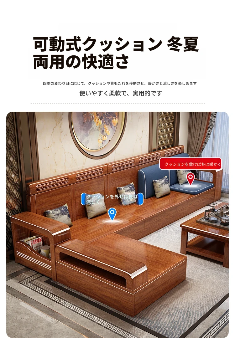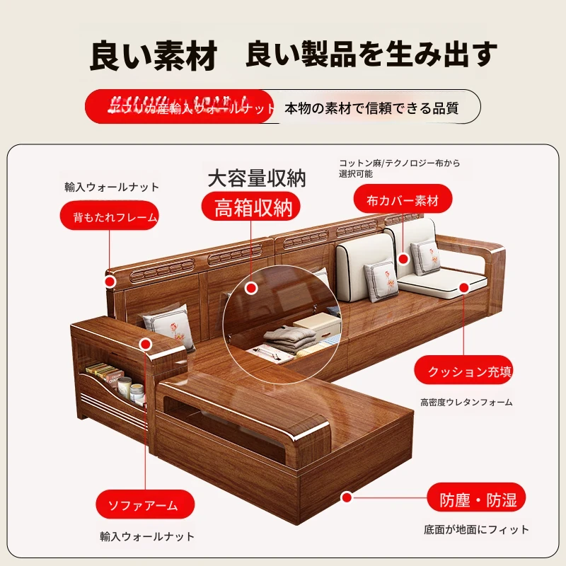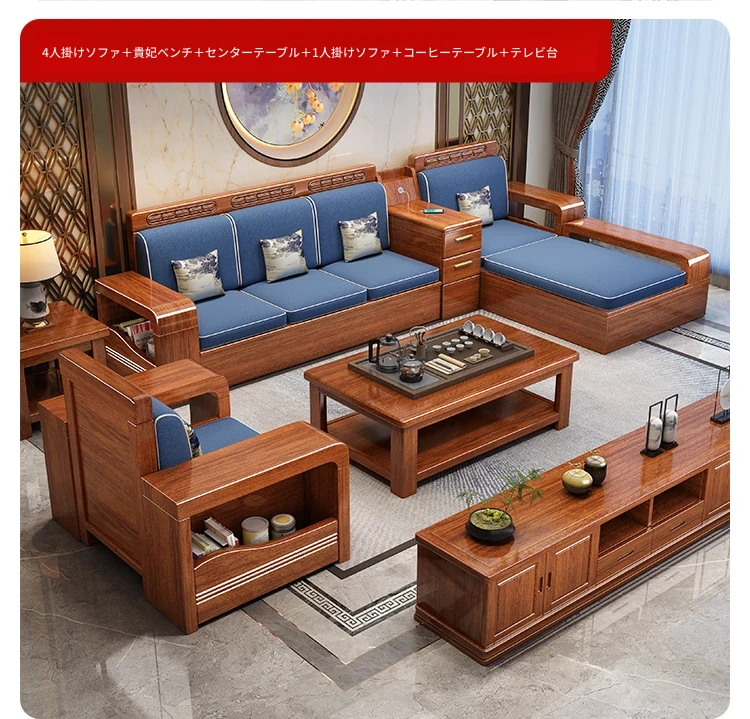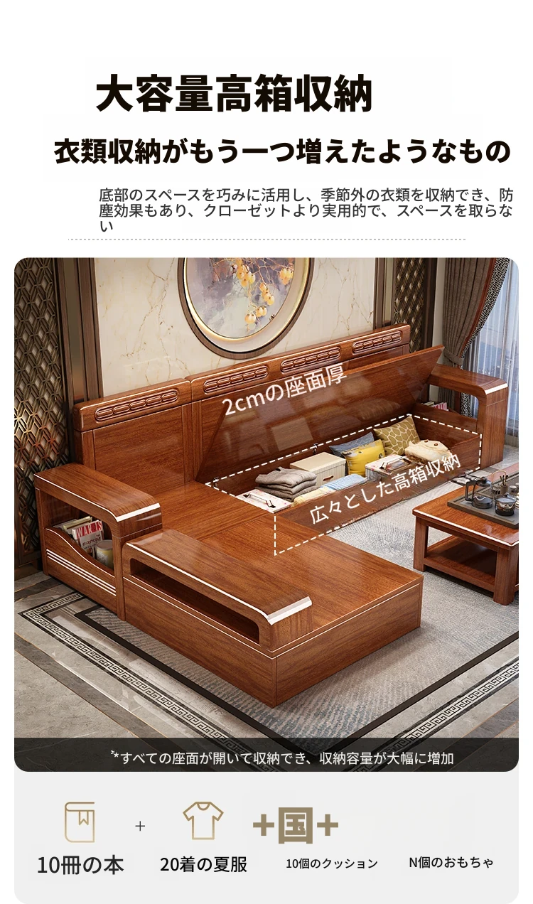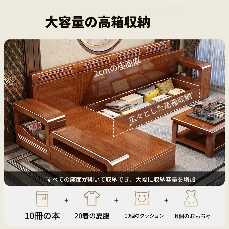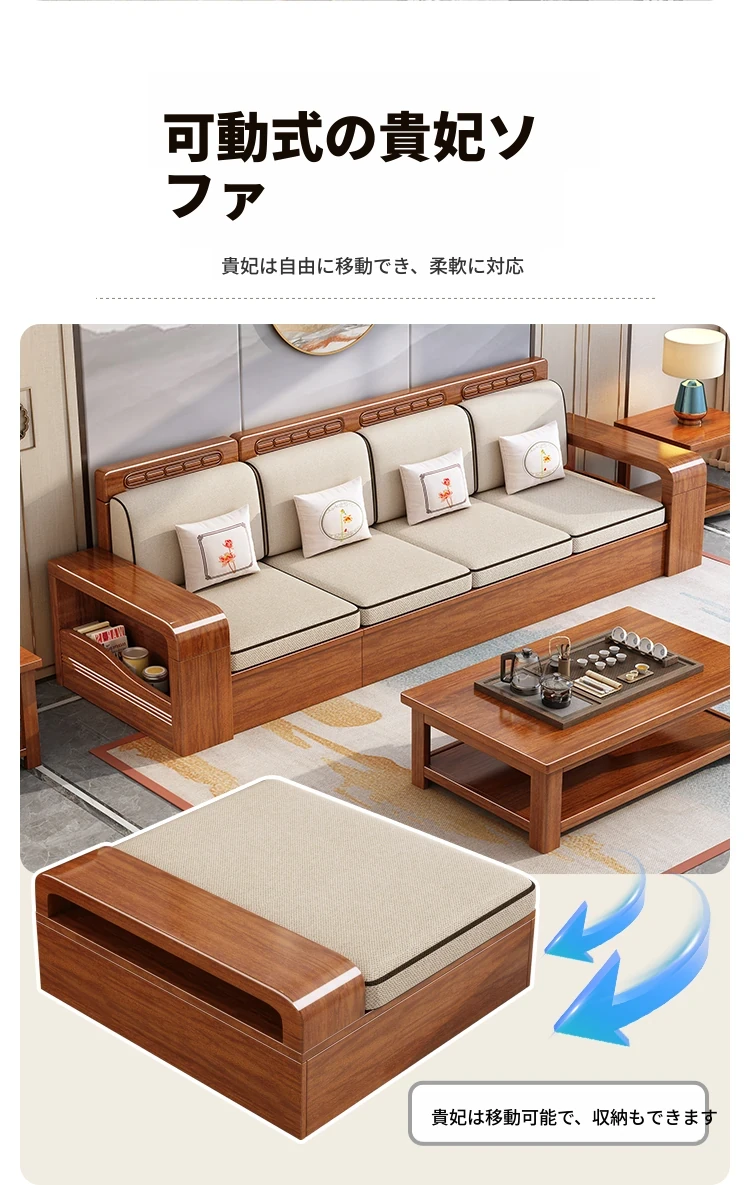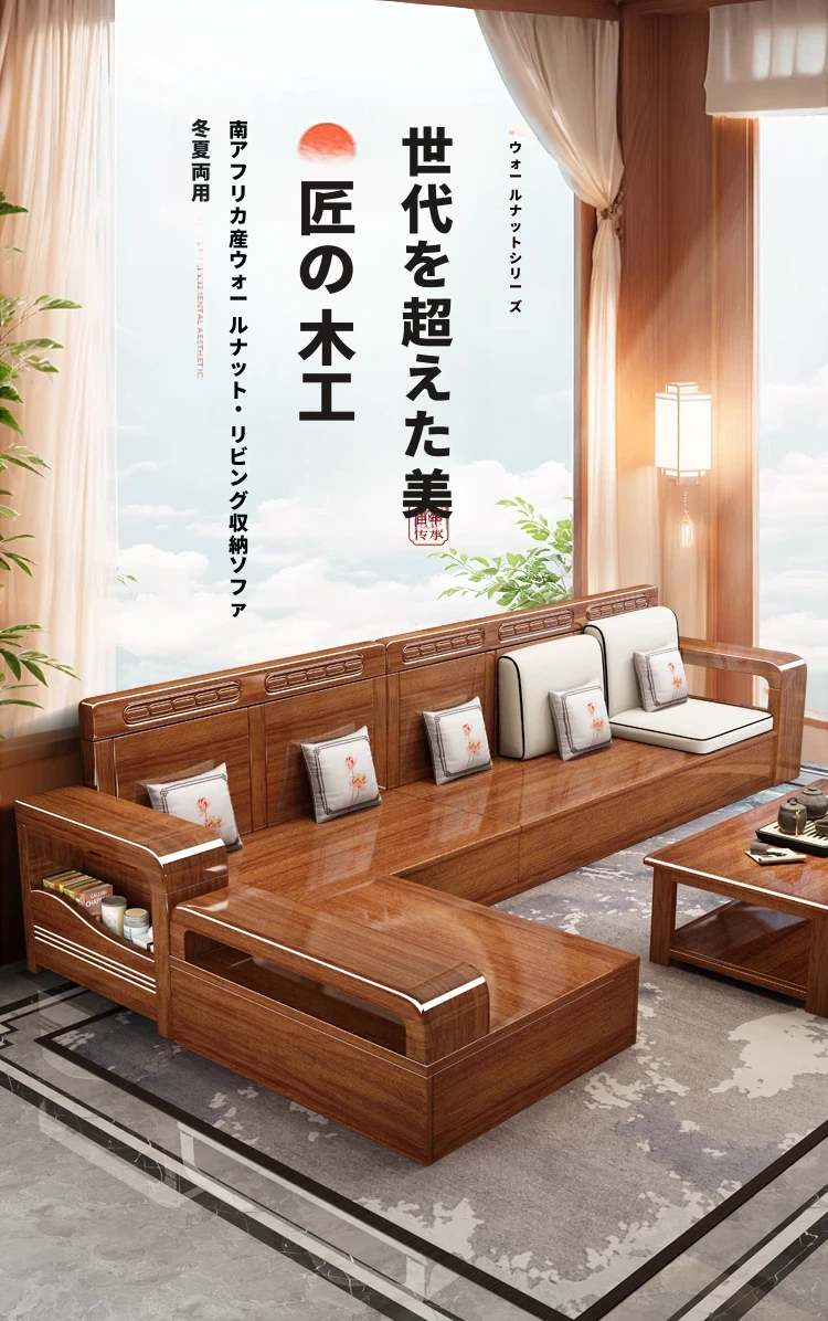 新中式デザインの無垢材ソファ!小型リビングに最適な3人掛け収納付きウォールナットソファ。おしゃれで機能的、田舎の家にもぴったりの組み合わせ!