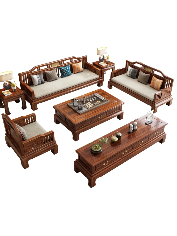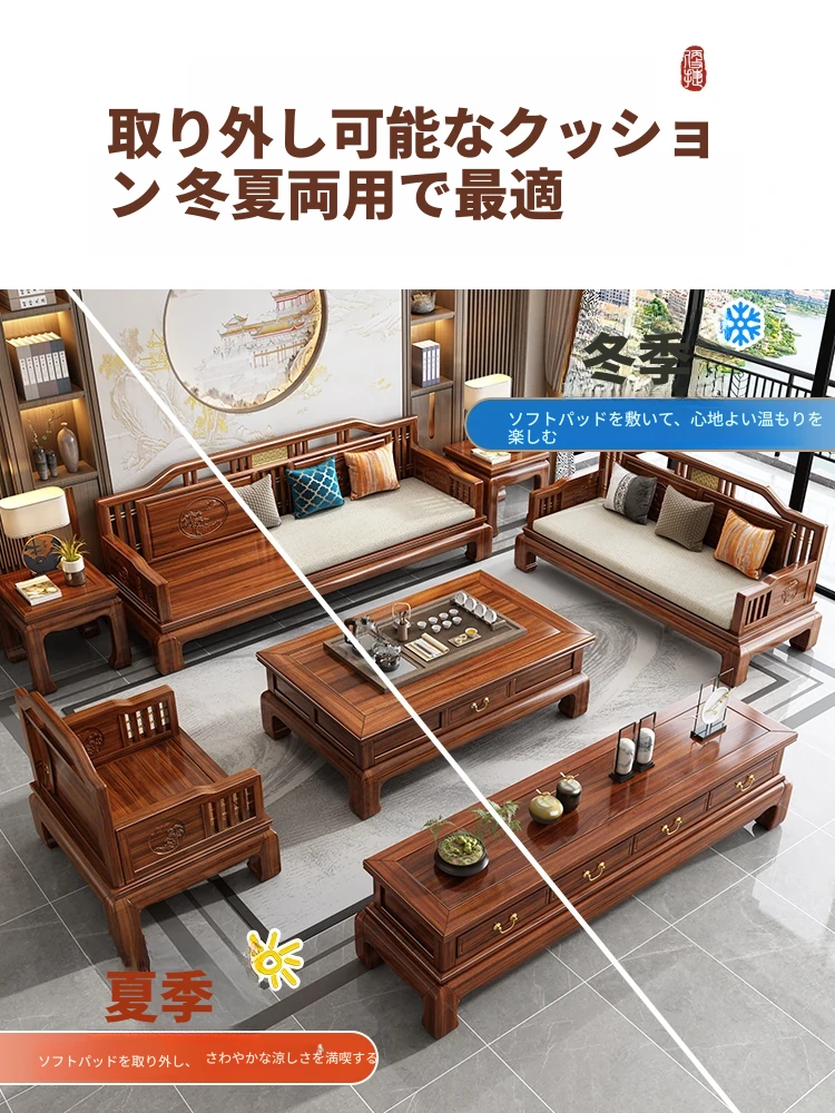 現代中式全無垢材リビングソファー、仿紅木風の古典的彫刻デザイン、123コンビネーションセット、優雅で耐久性抜群の家具。あなたのリビングルームにぴったり!