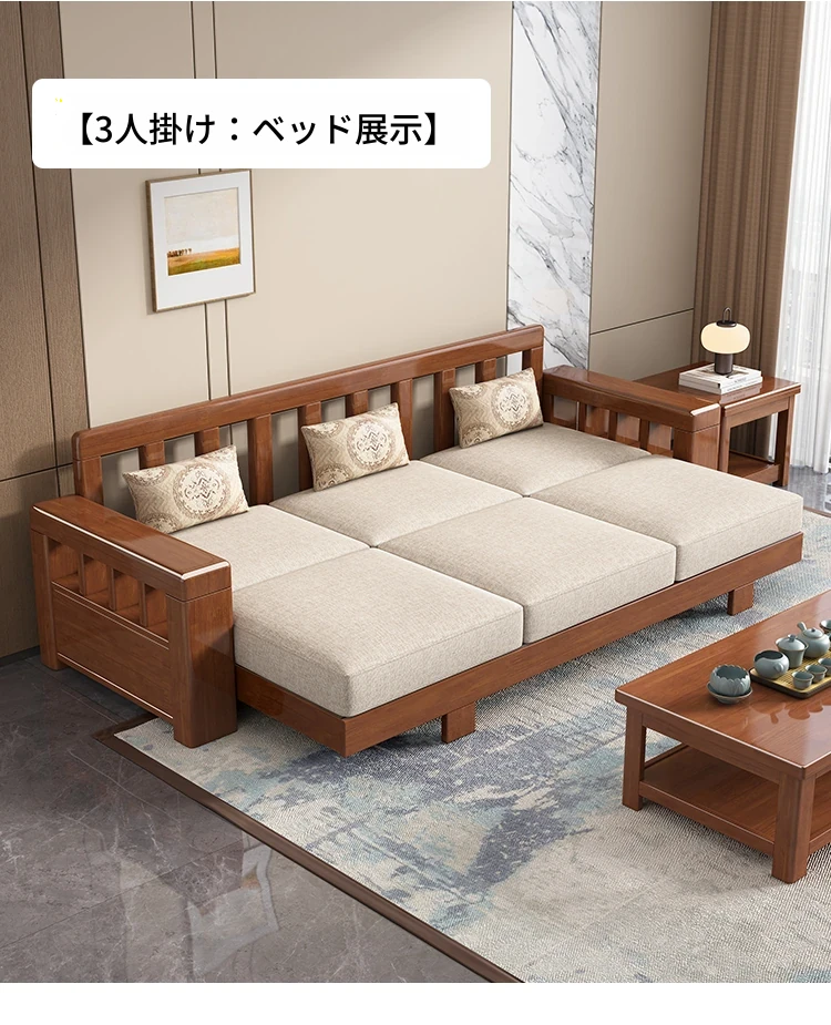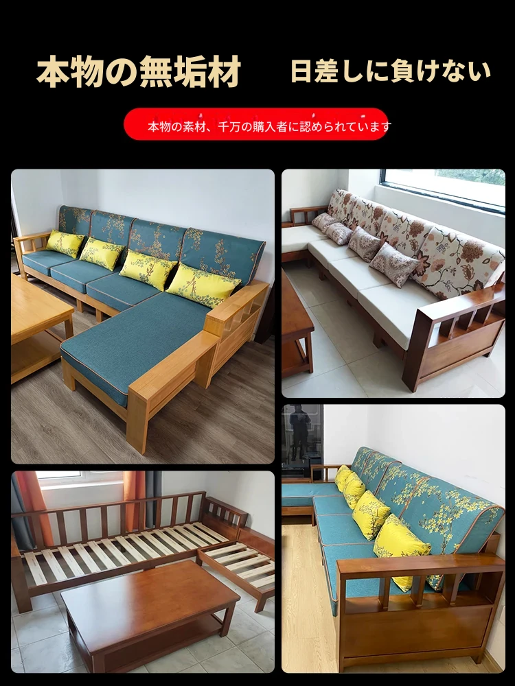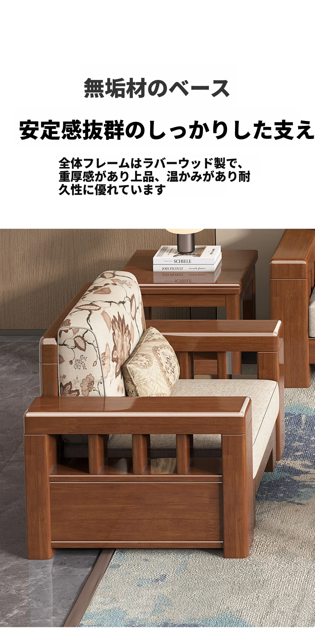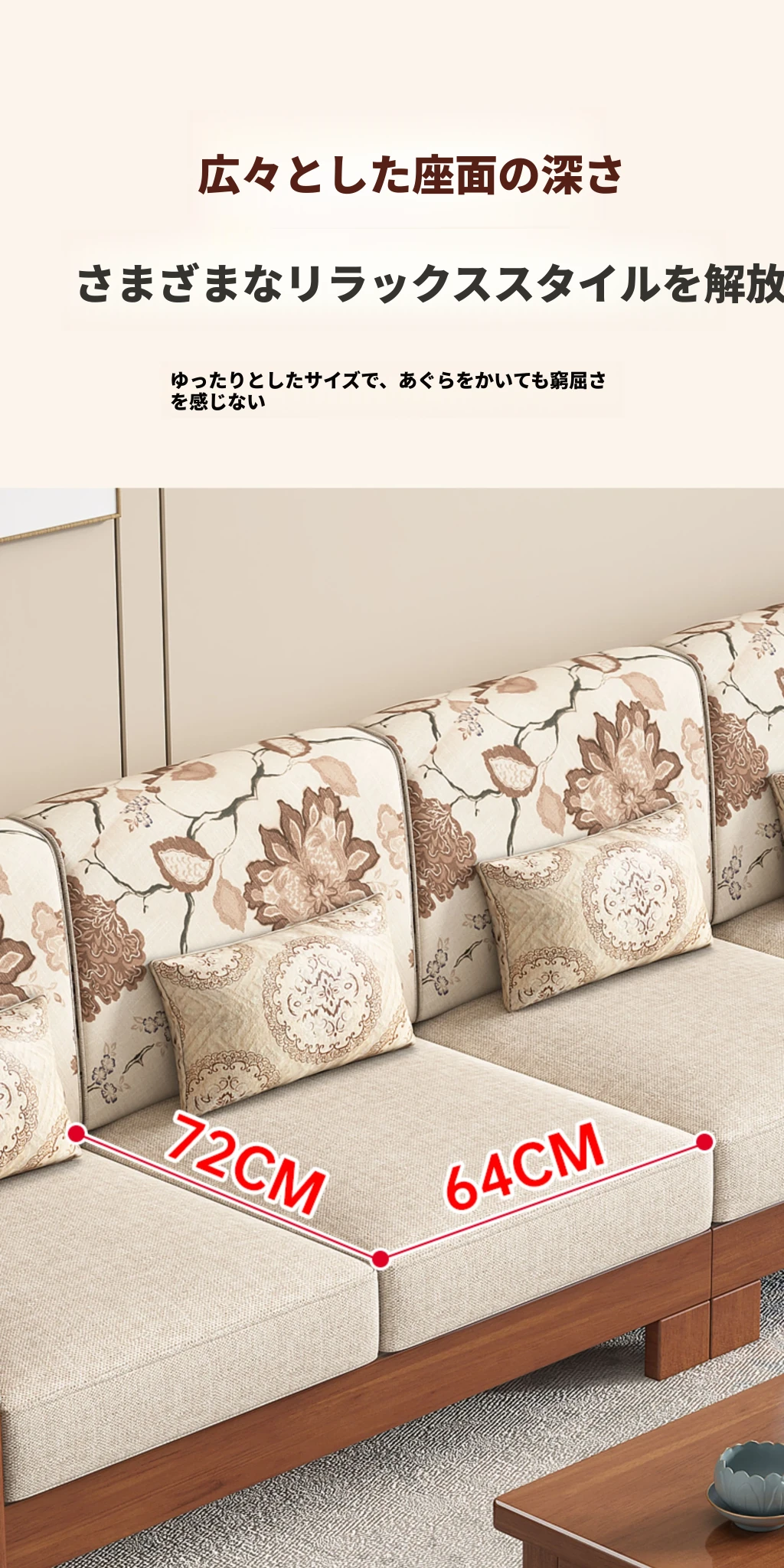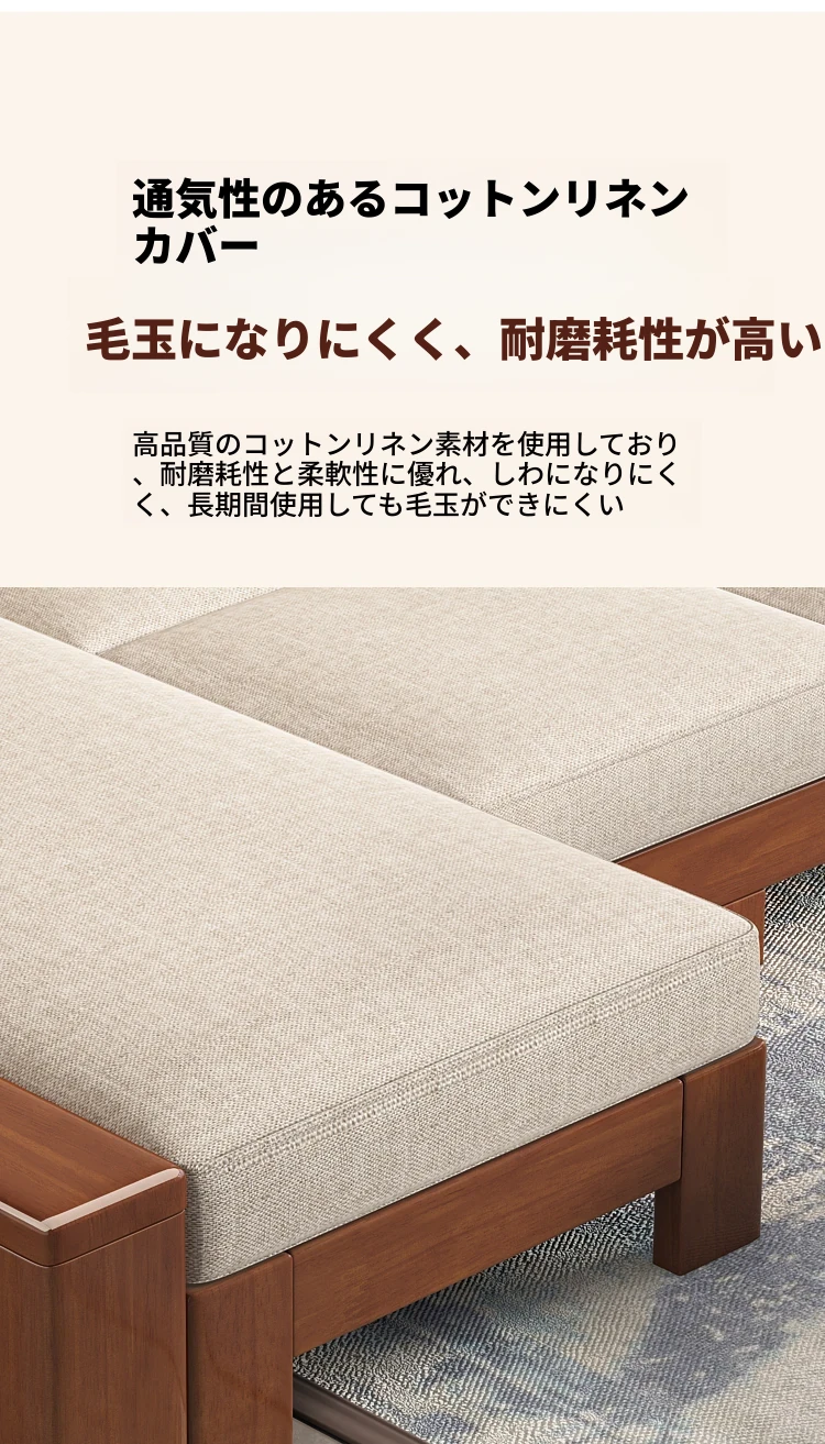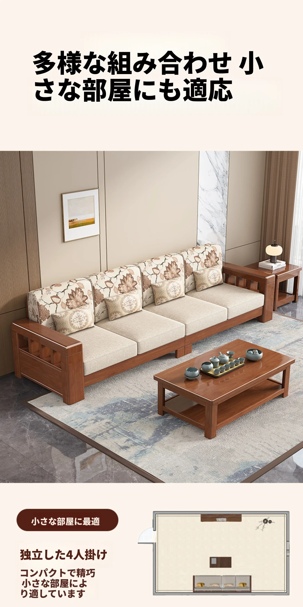モダンミニマリストの無垢材ソファ - 新中式デザイン、コンパクトなリビングルームに最適!洗える布張り、木製フレームでお手入れ簡単。おしゃれで機能性抜群のインテリアをお楽しみください!