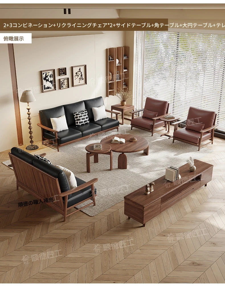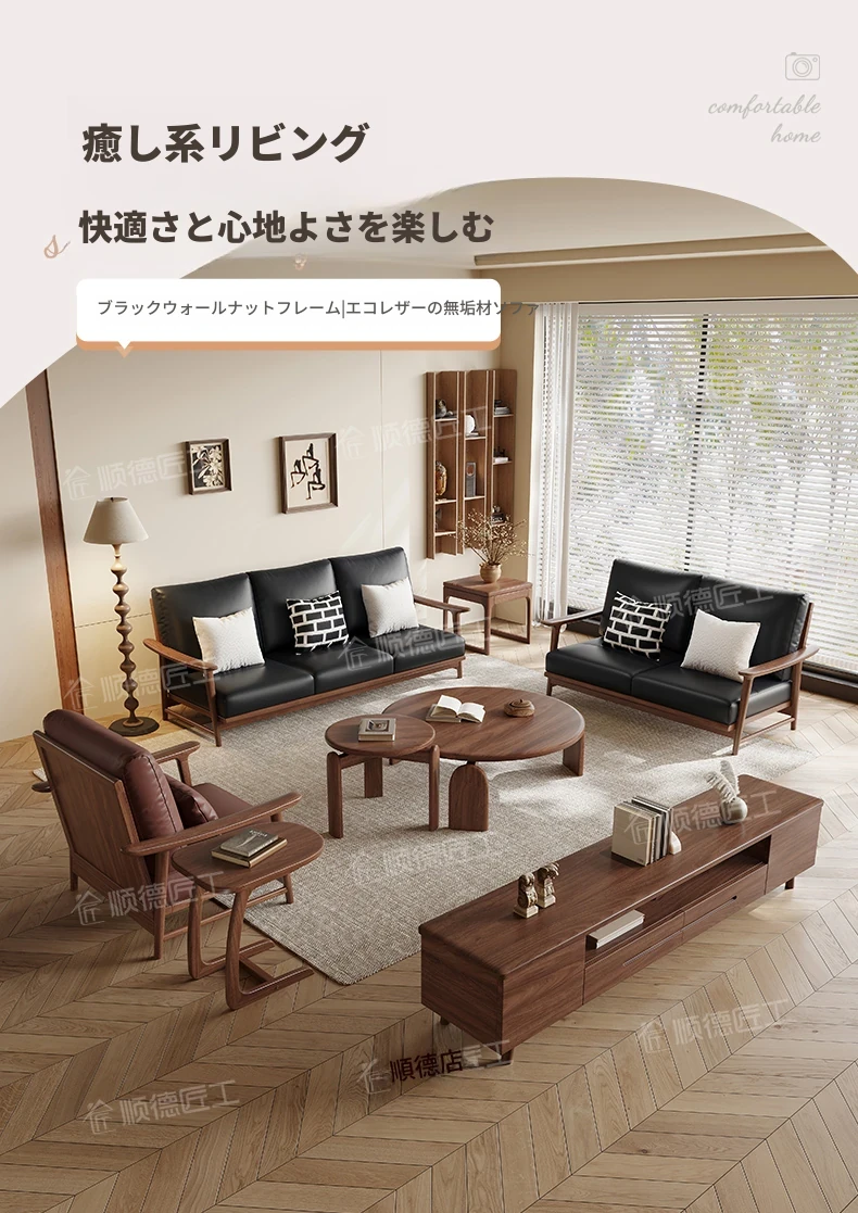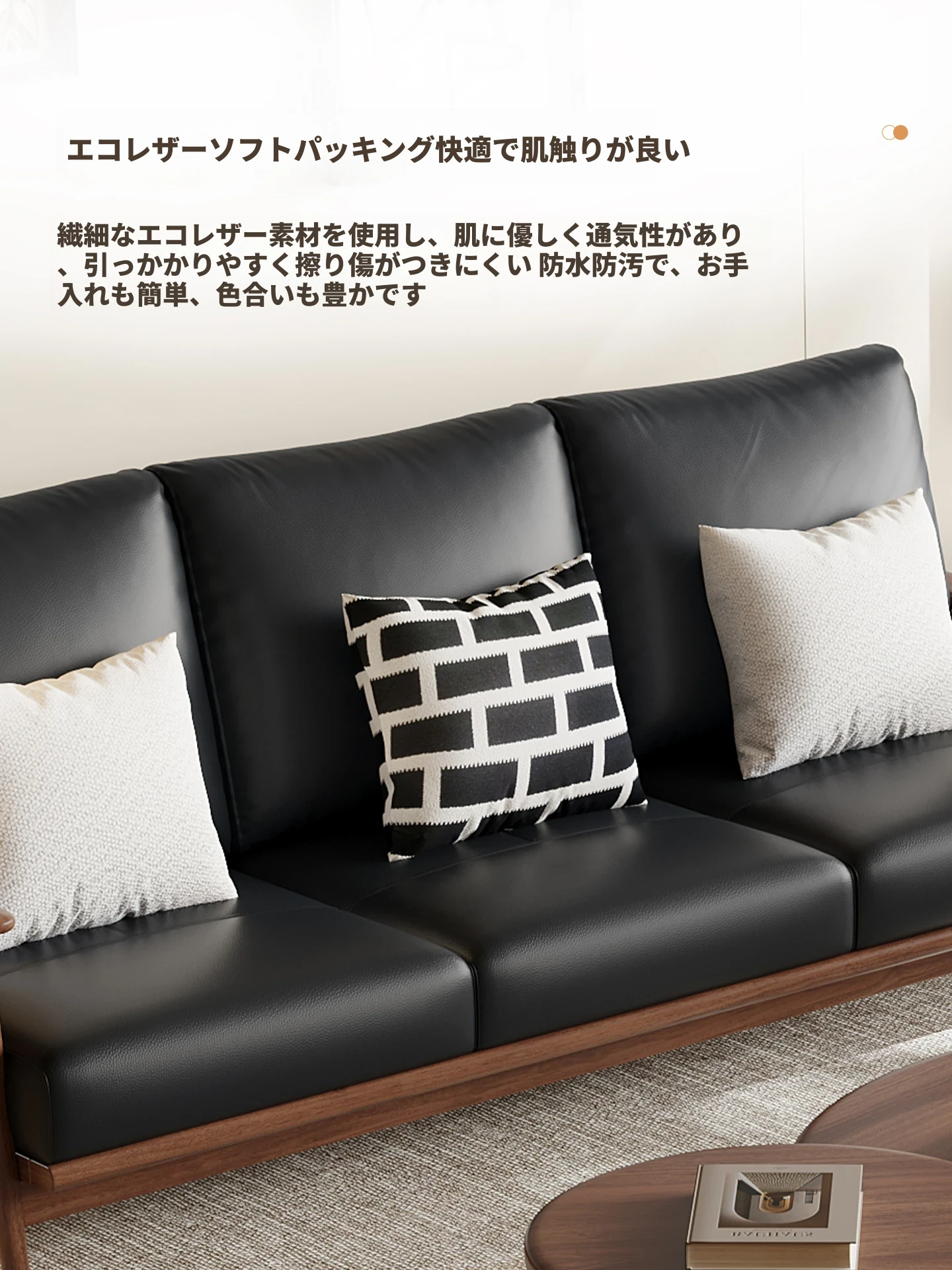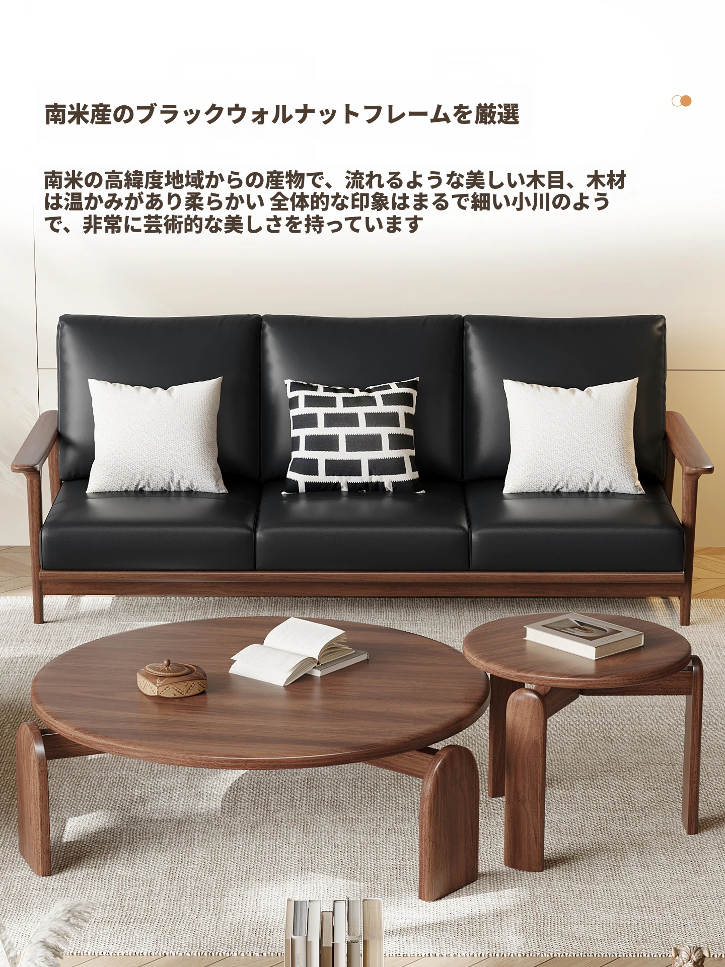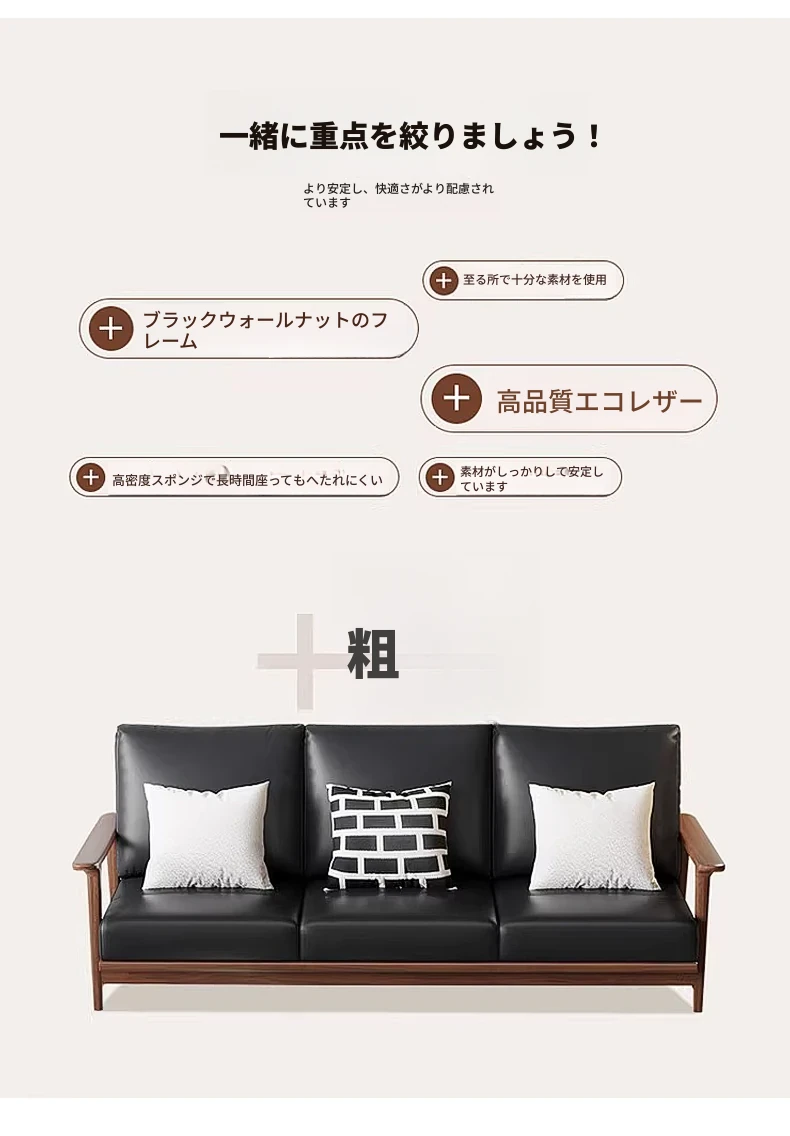 現代的なミニマリストデザイン!ブラックウォールナット無垢材ソファセット - 本革使用で高級感あふれる、大小さまざまなお部屋に最適な禅の雰囲気を持つ中華スタイルのリビング家具。