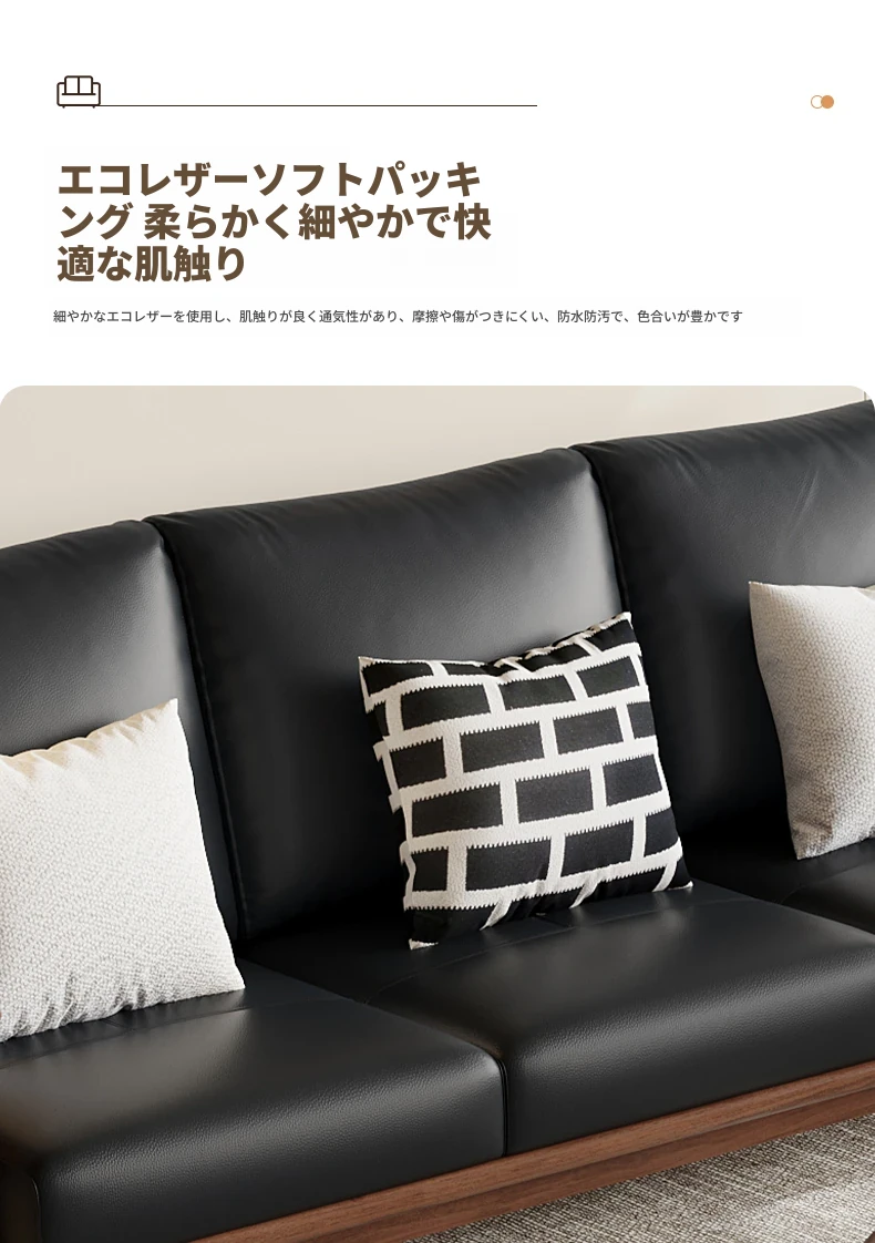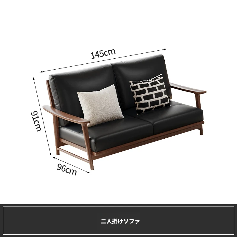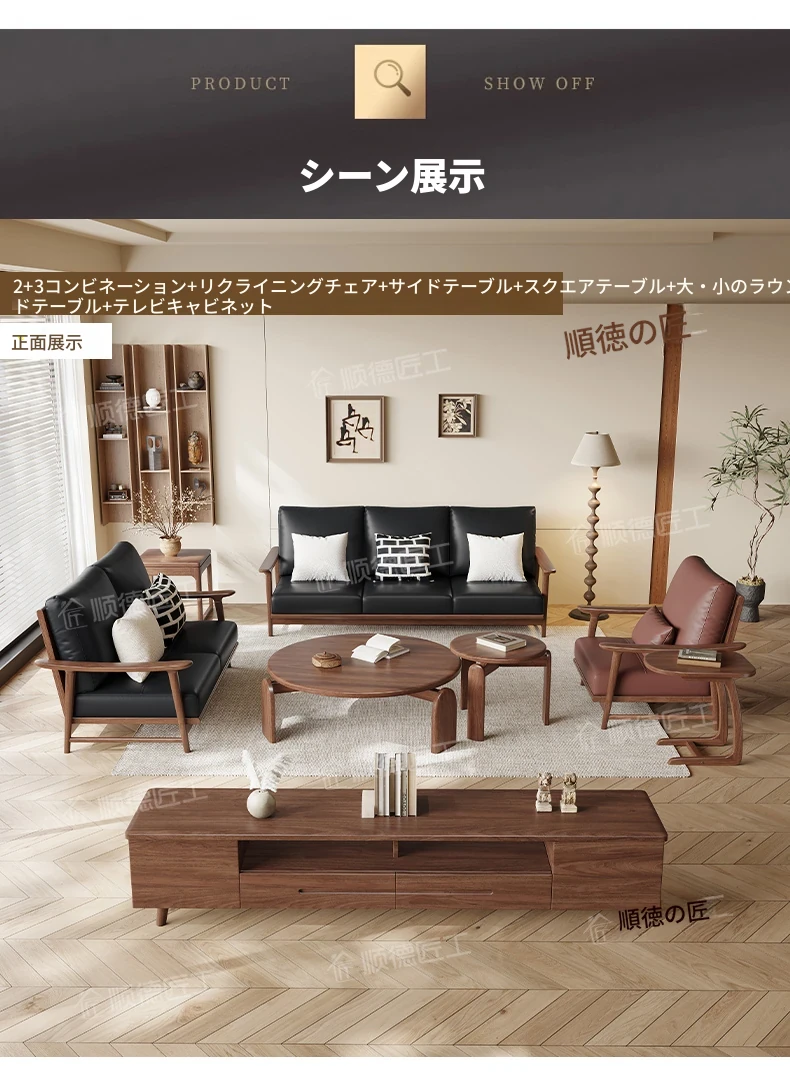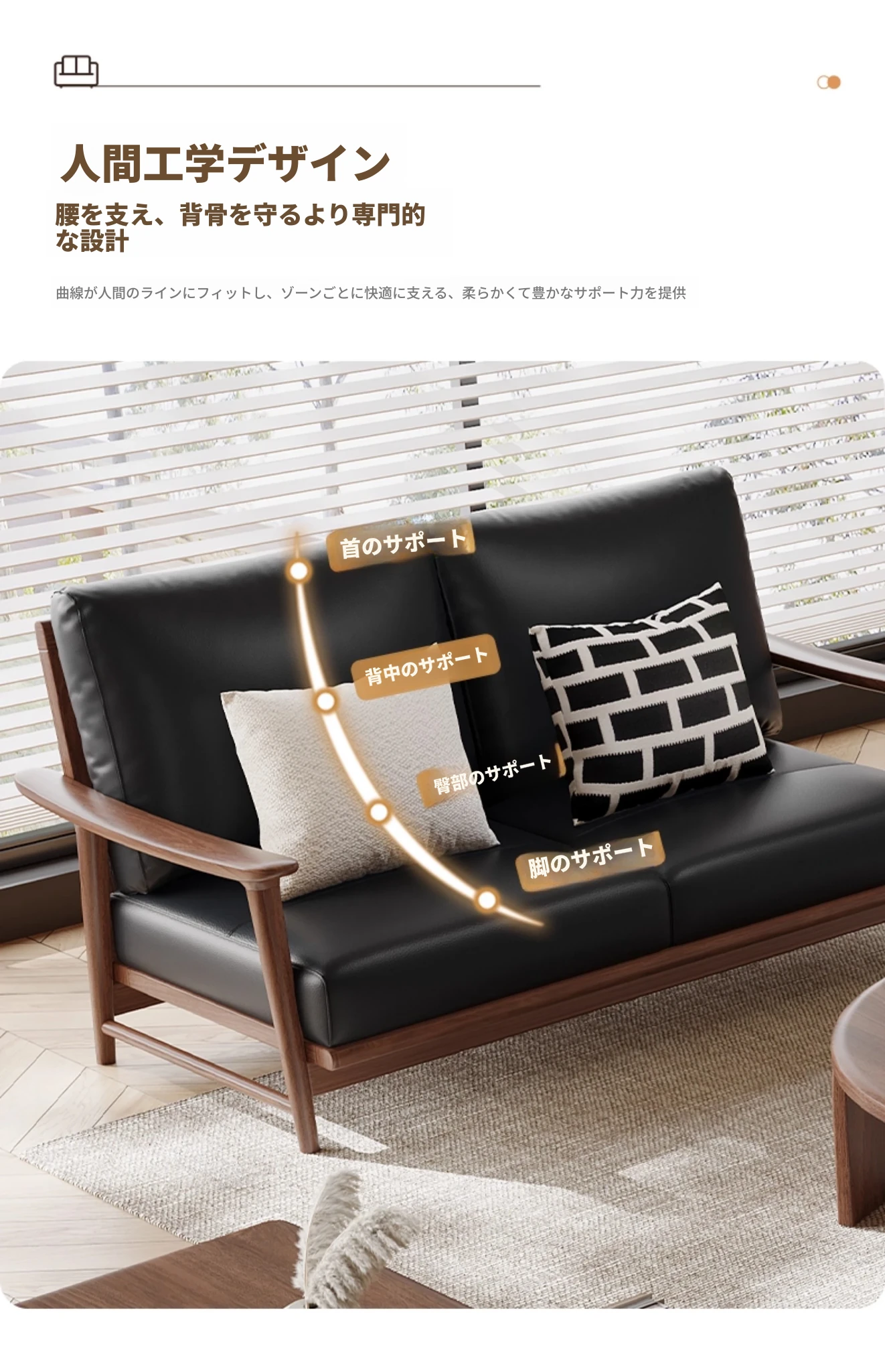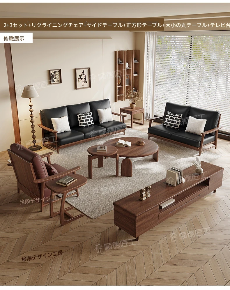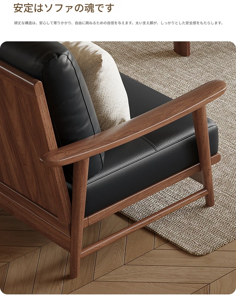 現代的なミニマリストデザイン!ブラックウォールナット無垢材ソファセット - 本革使用で高級感あふれる、大小さまざまなお部屋に最適な禅の雰囲気を持つ中華スタイルのリビング家具。
