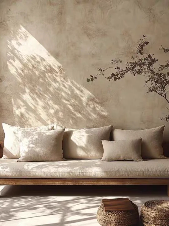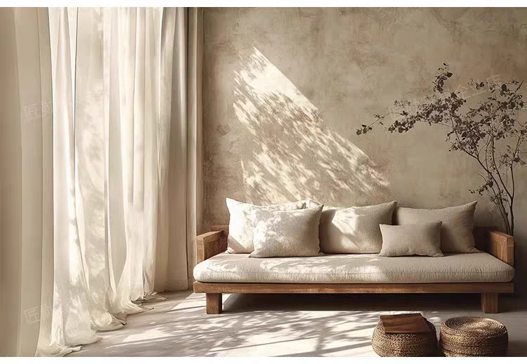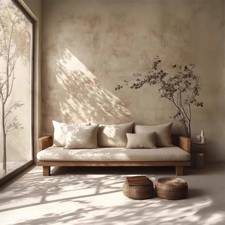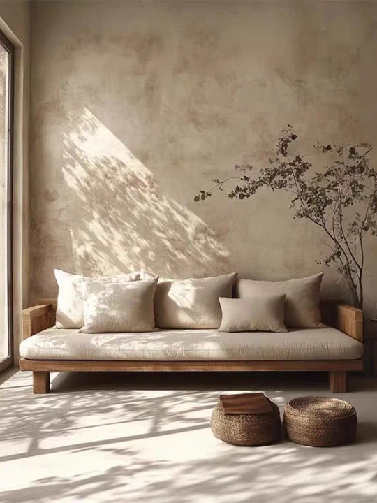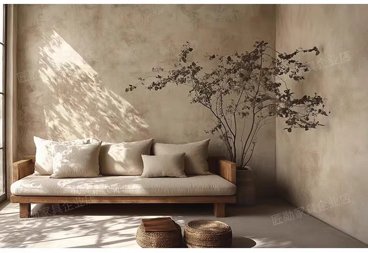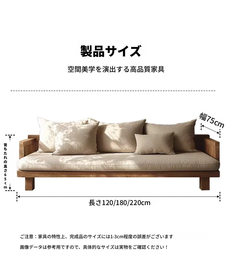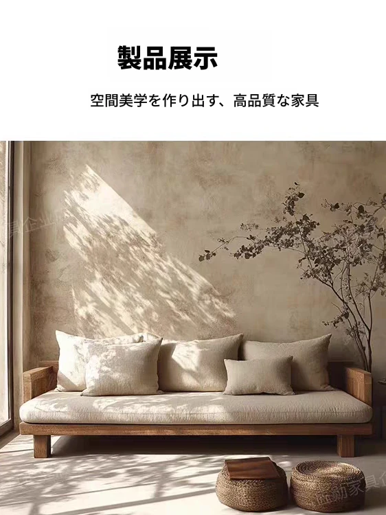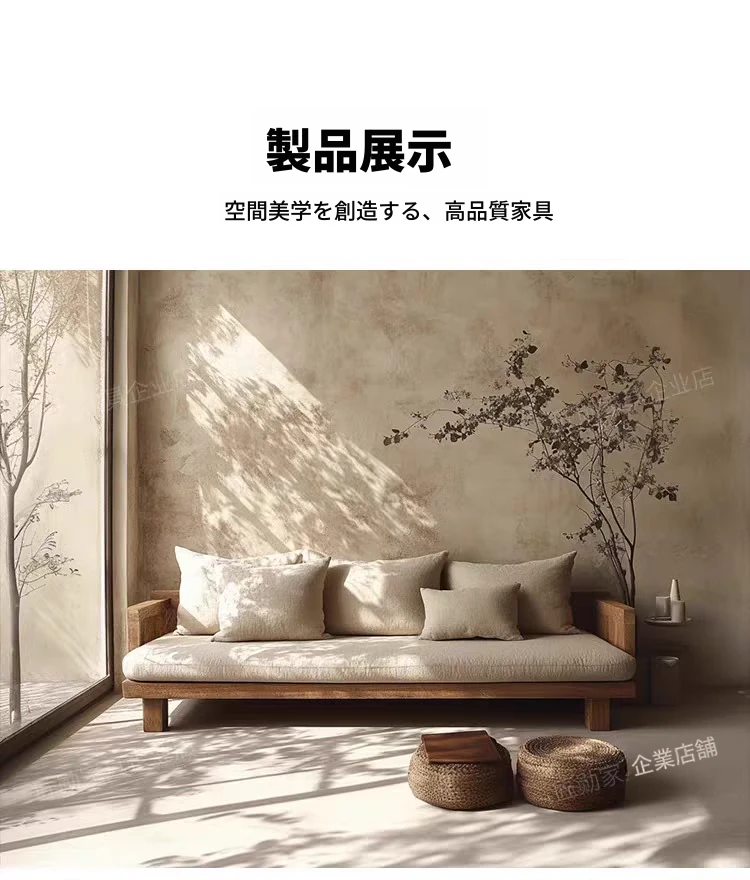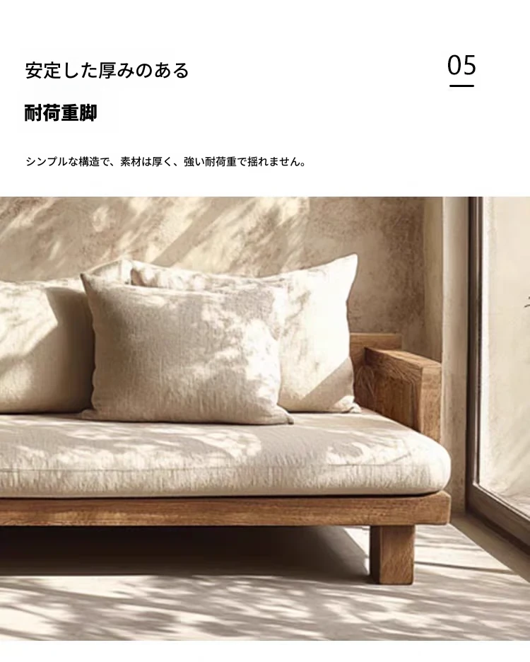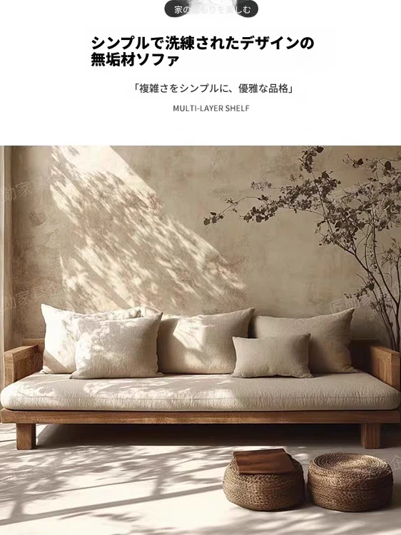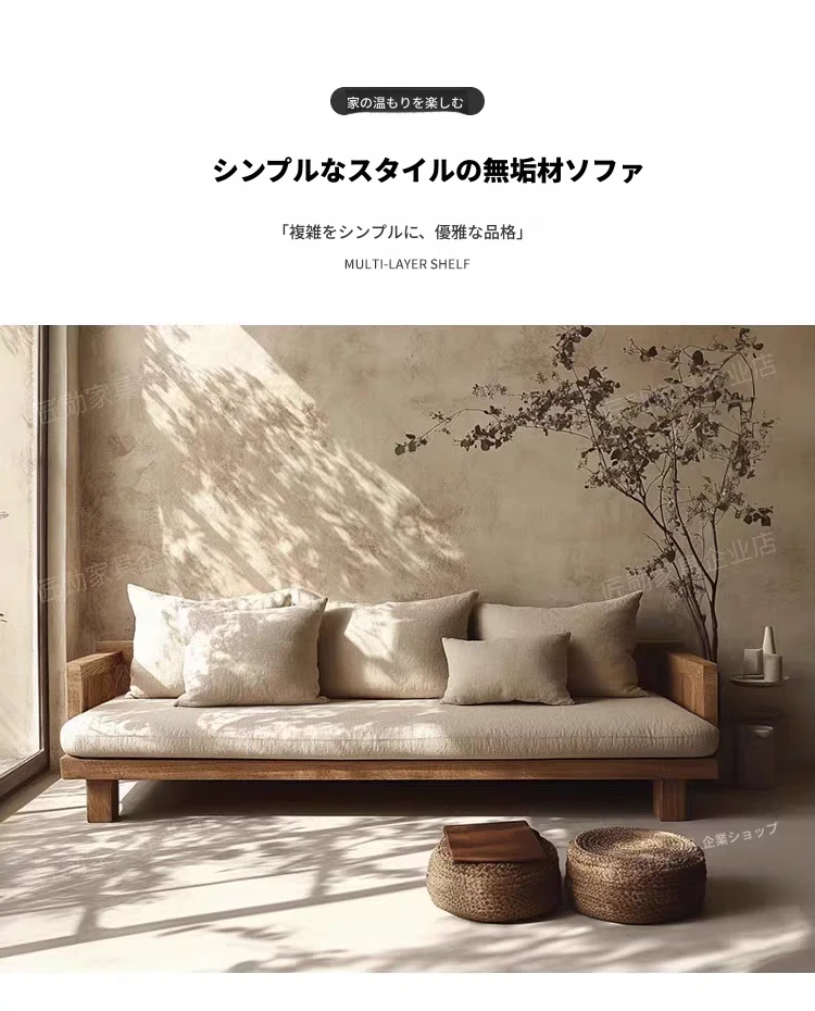 モダンな侘び寂び風の実木ソファ|天然木製の多人数用ソファ|シンプルで洗練された和風リビングにぴったり!心地よいくつろぎを提供します。