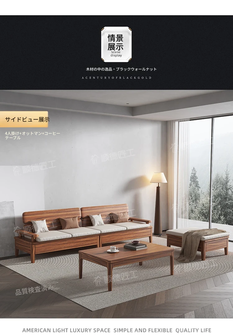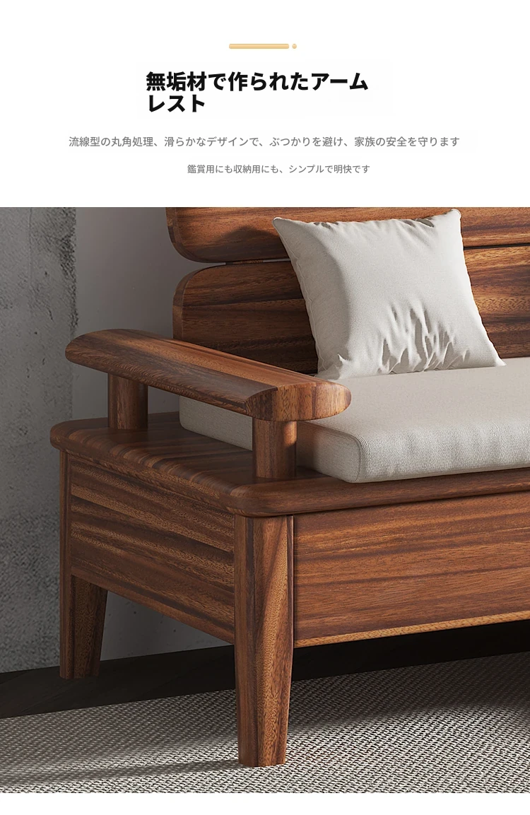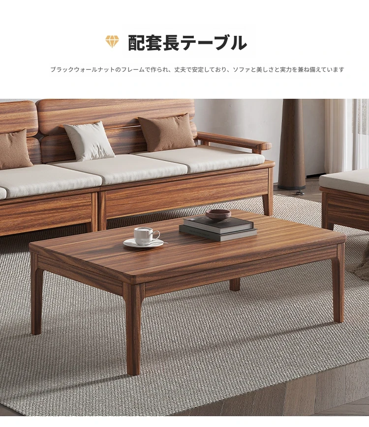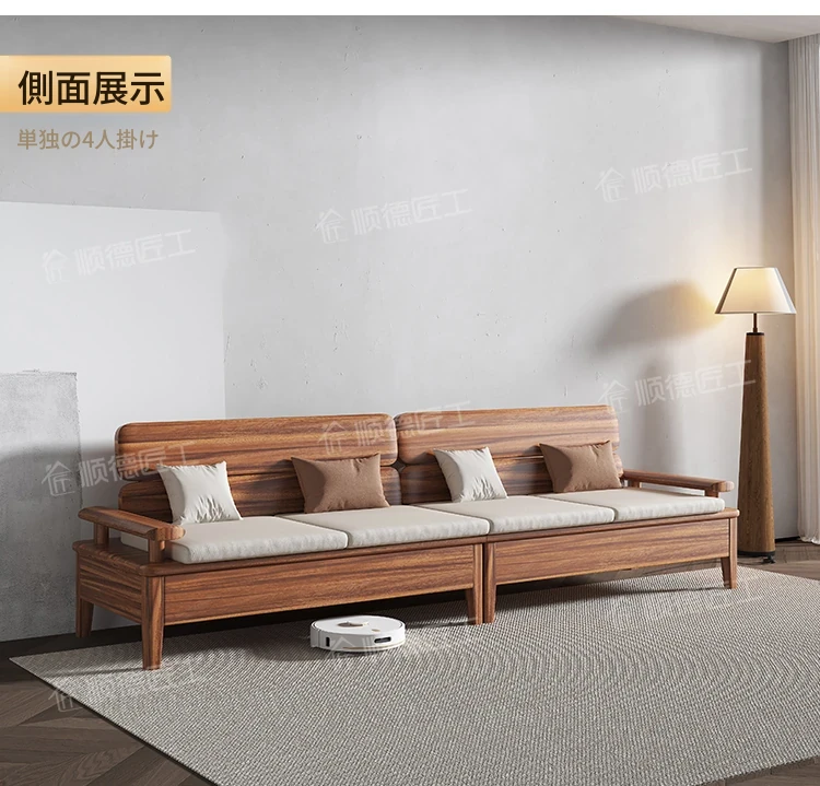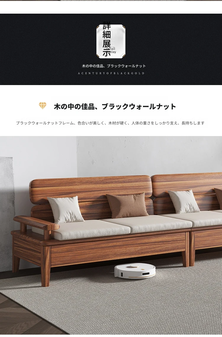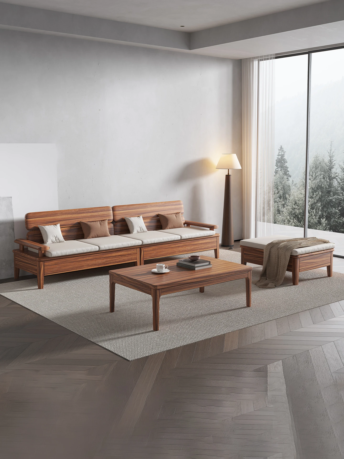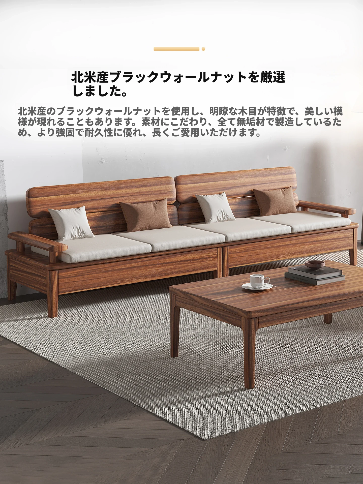新中式デザインのブラックウォールナット無垢材ソファセット - 冬夏両用!小さなリビングにも最適なシンプルでスタイリッシュな木製家具。快適な角型デザインで、あなたの空間をより魅力的に演出します!