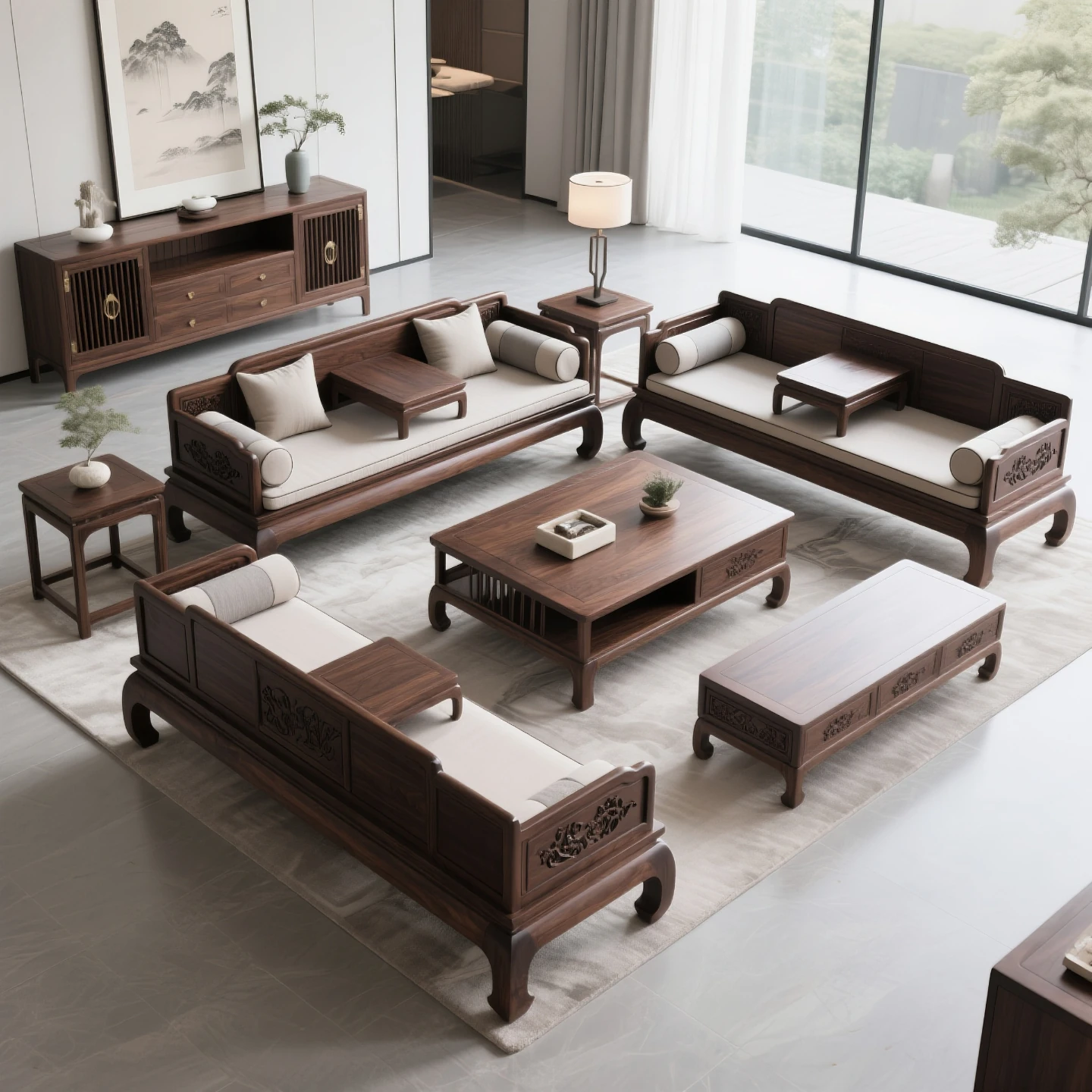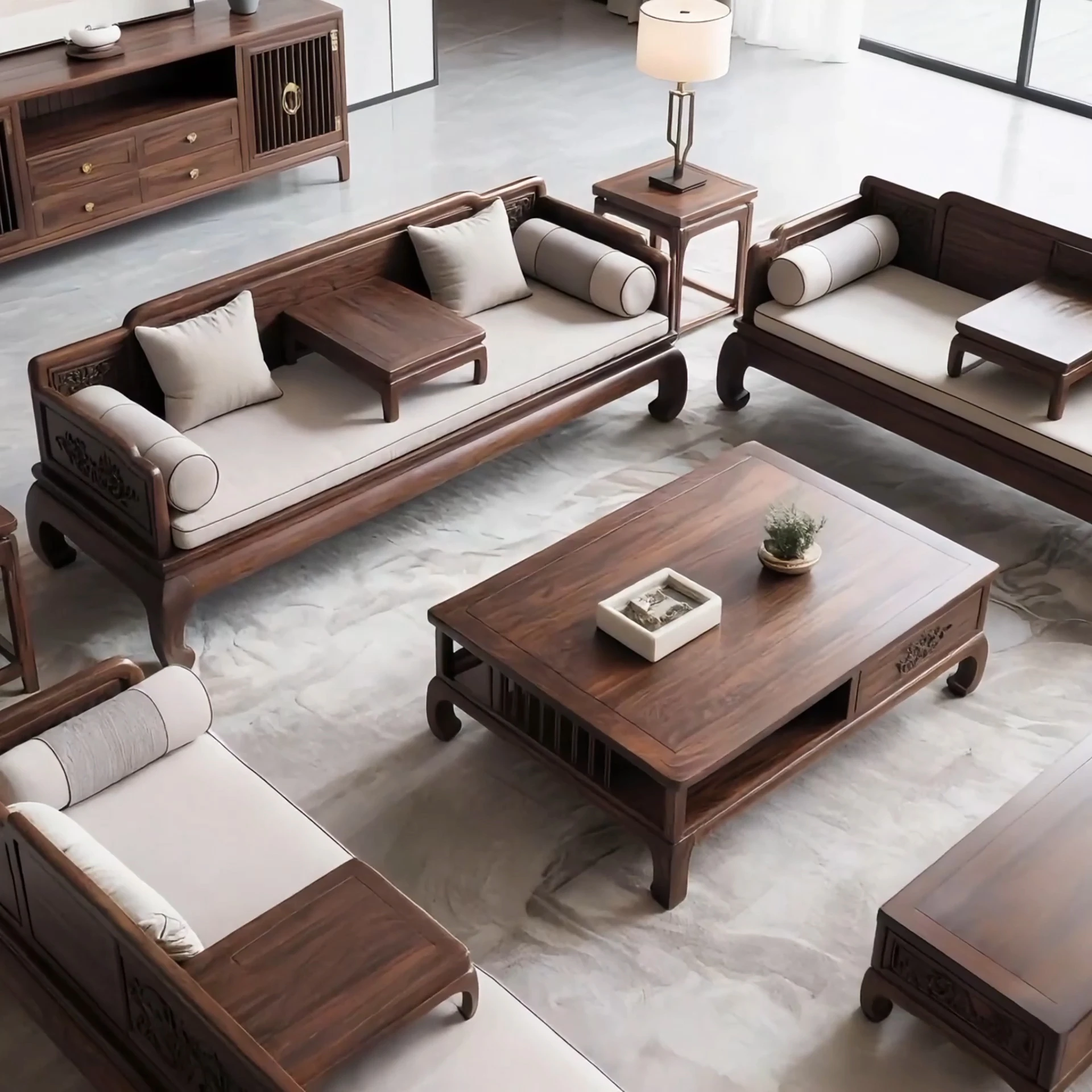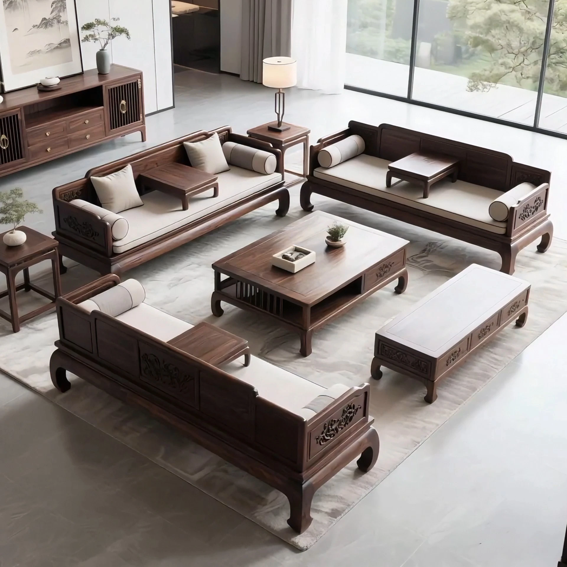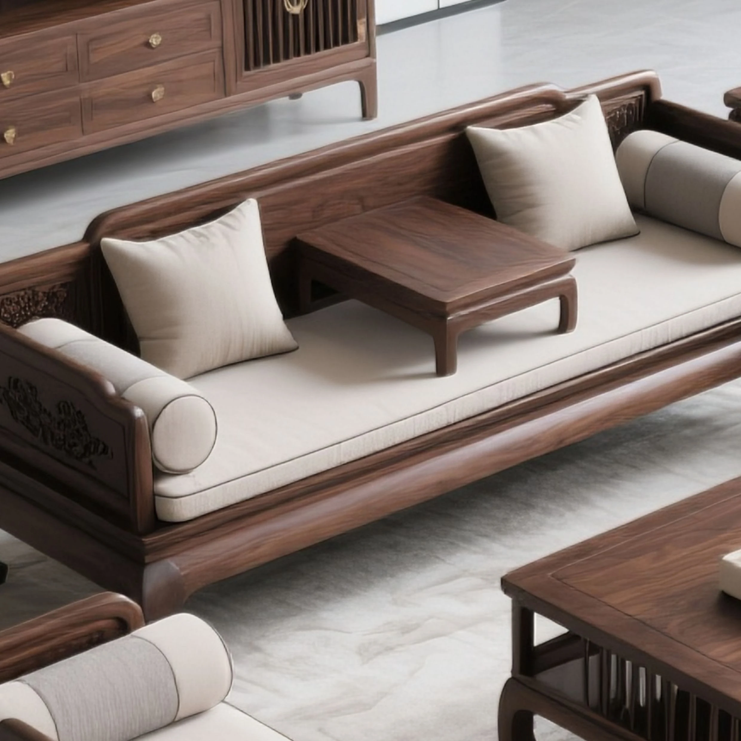 新中式ローハンベッド・コーヒーテーブルセット 北米産ブラックウォールナット無垢材使用 和の美しさと快適さを兼ね備えたサンプルルームや民宿に最適な家具!