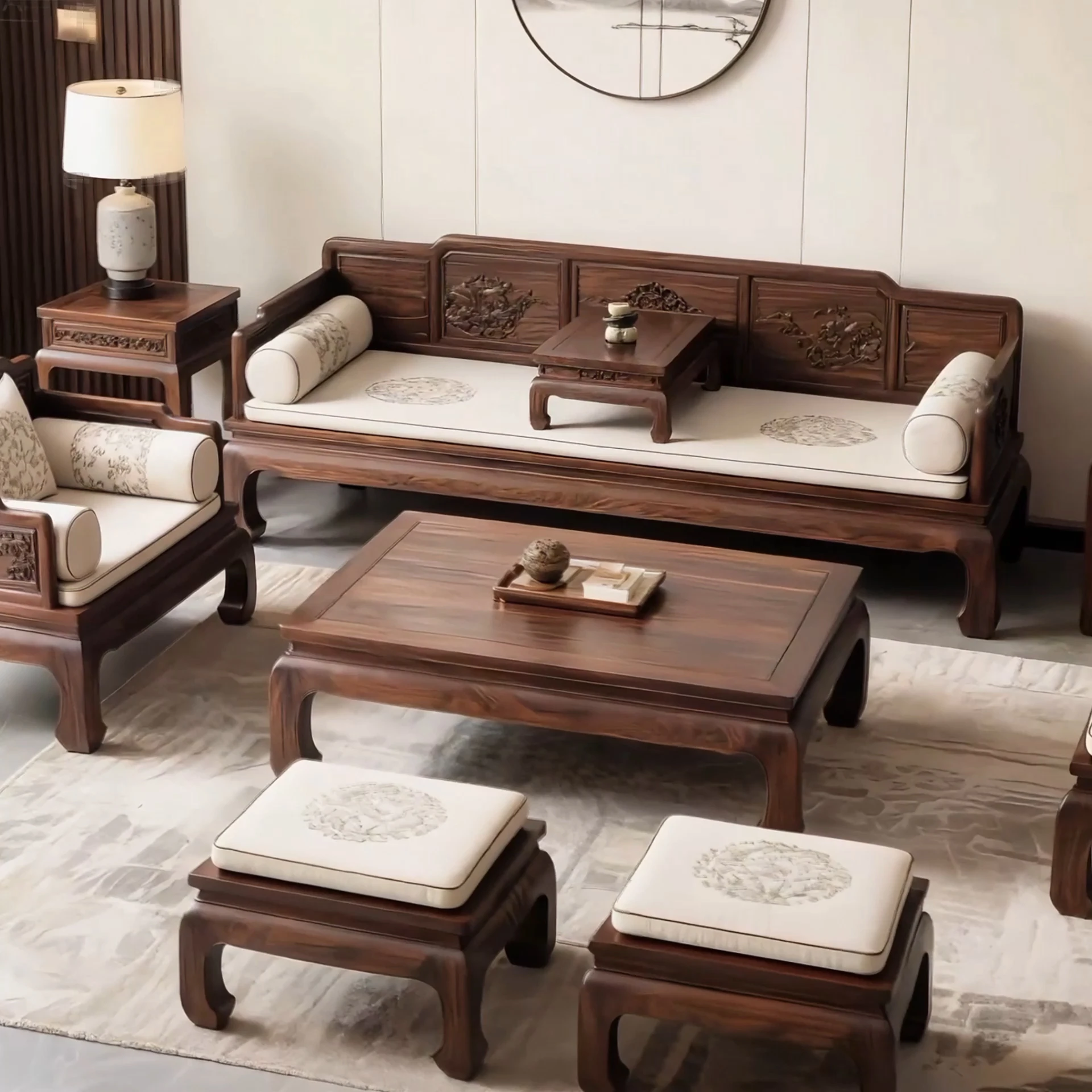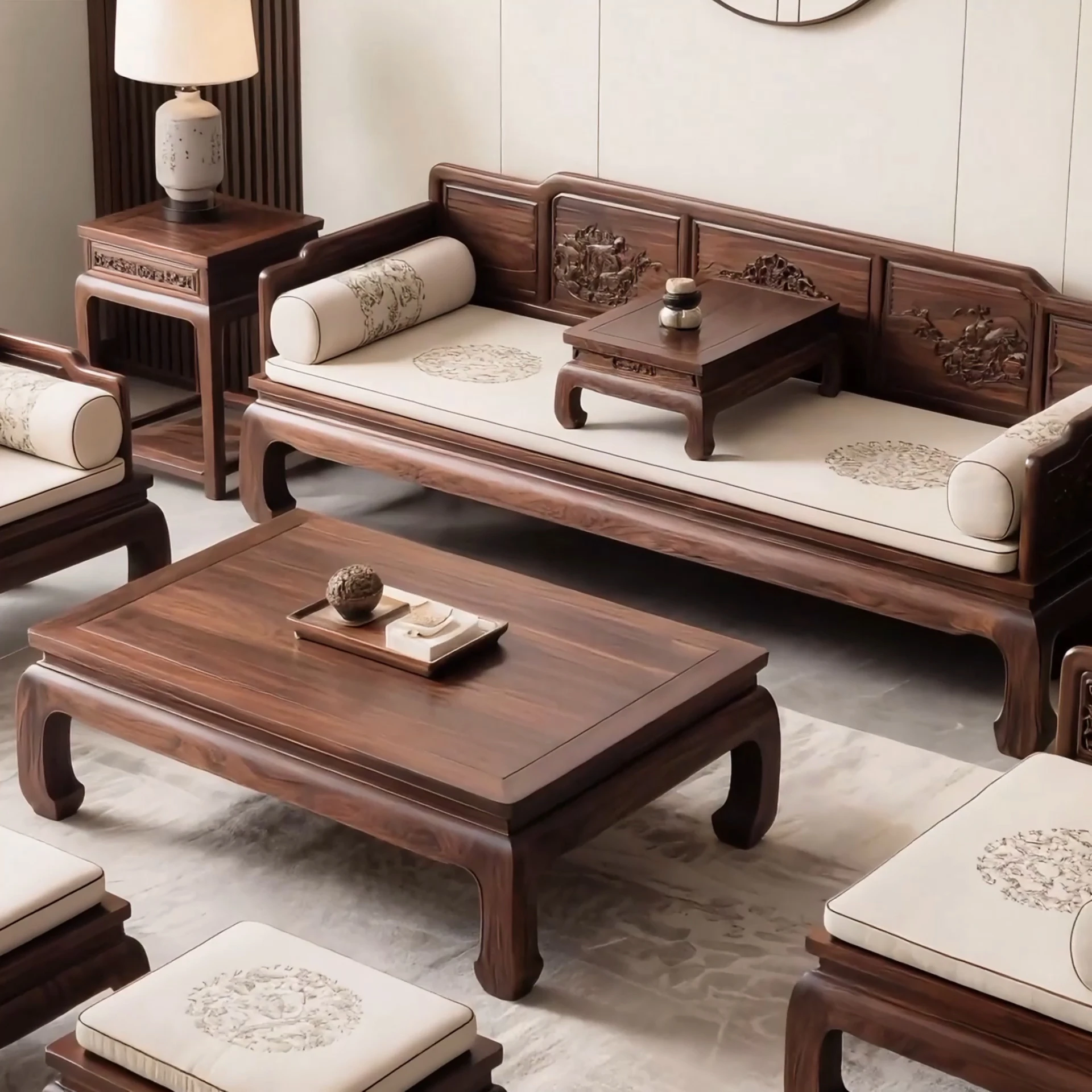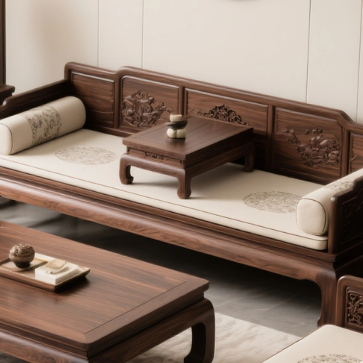 新中式デザインの北米産ブラックウォールナット製、ロハンベッドと実木ソファ、ティーテーブルのセット。宋氏風の別荘スタイルにぴったりの家具で、優雅な空間を演出します。