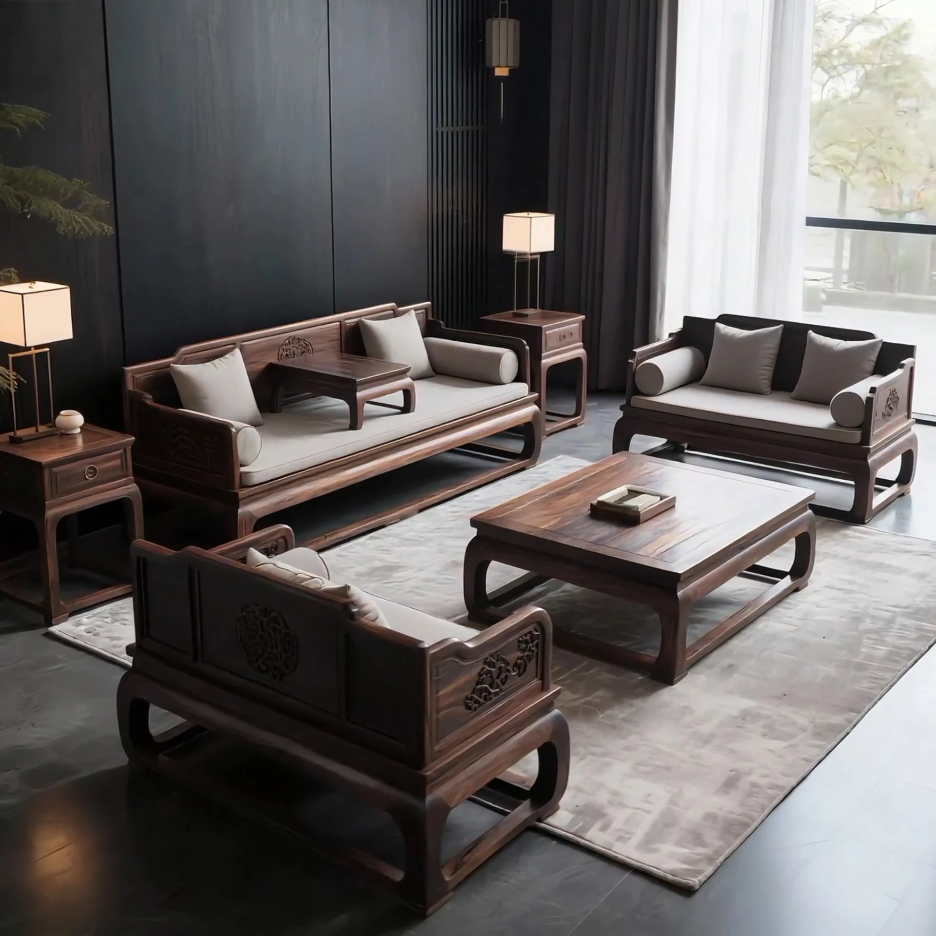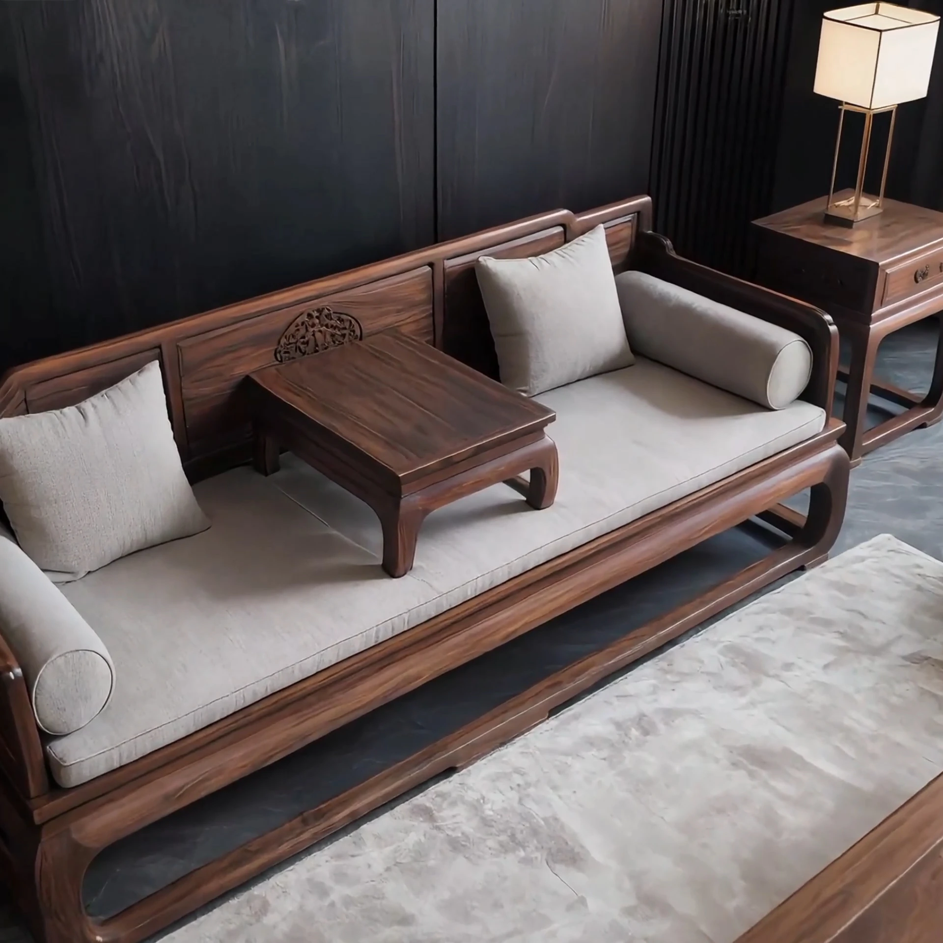 新中式ロハンベッドとコーヒーテーブルのセット - 北米産ブラックウォールナット無垢材使用、スタイリッシュなデザインのソファベッド。モデルルームや民宿にぴったりの高級家具!