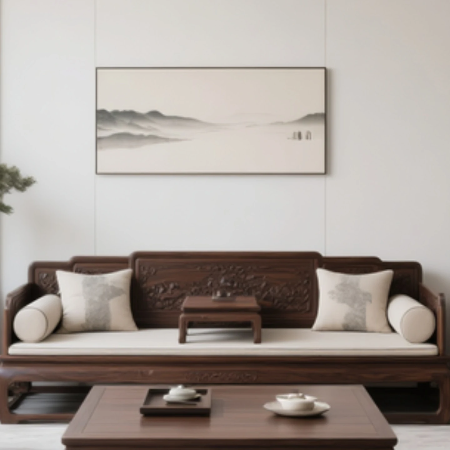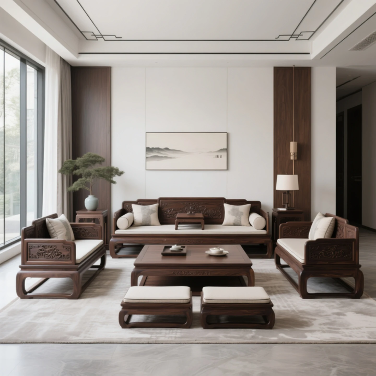 新中式デザインの無垢材ローハンベッド&テーブルセット、北米産ブラックウォールナット使用。大小様々な部屋にピッタリな、おしゃれで機能的な茶室の必需品!