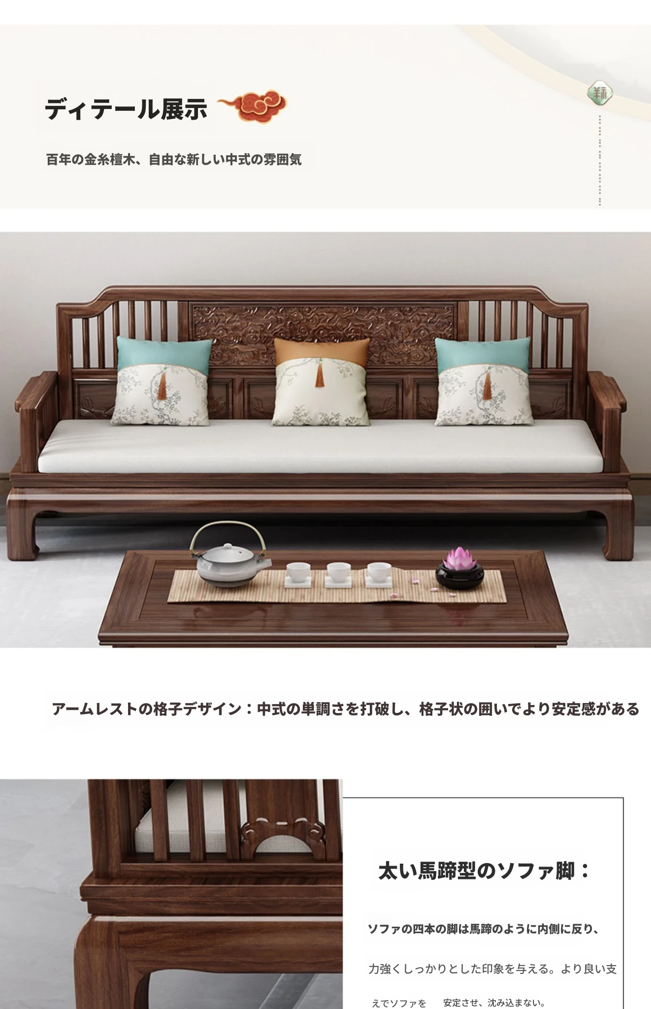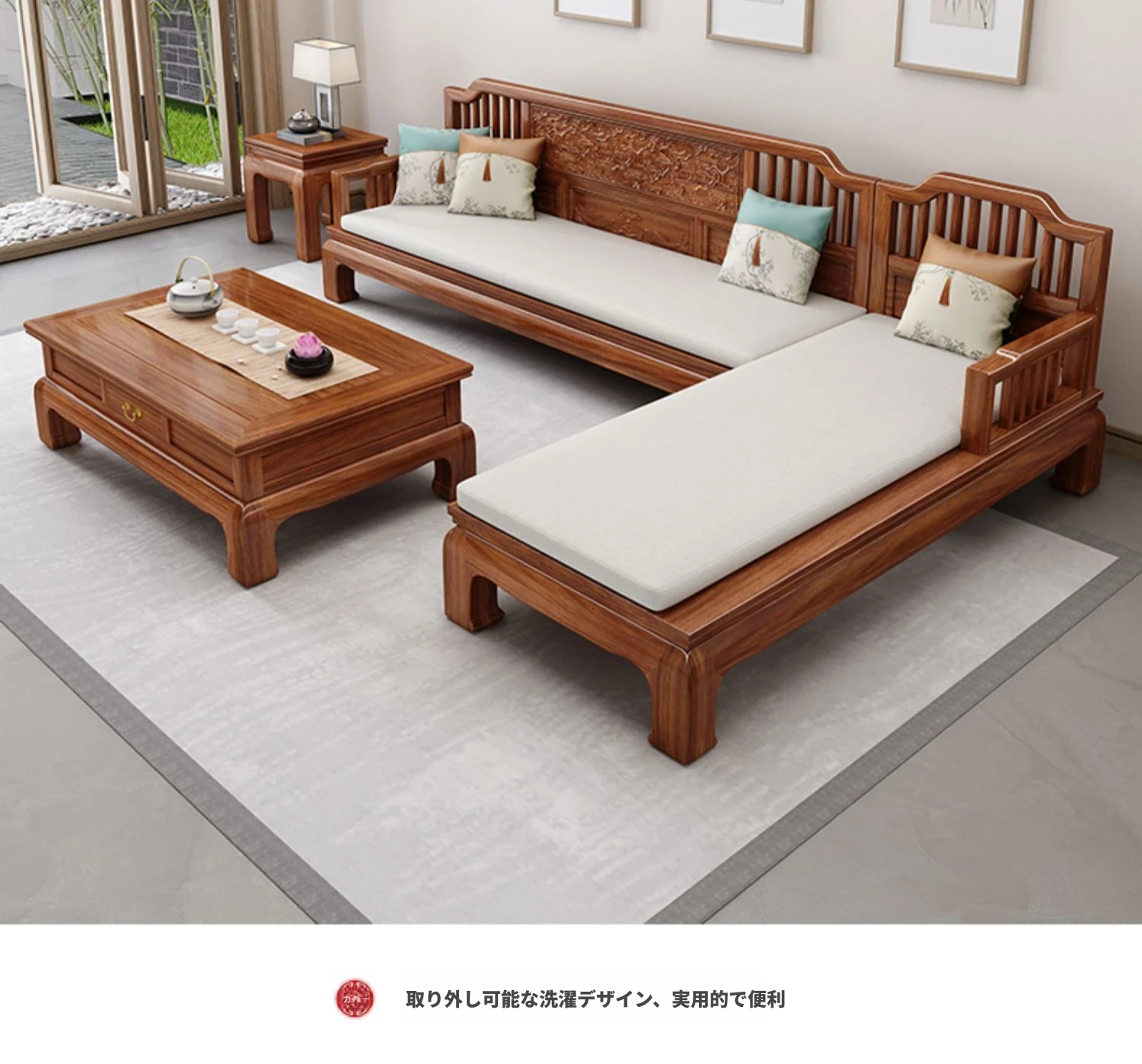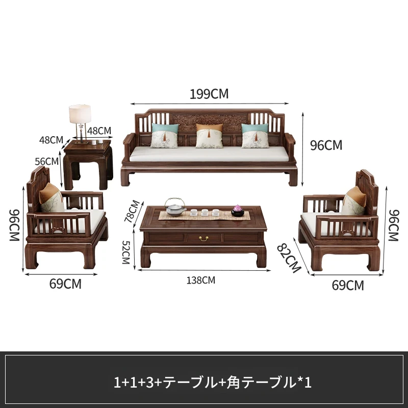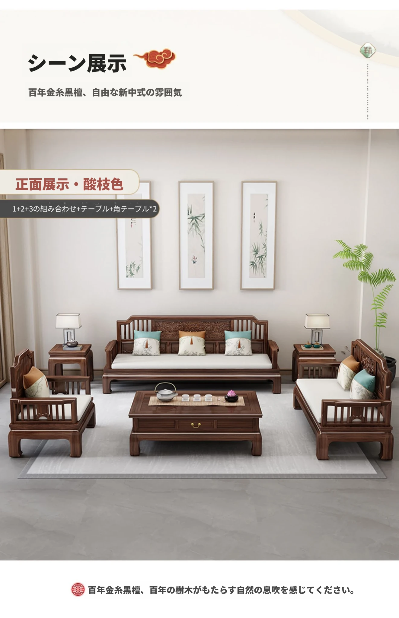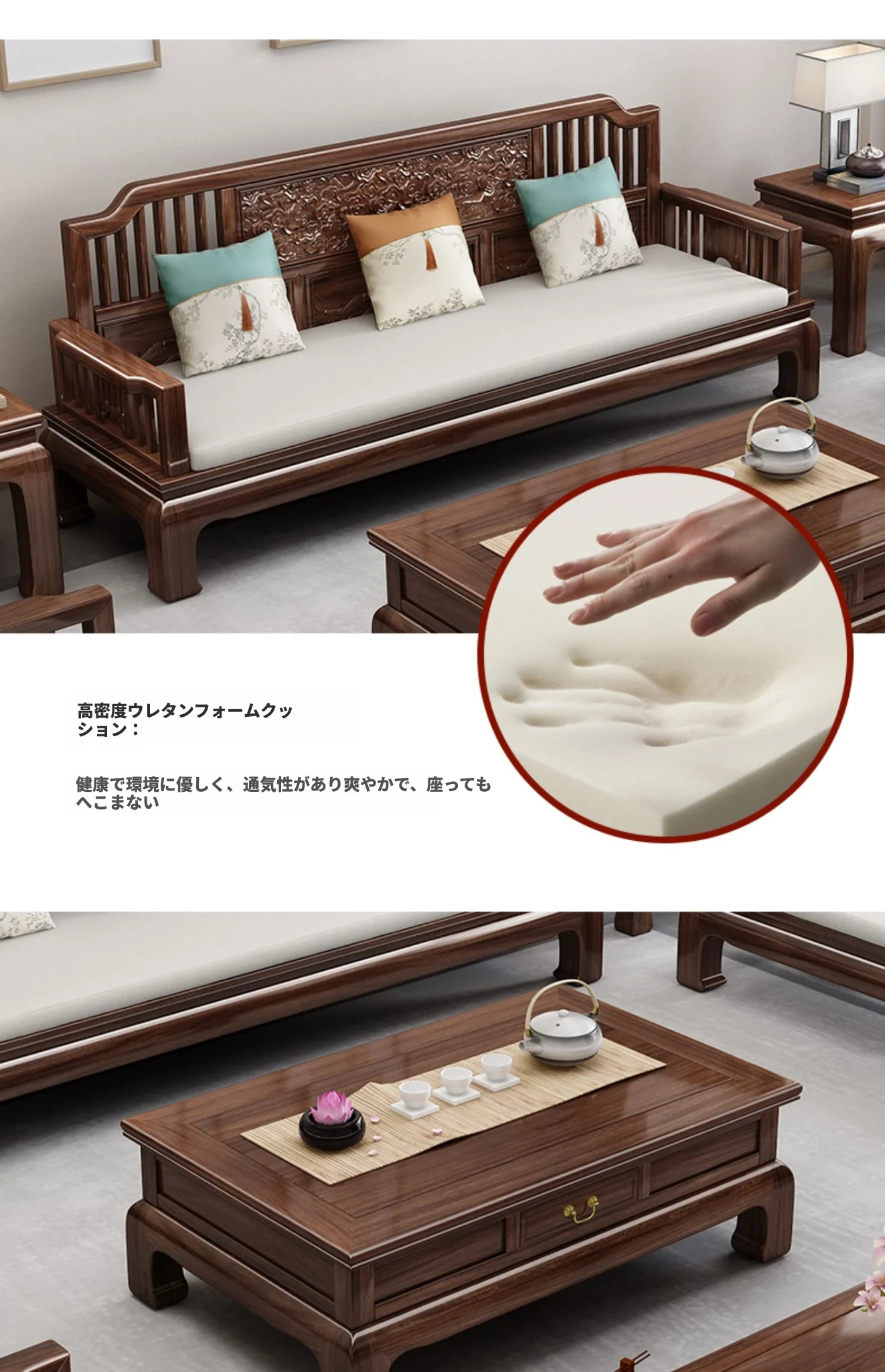 新中式デザインの無垢材ソファセット1+2+3、冬夏兼用の禅風彫刻が施されたシンプルなスタイル、小型リビングに最適な家具です。心落ち着く空間を演出し、洗練されたライフスタイルを提案します。
