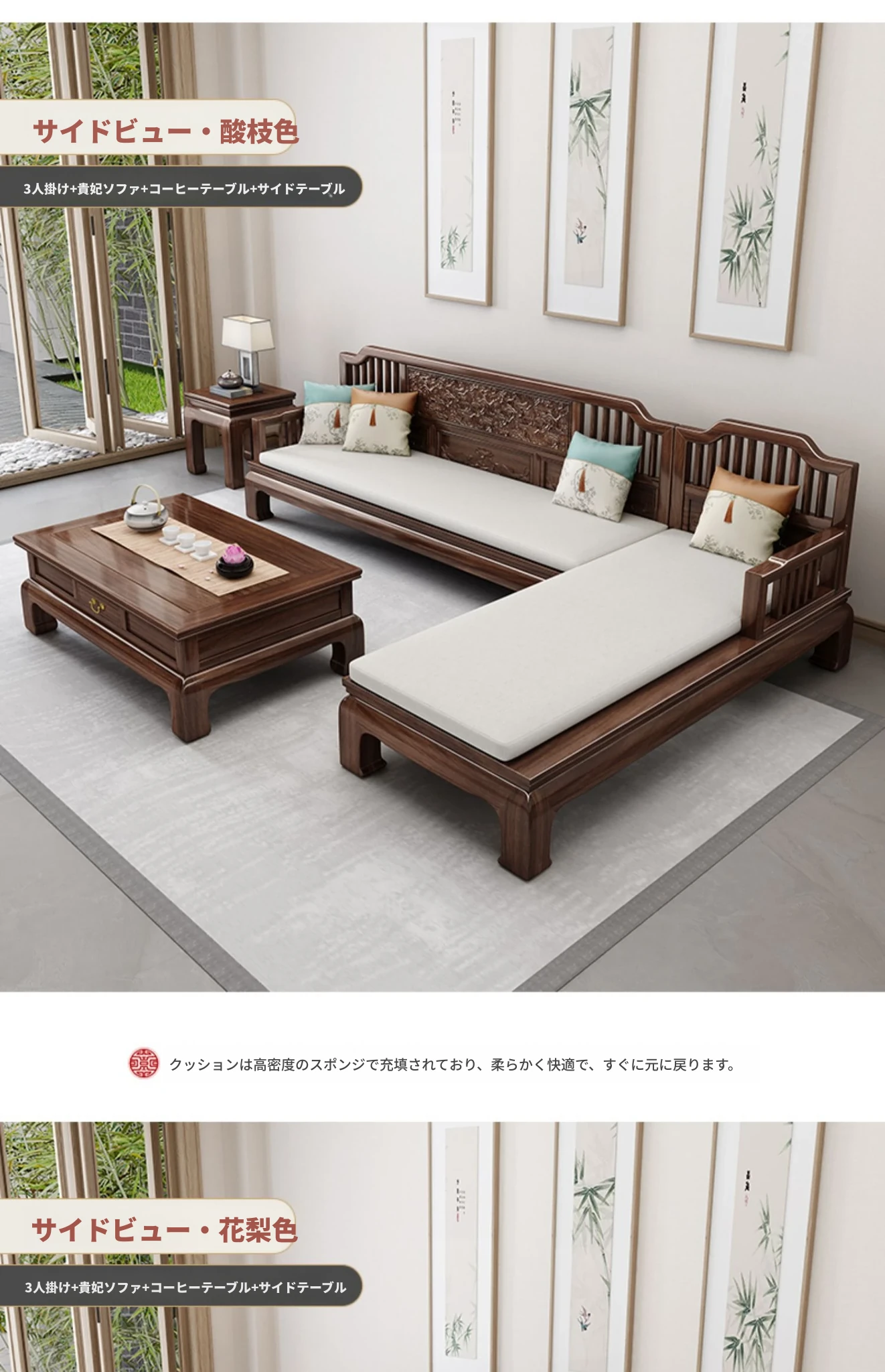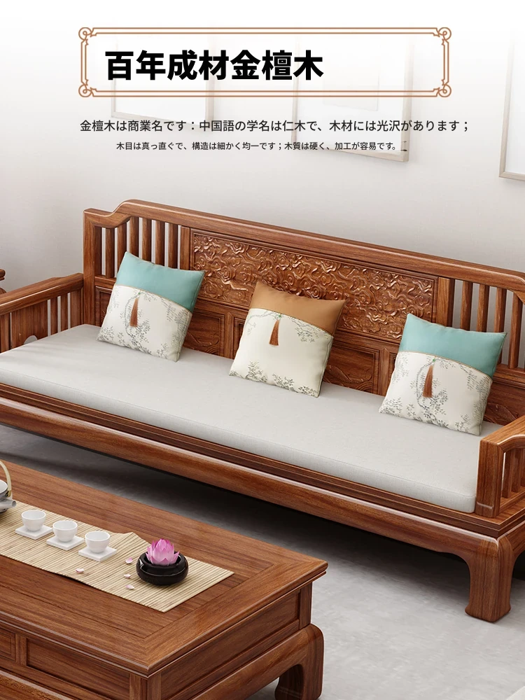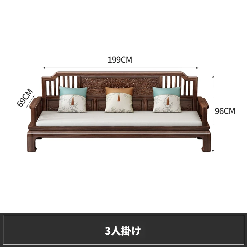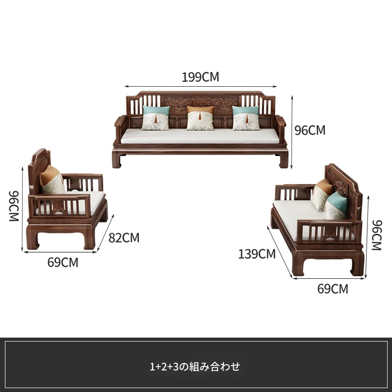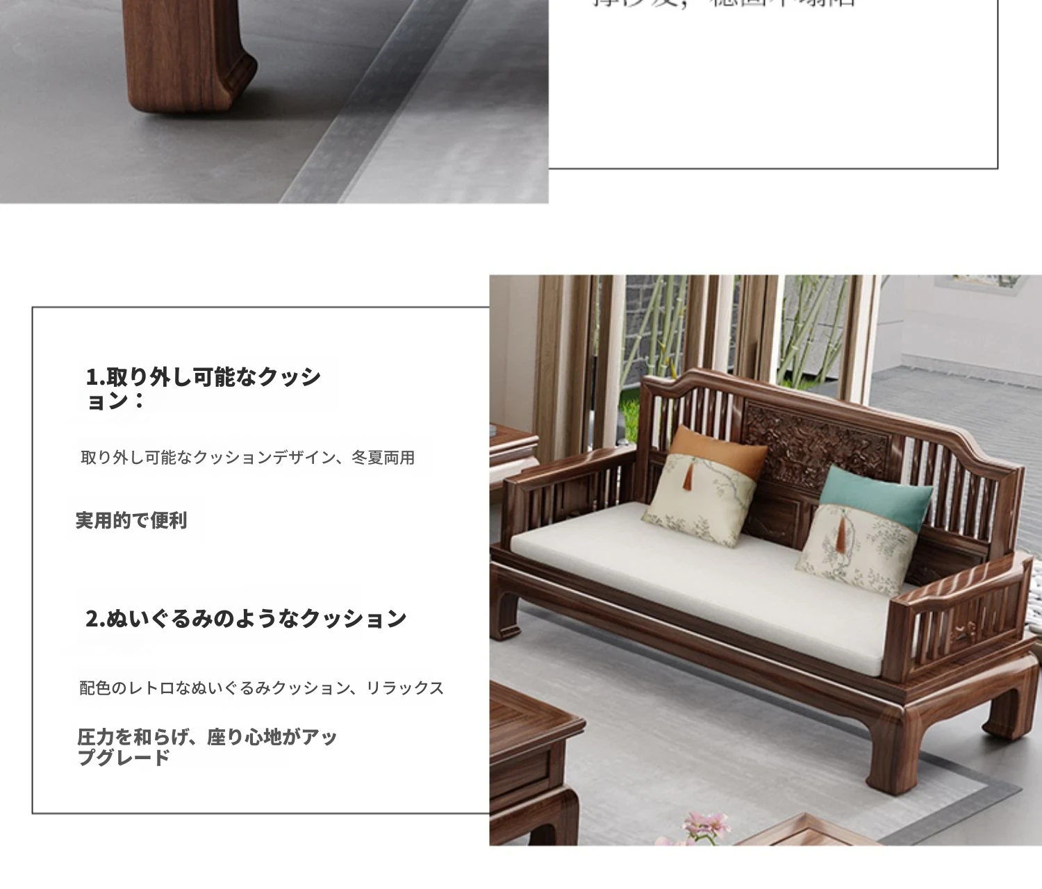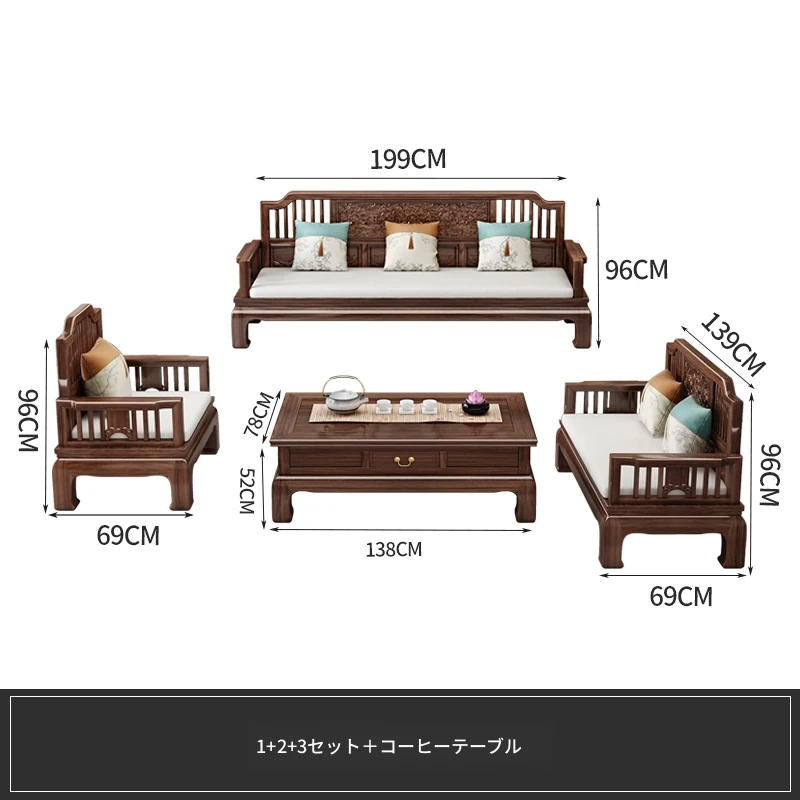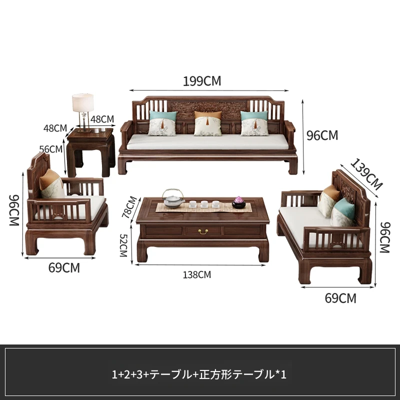 新中式デザインの無垢材ソファセット1+2+3、冬夏兼用の禅風彫刻が施されたシンプルなスタイル、小型リビングに最適な家具です。心落ち着く空間を演出し、洗練されたライフスタイルを提案します。