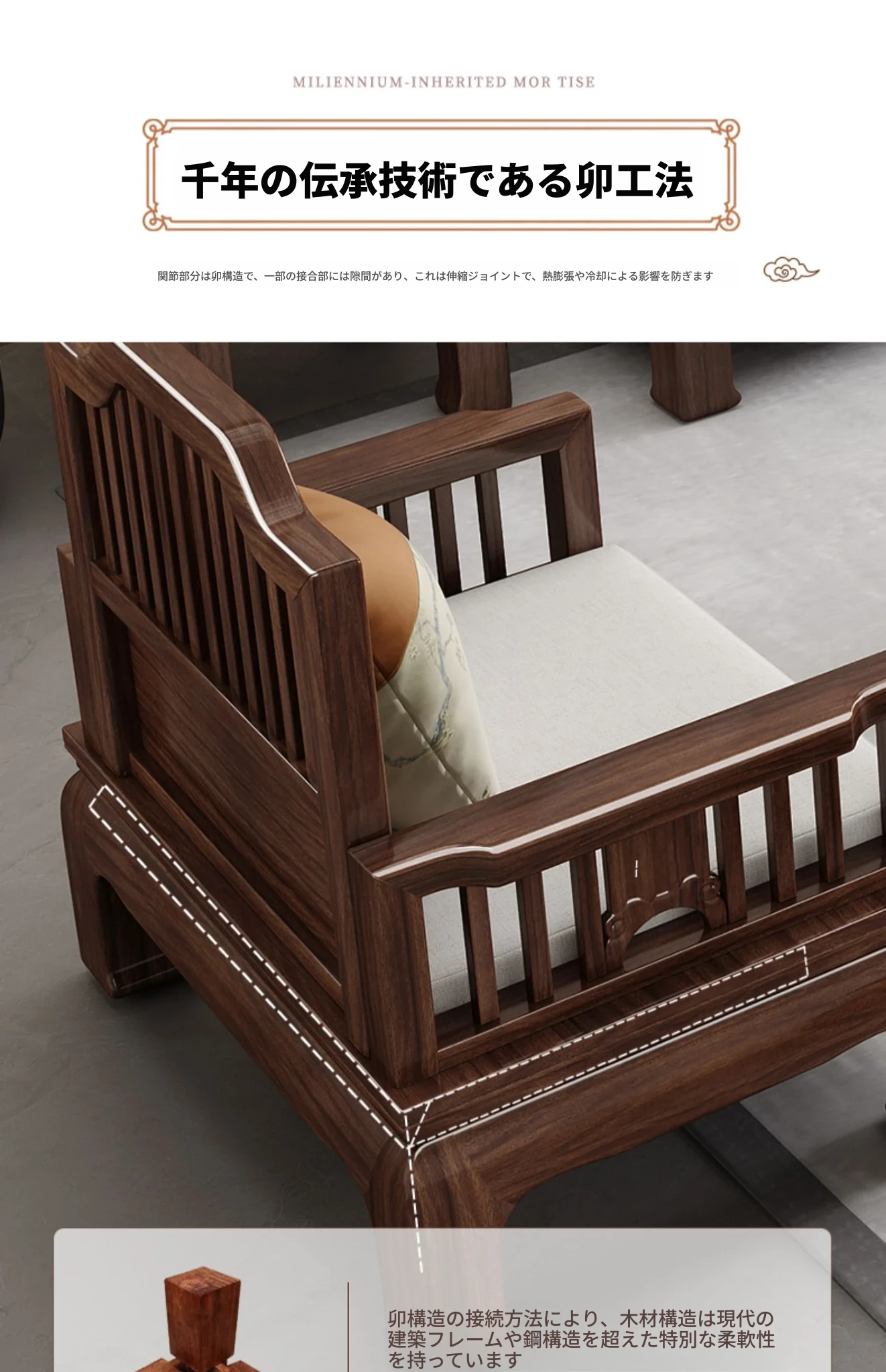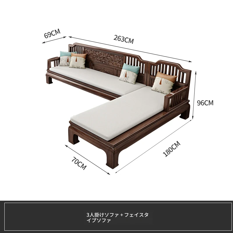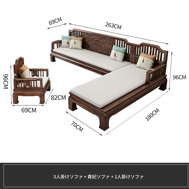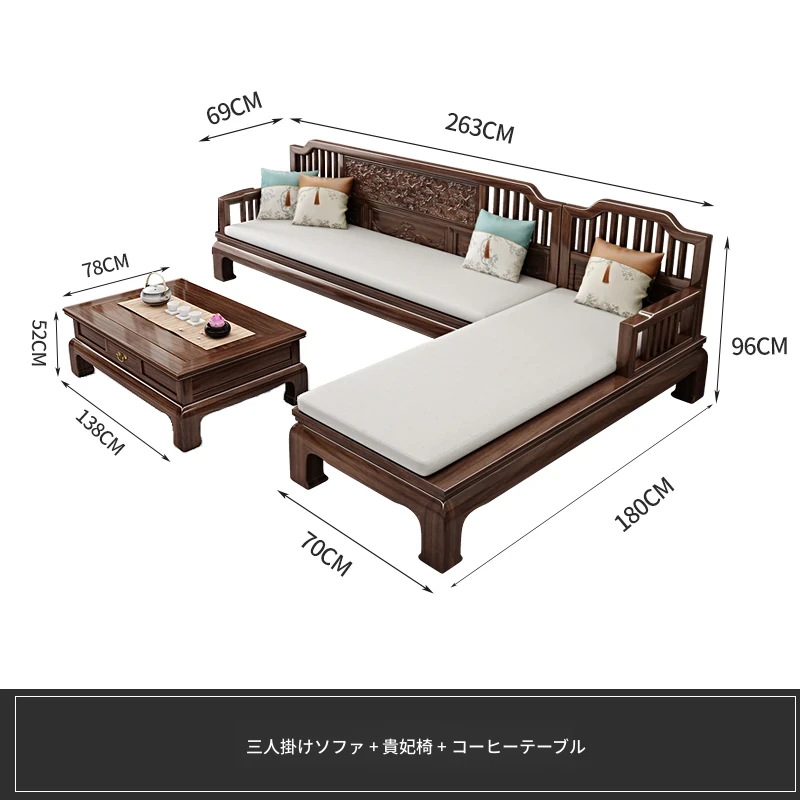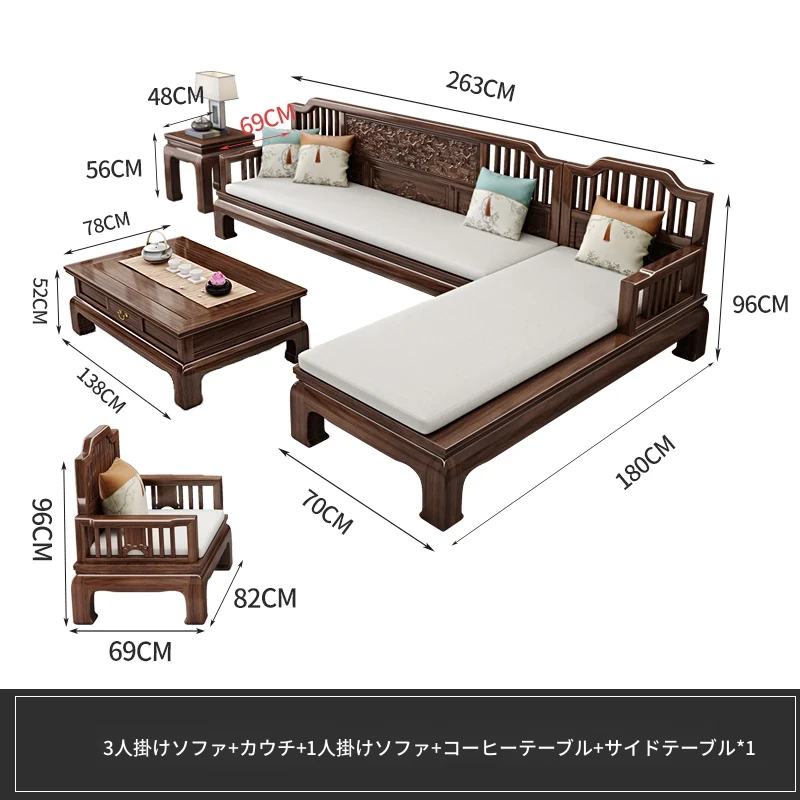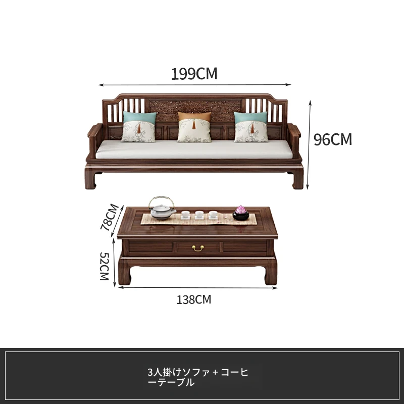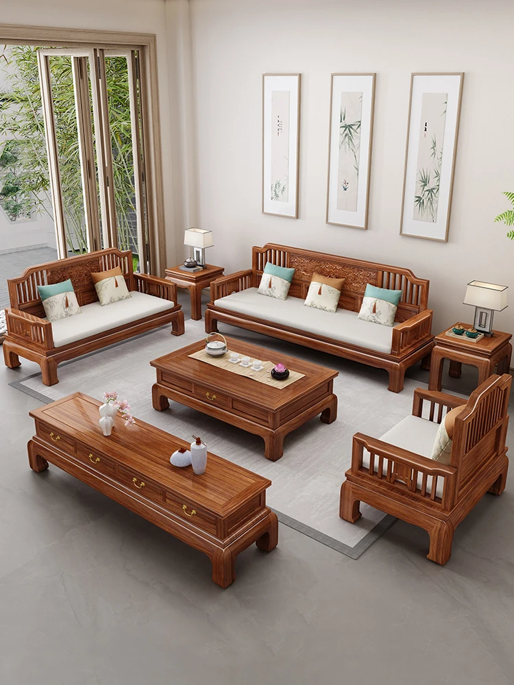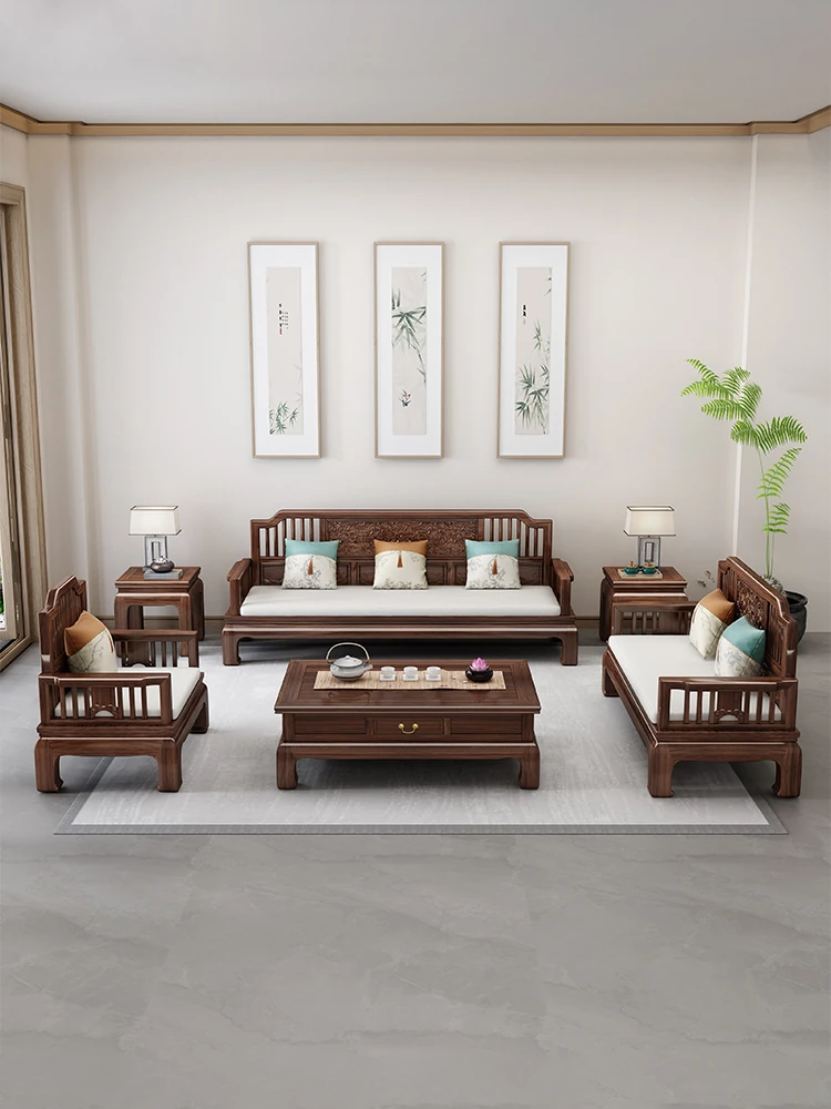 新中式デザインの無垢材ソファセット1+2+3、冬夏兼用の禅風彫刻が施されたシンプルなスタイル、小型リビングに最適な家具です。心落ち着く空間を演出し、洗練されたライフスタイルを提案します。