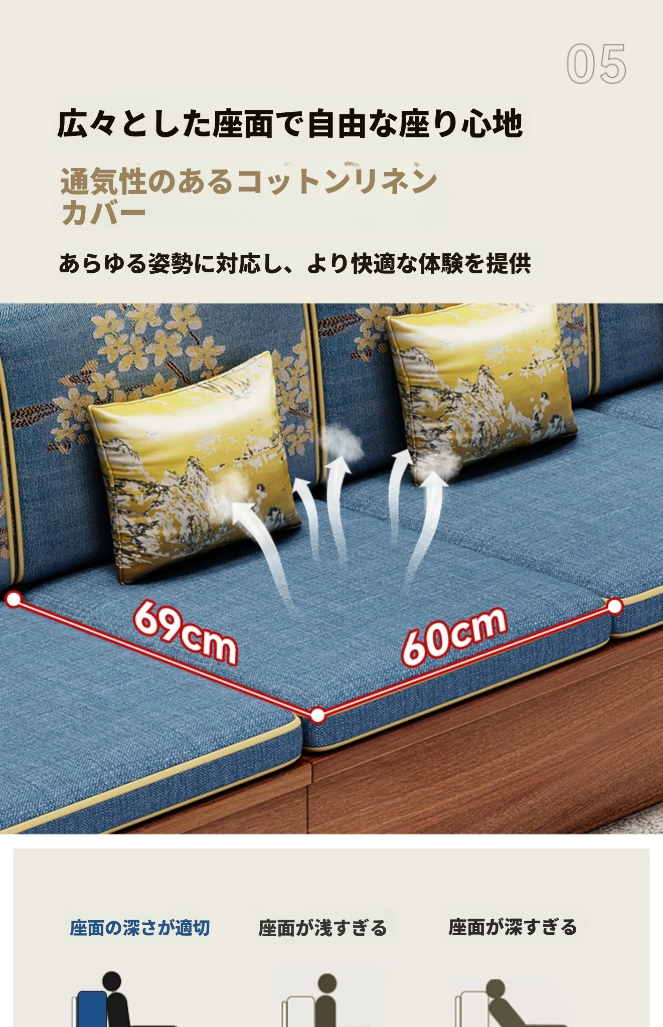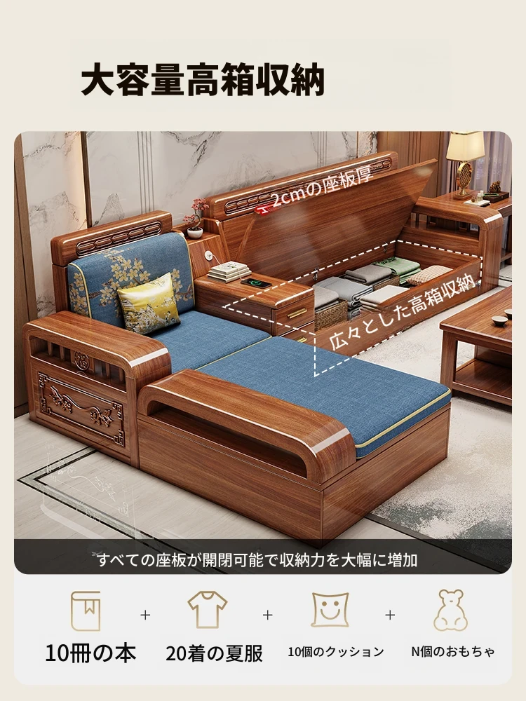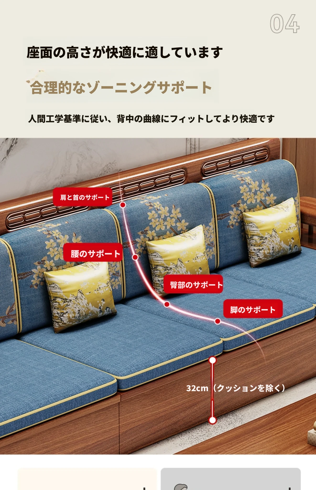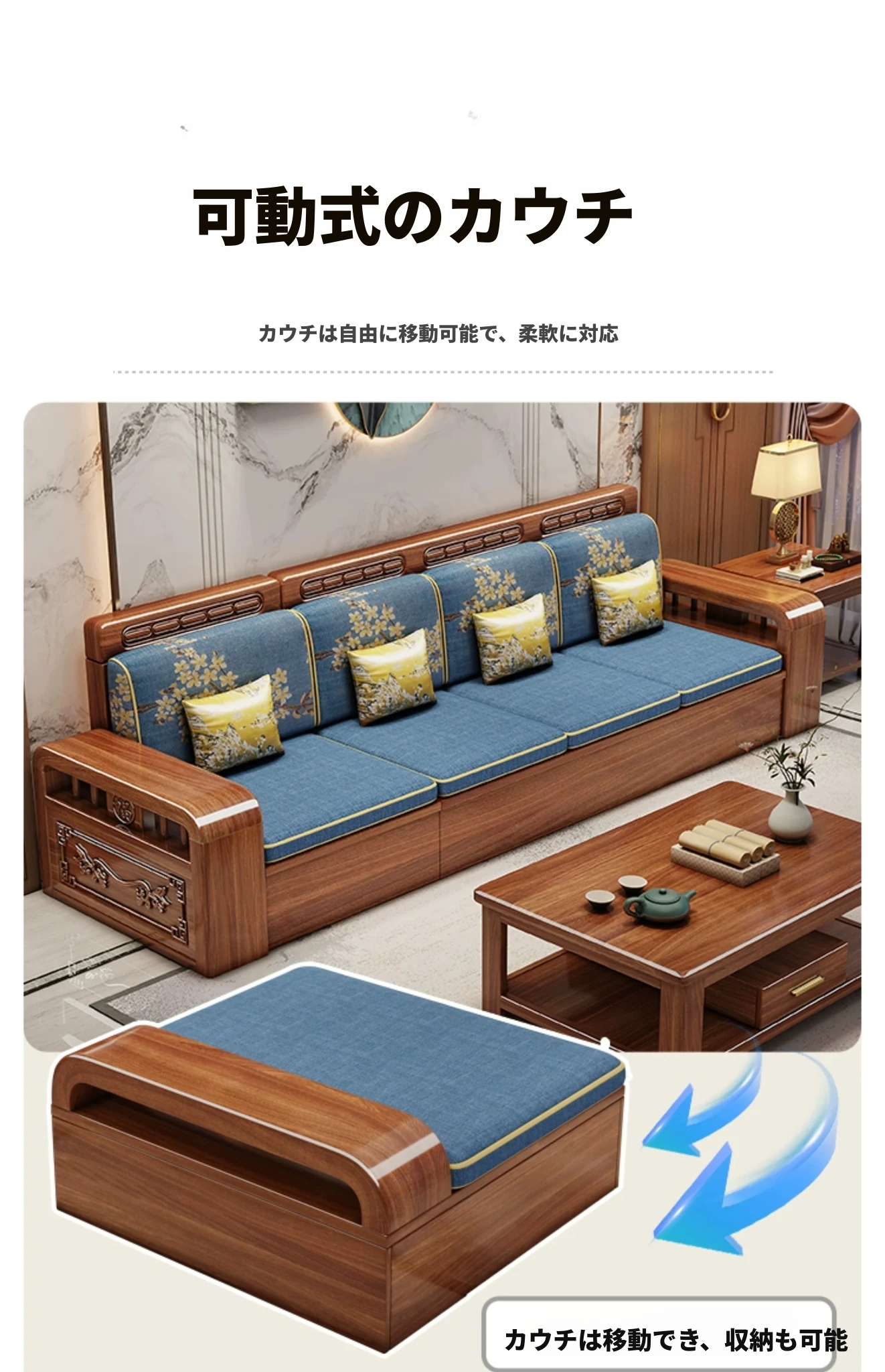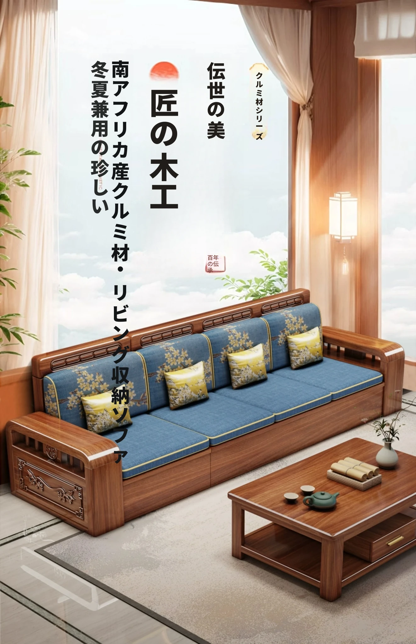 新中式デザインの実木4人掛けソファ - 小型スペースに最適!収納付きでスタイリッシュなリビングを演出する2025年新作家具。快適な座り心地と洗練されたデザインをお楽しみください!