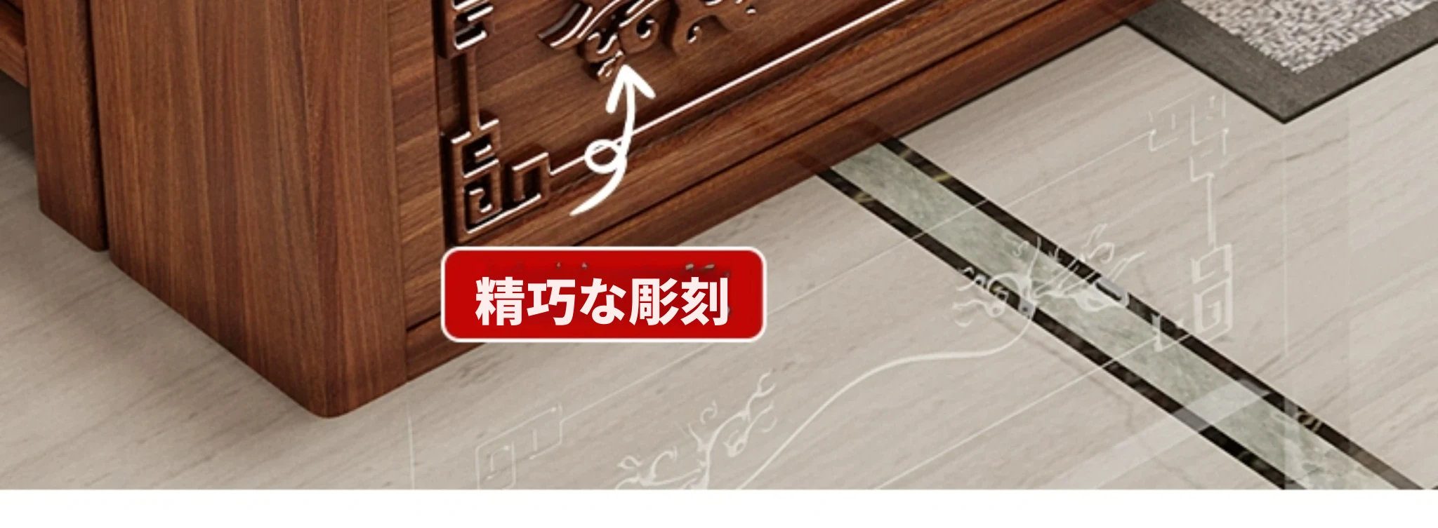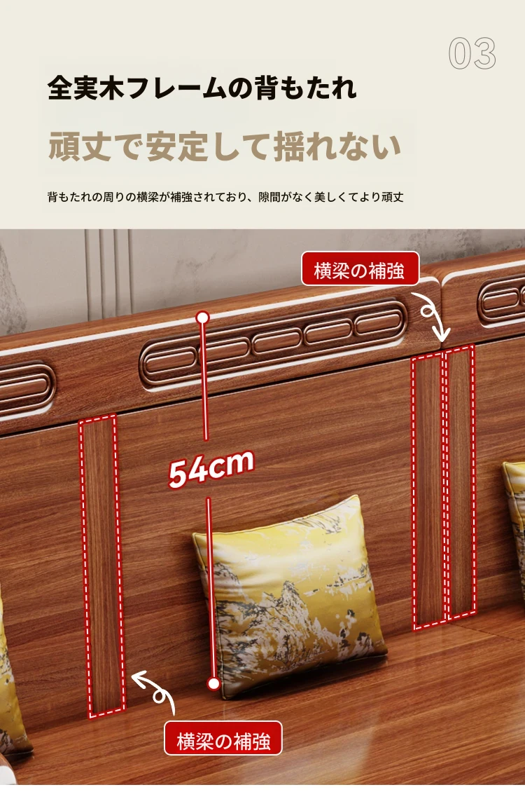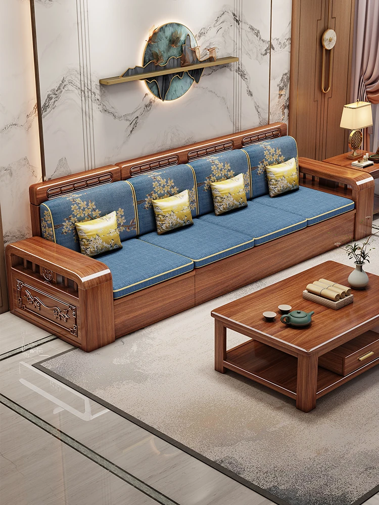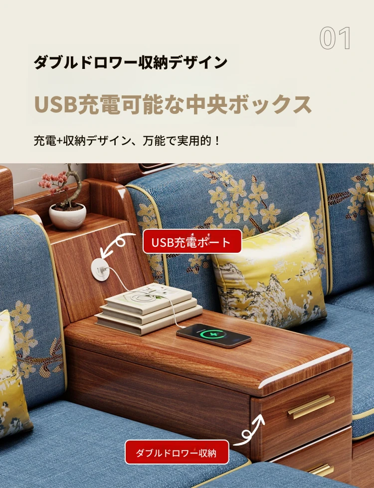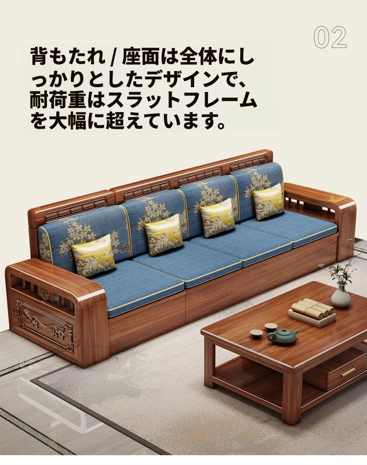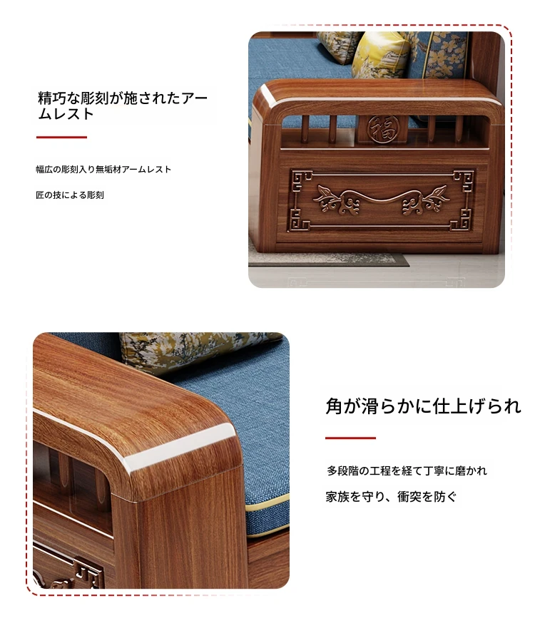 新中式デザインの実木4人掛けソファ - 小型スペースに最適!収納付きでスタイリッシュなリビングを演出する2025年新作家具。快適な座り心地と洗練されたデザインをお楽しみください!