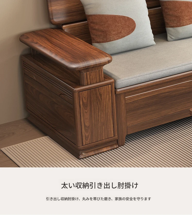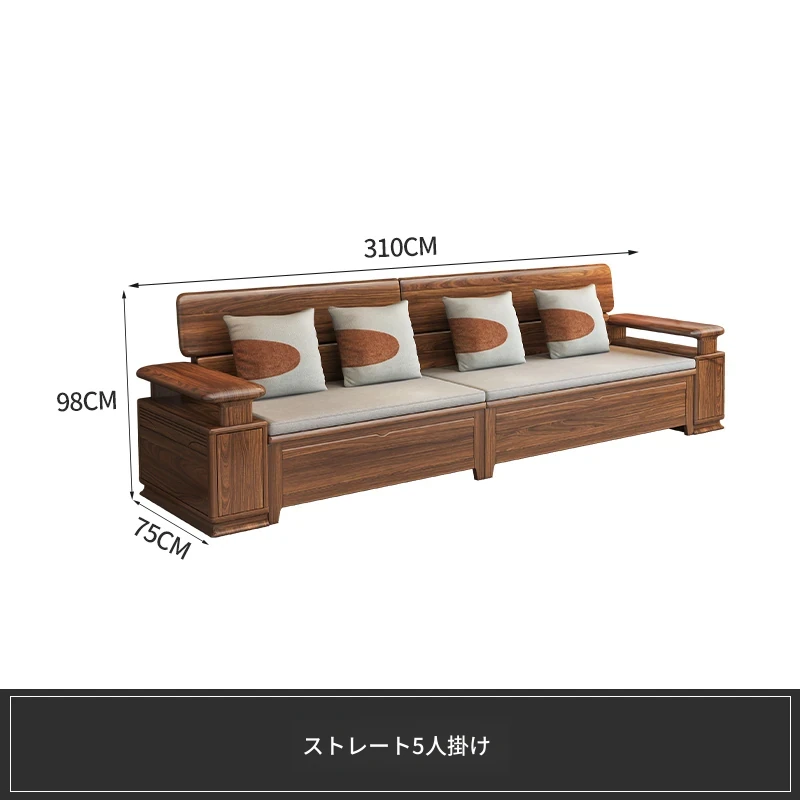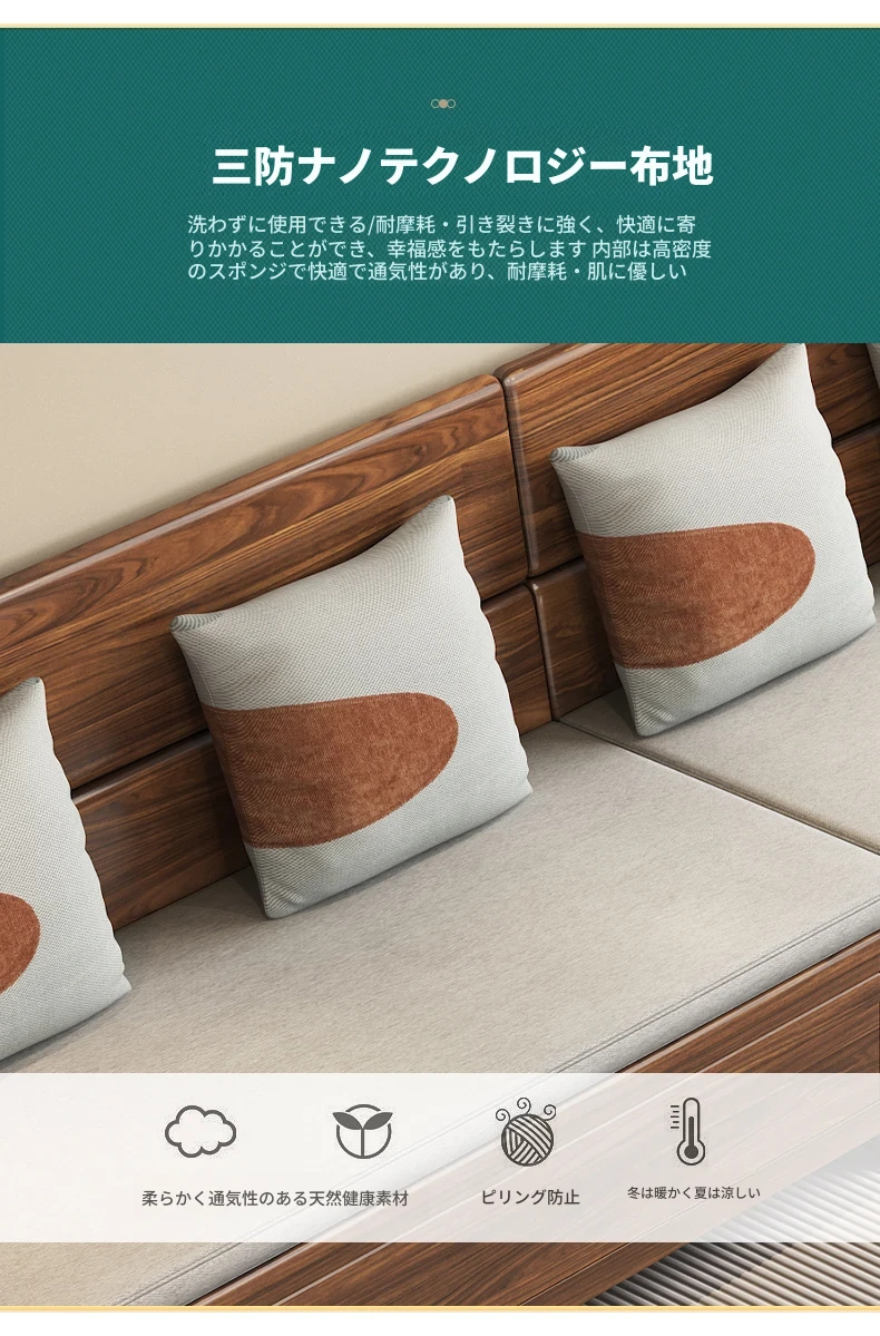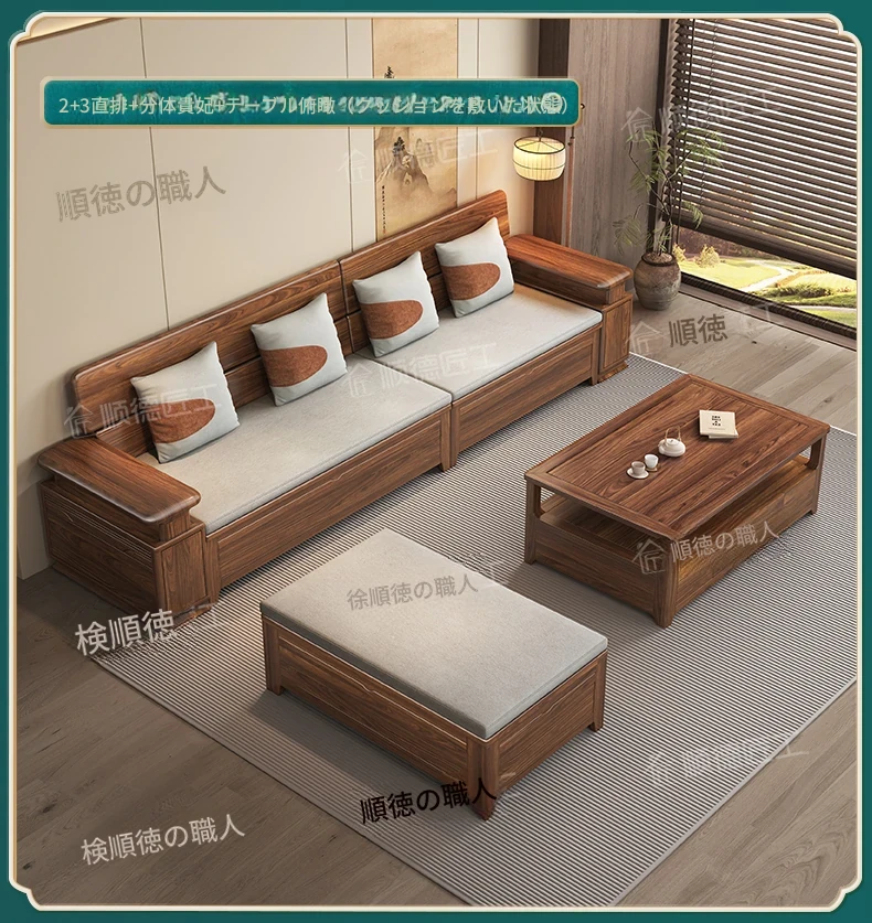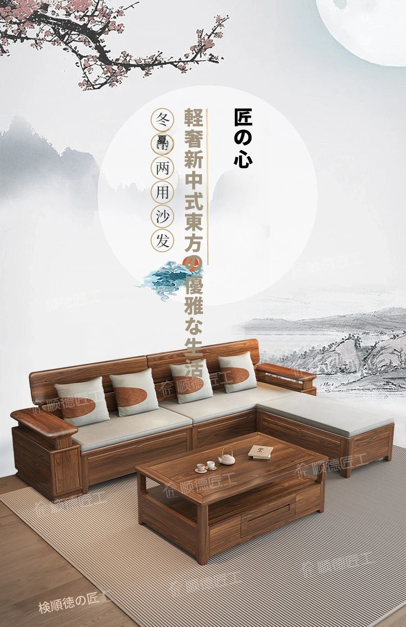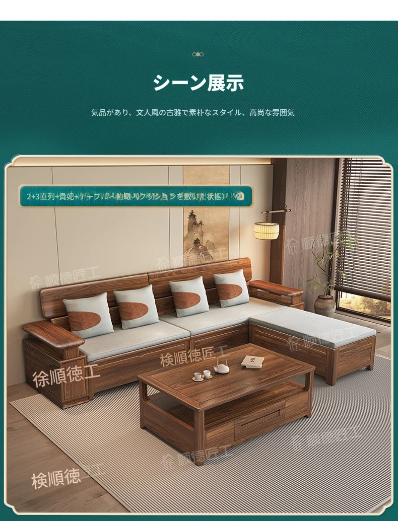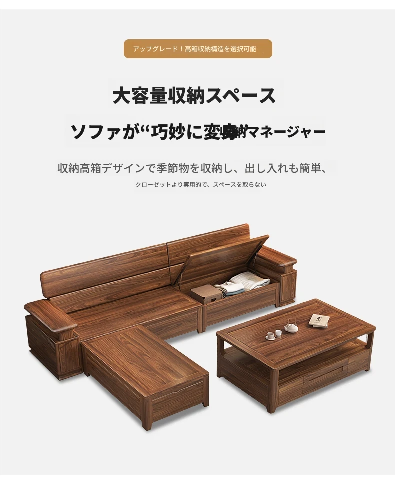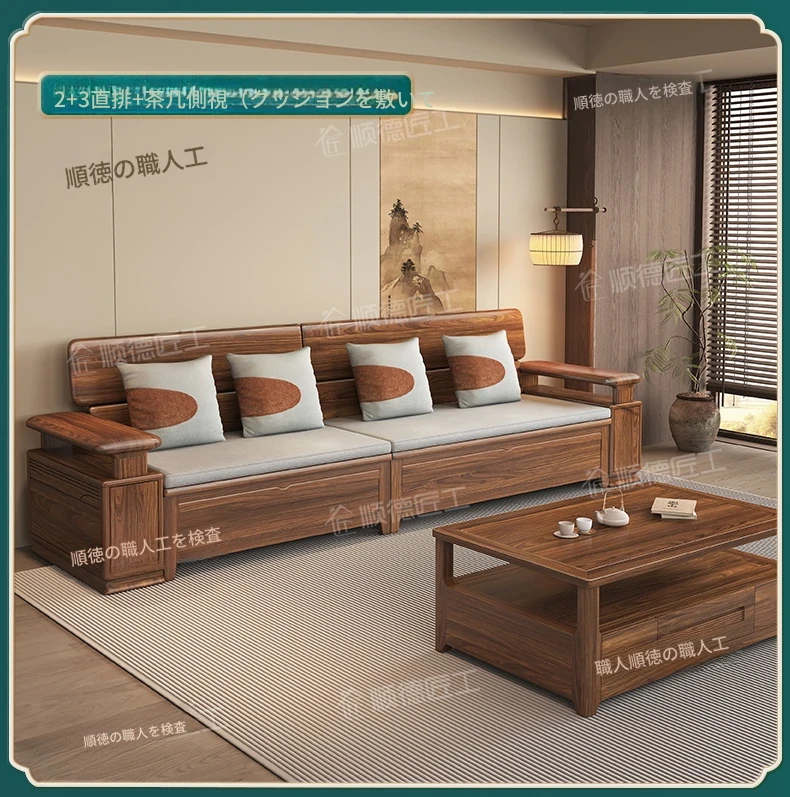 新中式スタイルのゴールデンナシの木製5人掛けソファ、冬夏兼用、コーナー収納ボックス付きのコンパクトサイズ!小さなお部屋に最適で、スタイリッシュな空間を演出します。