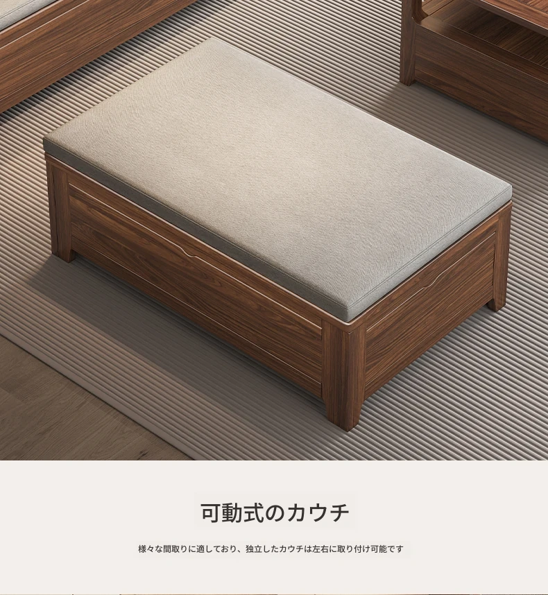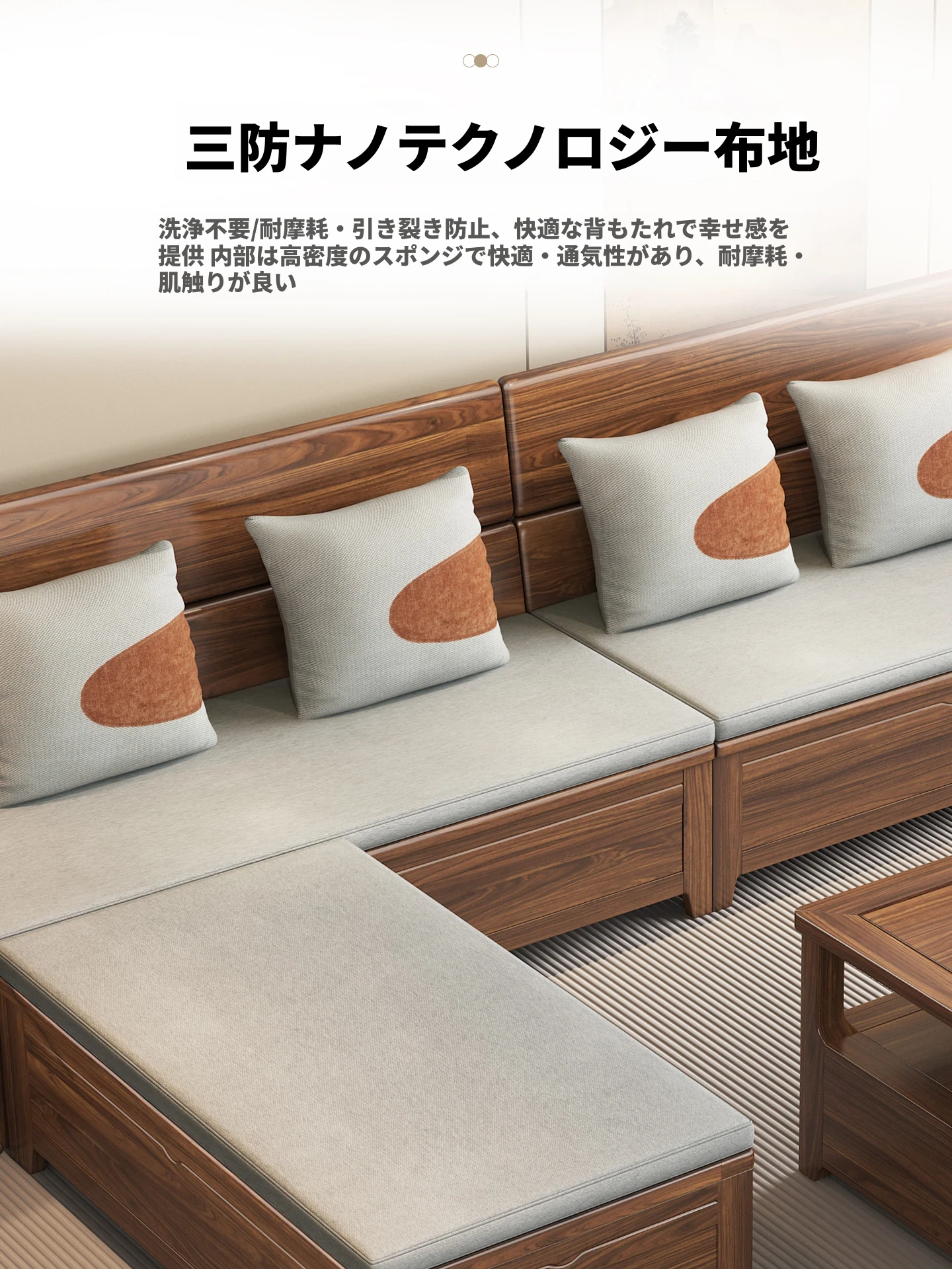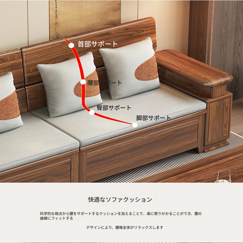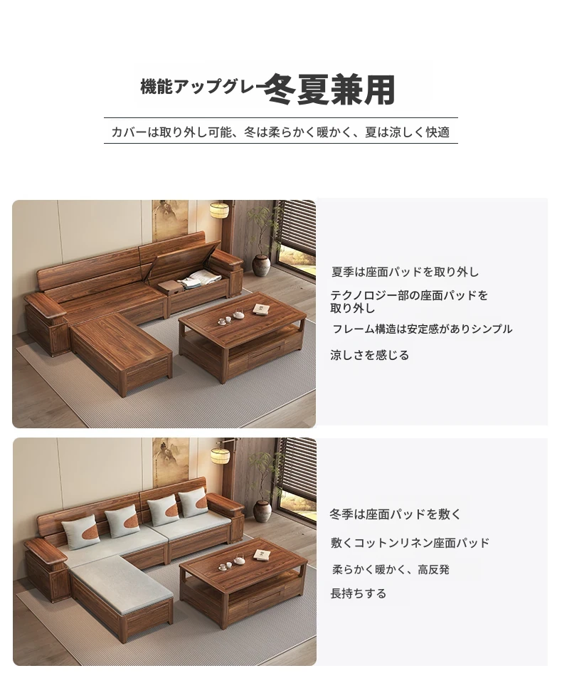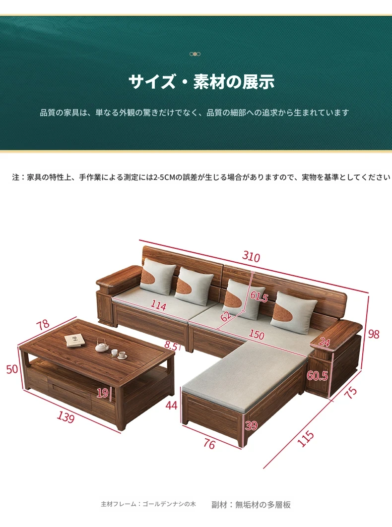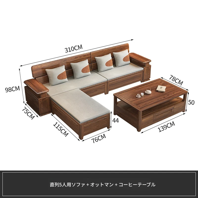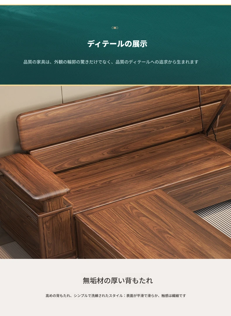 新中式スタイルのゴールデンナシの木製5人掛けソファ、冬夏兼用、コーナー収納ボックス付きのコンパクトサイズ!小さなお部屋に最適で、スタイリッシュな空間を演出します。