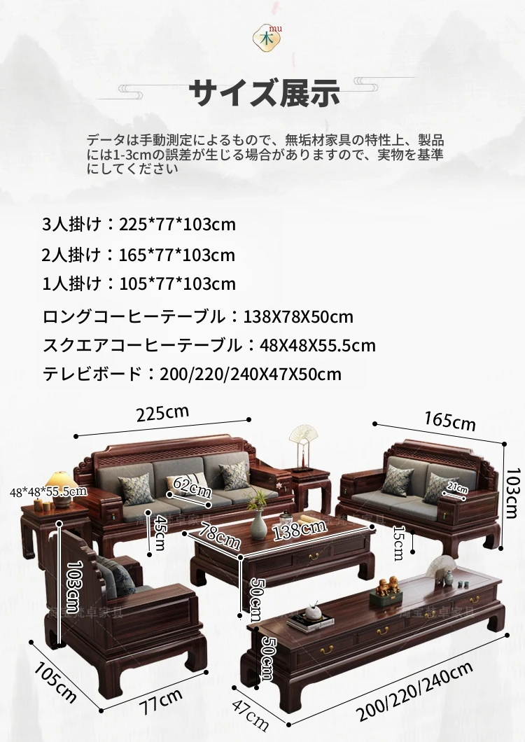 【金花梨木】六人掛けソファ+貴妃+テーブル+テレビ台+1角テーブル+二人掛けソファ
