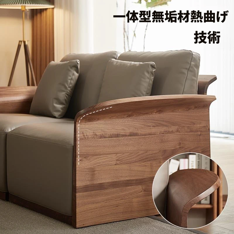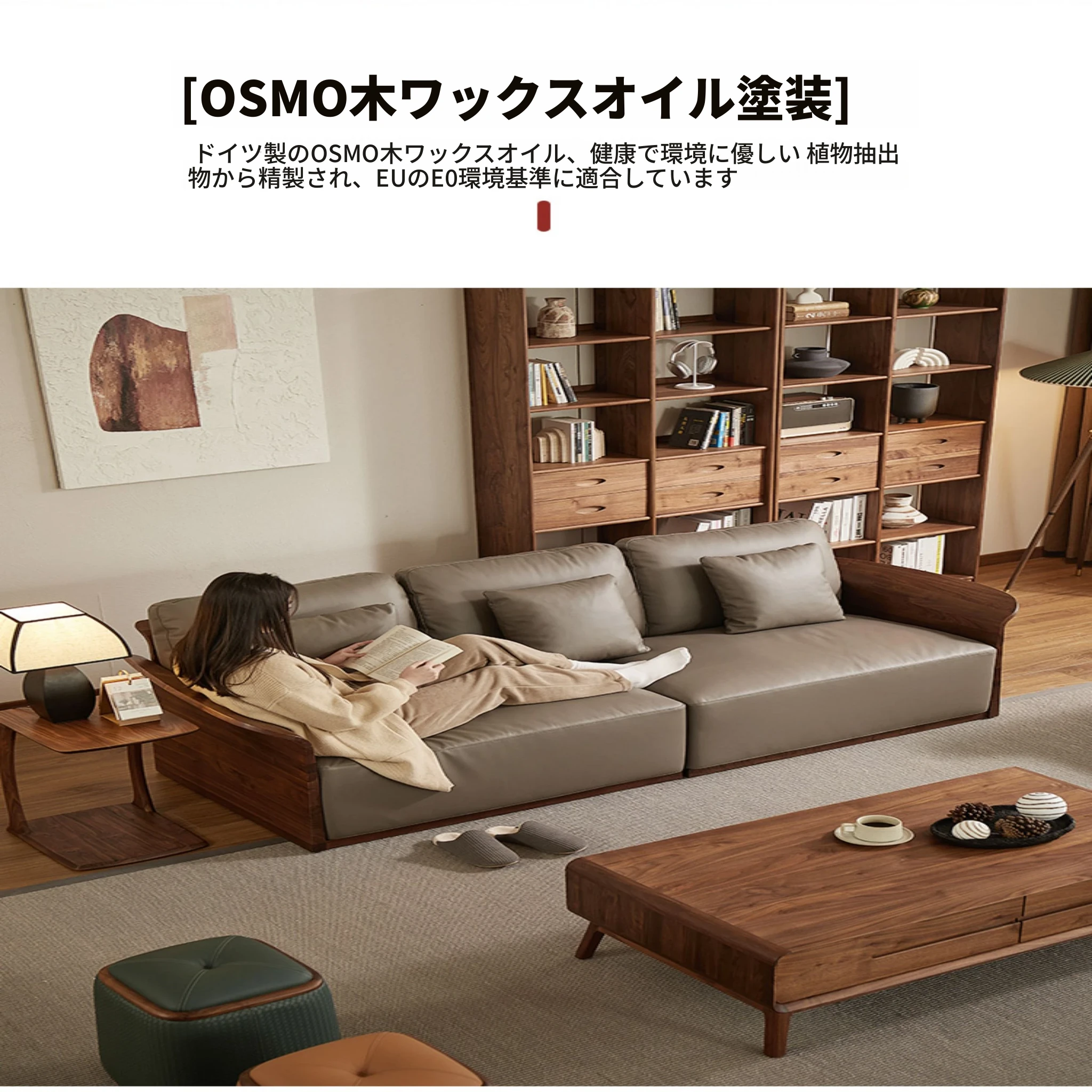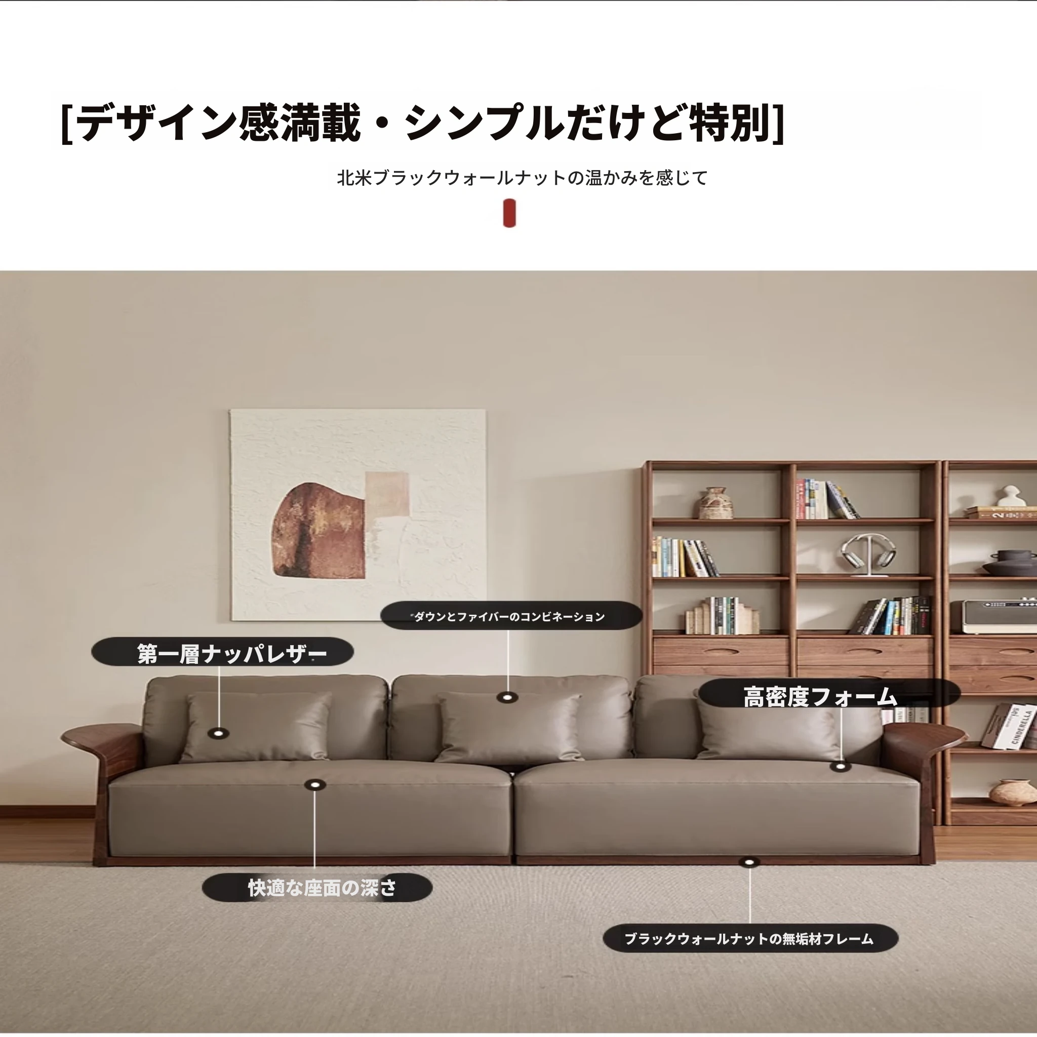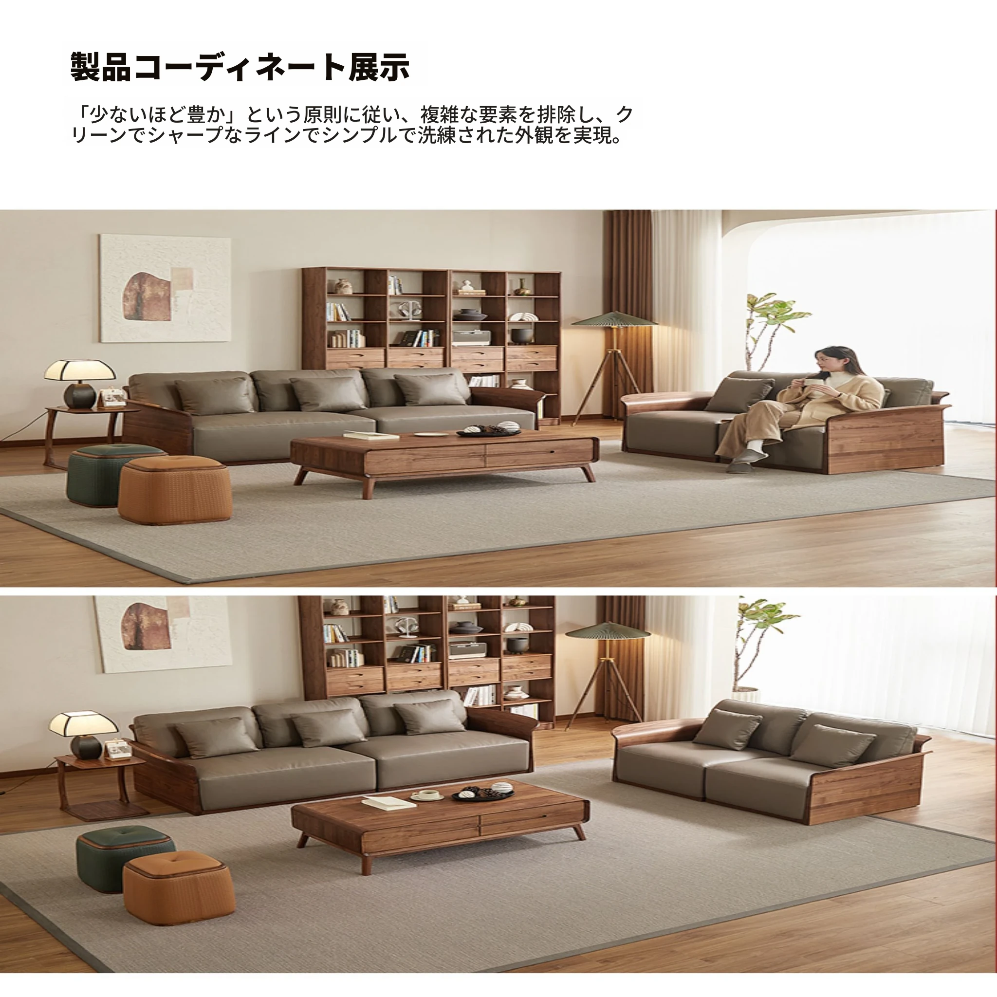 北欧モダンスタイルの別荘向け、北米産ブラックウォールナットソファセット - 新作!高級本革使用、シンプルで洗練されたデザインが魅力のリビングルームにぴったりの逸品。