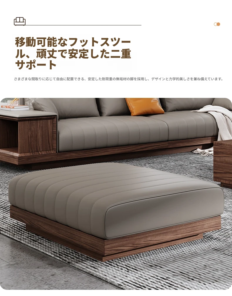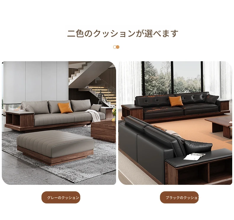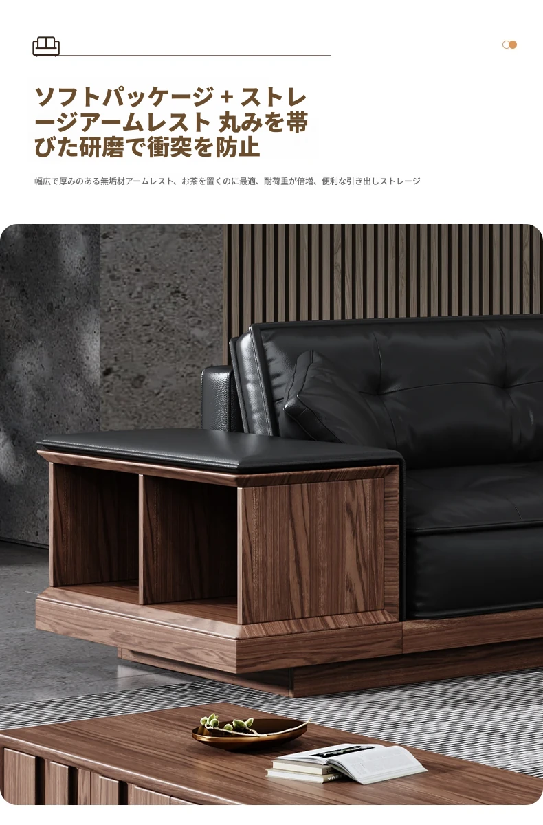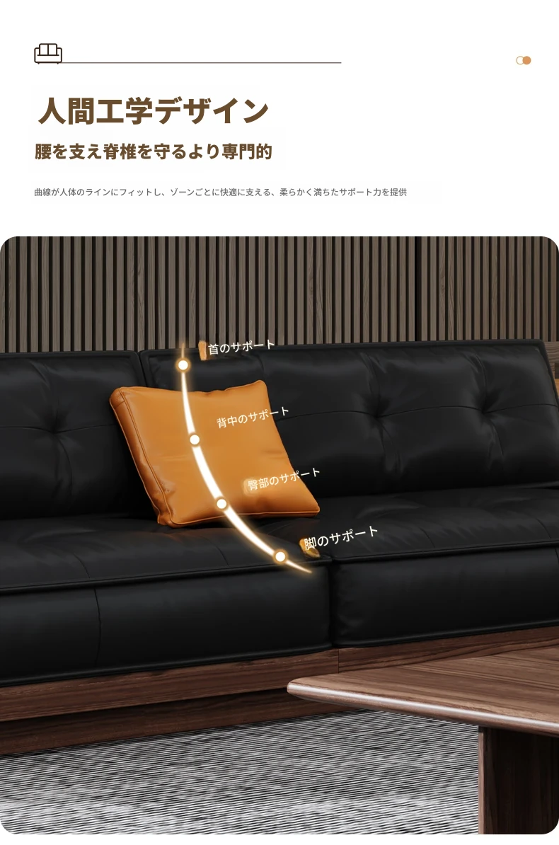 黒ウォールナット無垢材ソファー - ラグジュアリーな本革使用、シンプルでおしゃれなデザイン!大小様々な空間にぴったりなリラックスできる別荘スタイルのリビング家具。