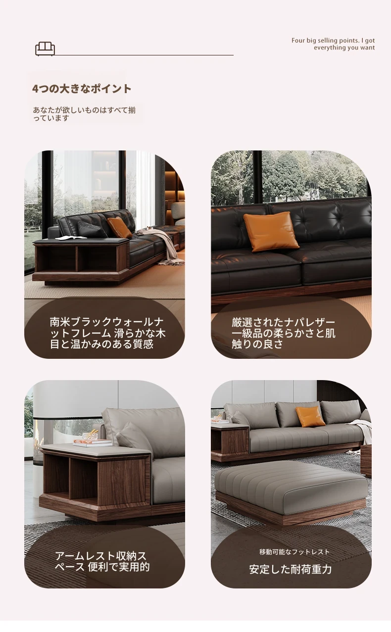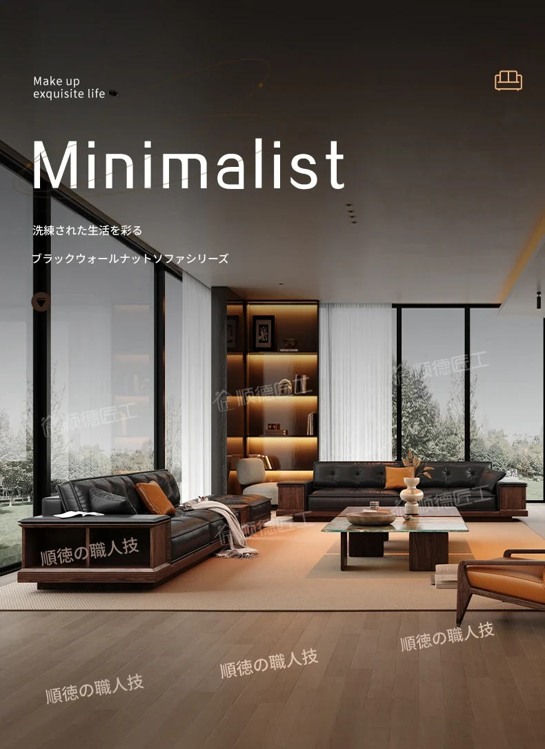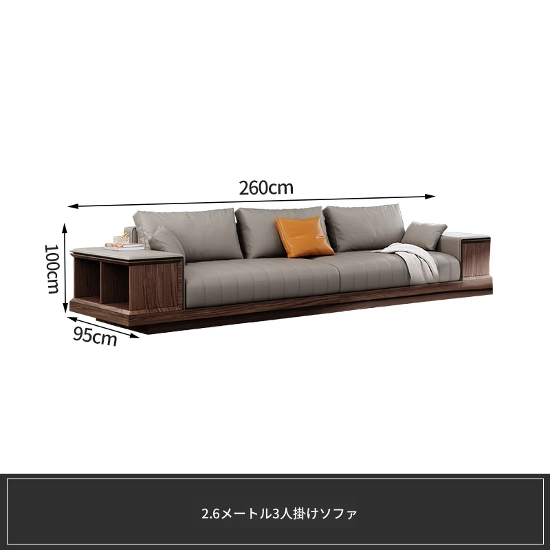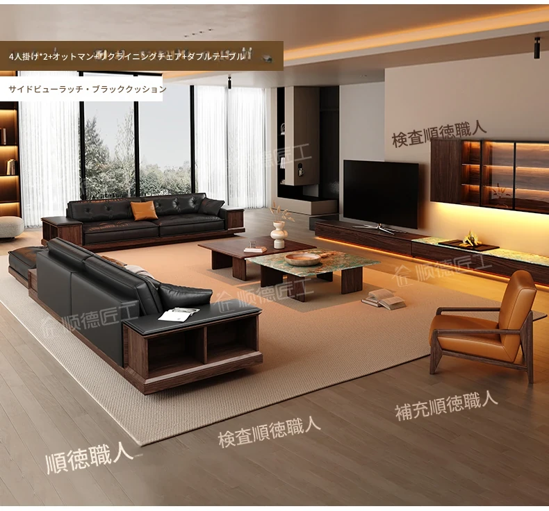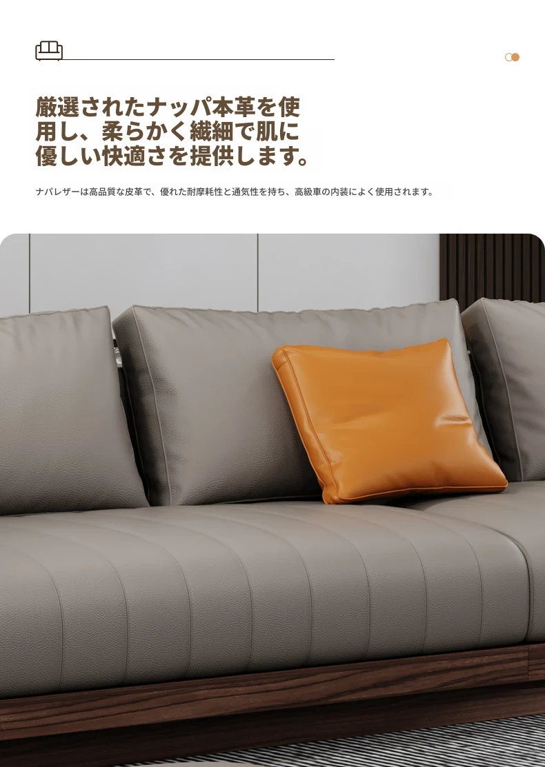 黒ウォールナット無垢材ソファー - ラグジュアリーな本革使用、シンプルでおしゃれなデザイン!大小様々な空間にぴったりなリラックスできる別荘スタイルのリビング家具。