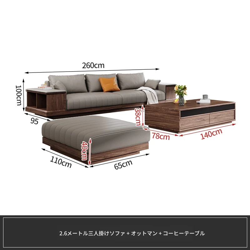 2.6メートル3人用ソファ+オットマン+コーヒーテーブル