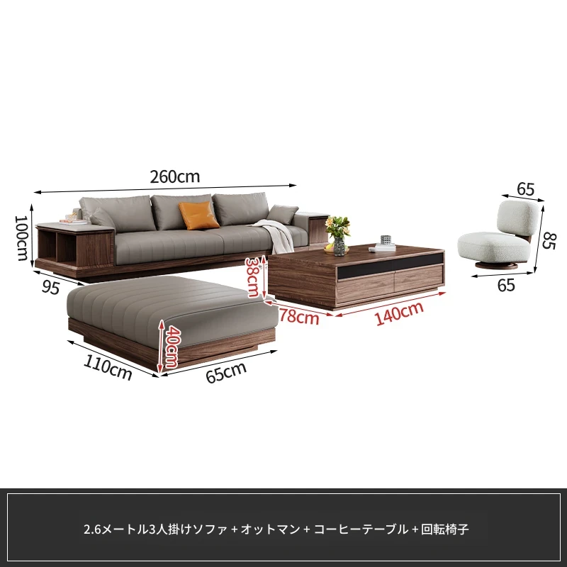 2.6メートル3人用ソファ+オットマン+コーヒーテーブル+回転椅子+テレビボード