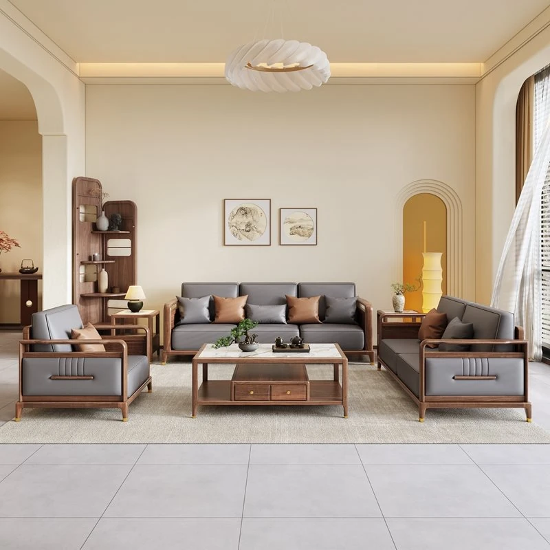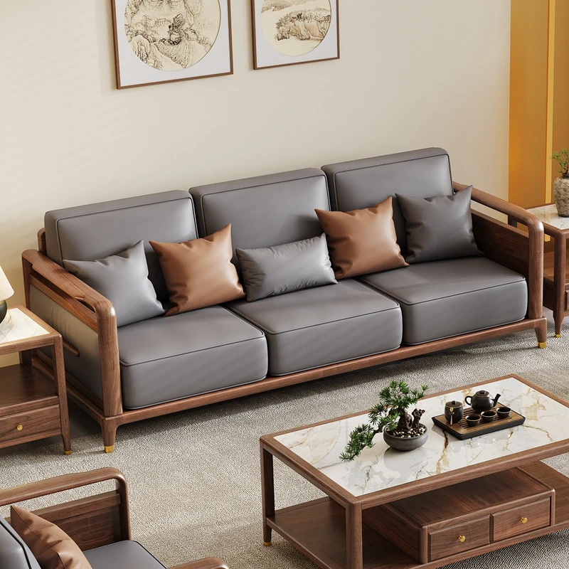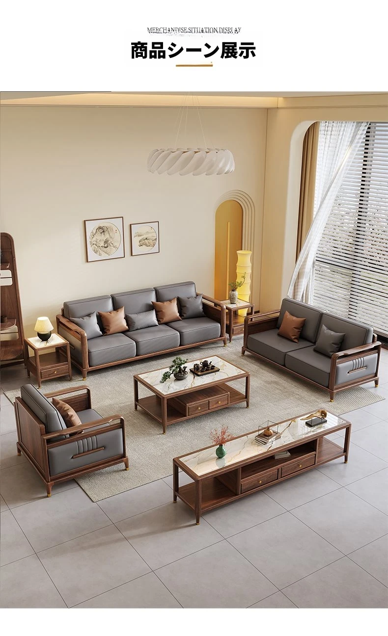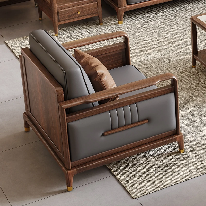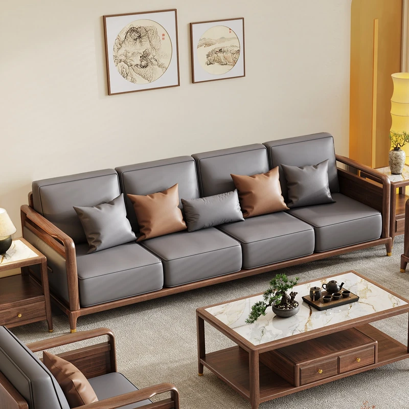 天壇家具の新しい中式スタイル 北米産ブラックウォールナットの本革ソファ - 宋の美学と禅の趣を感じる民宿や別荘、オフィスに最適!