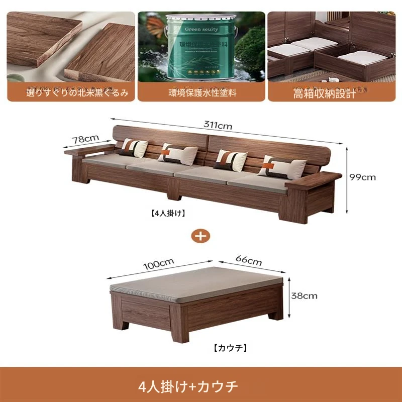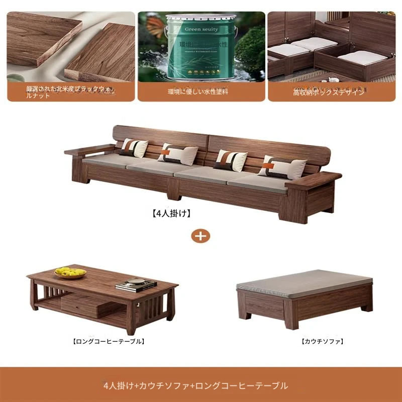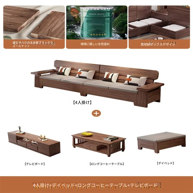 4人用 + カウチ + ロングコーヒーテーブル + テレビキャビネット 北米黒ウォールナット
