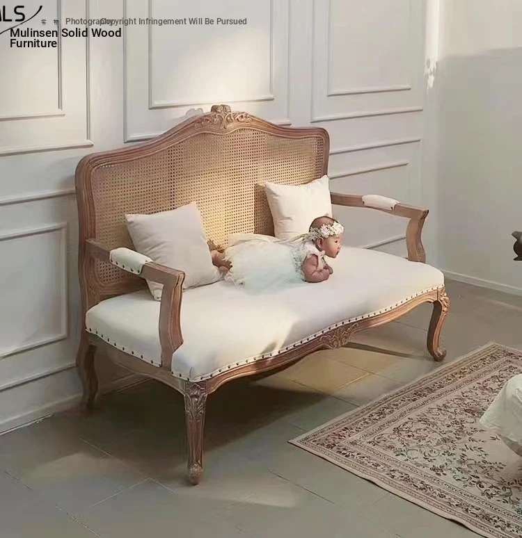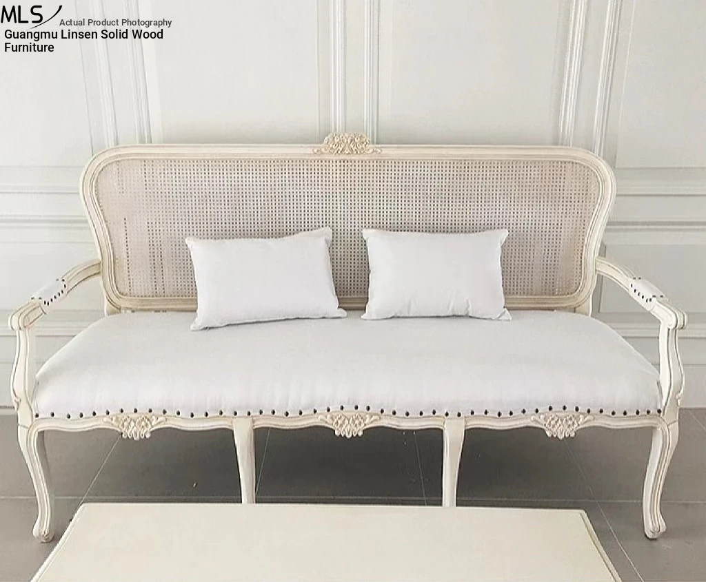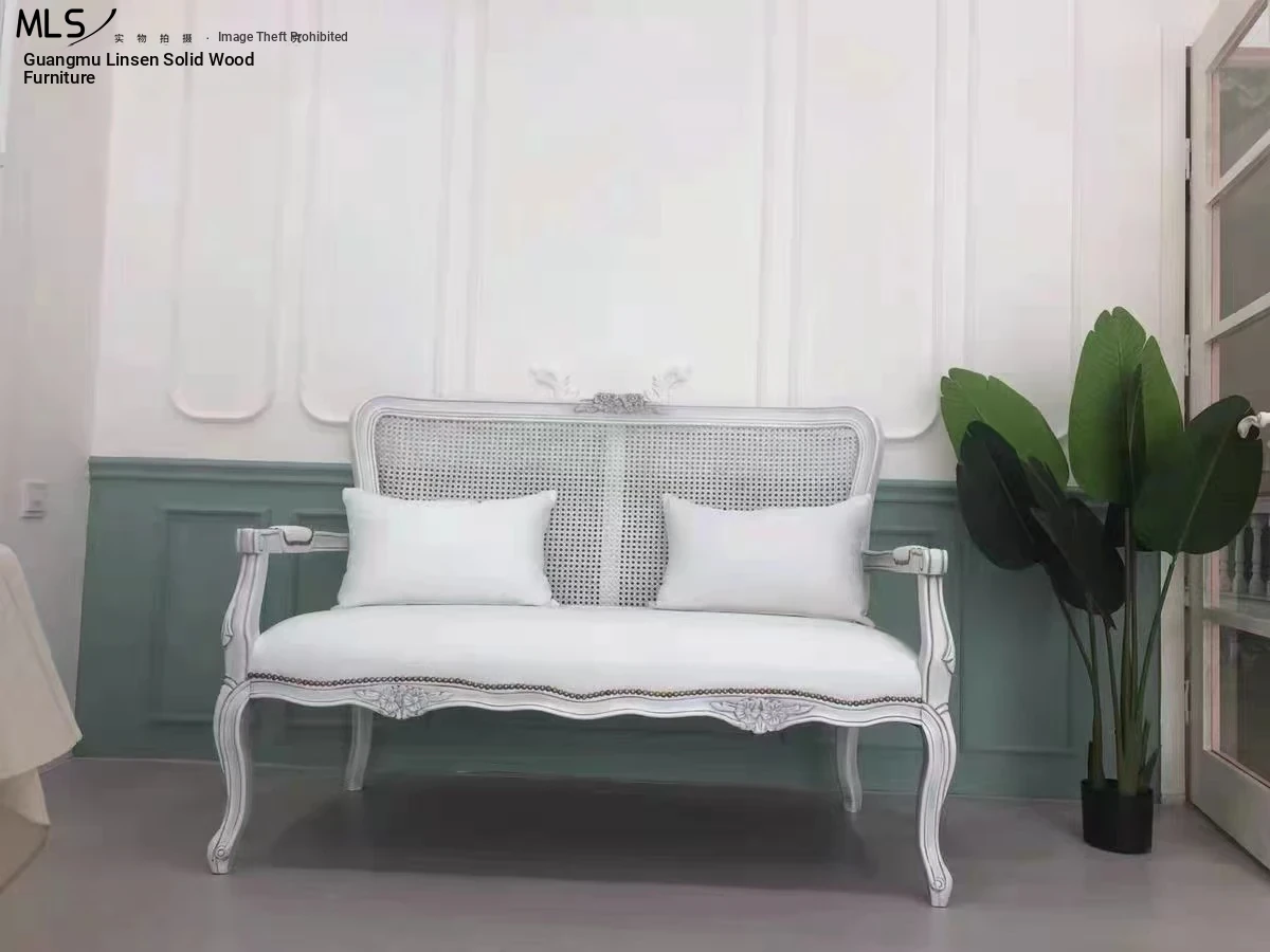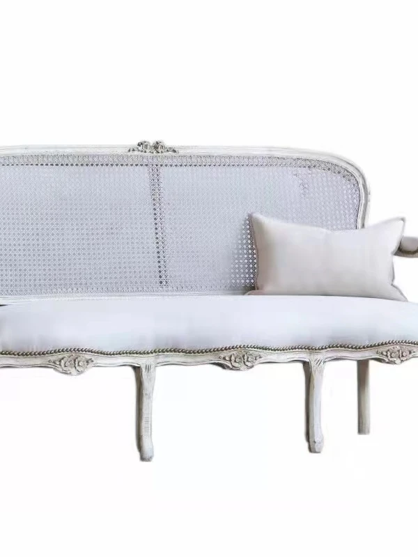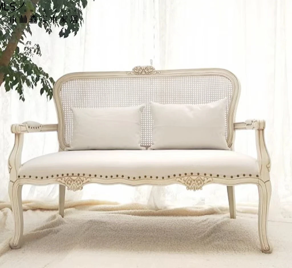 Vintage French-Style White Distressed Solid Wood Double Sofa - Rustic American Country & European Rattan Balcony Photography Chair for Comfort and Elegance
