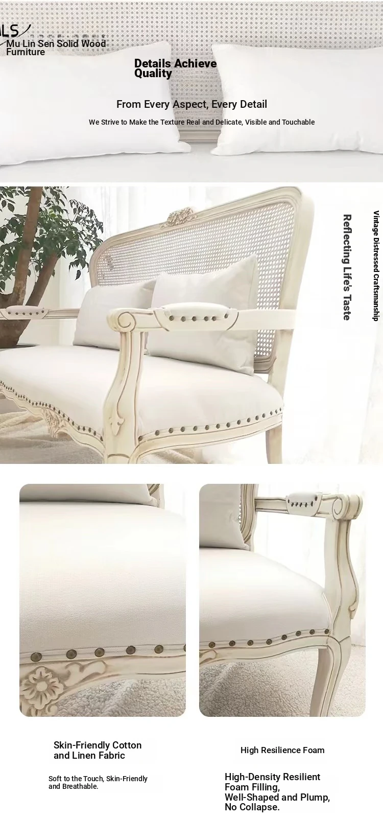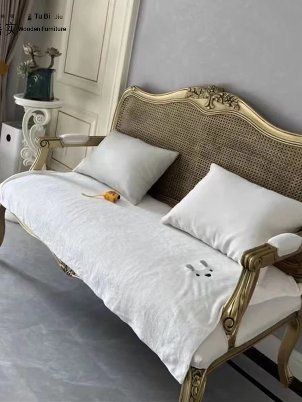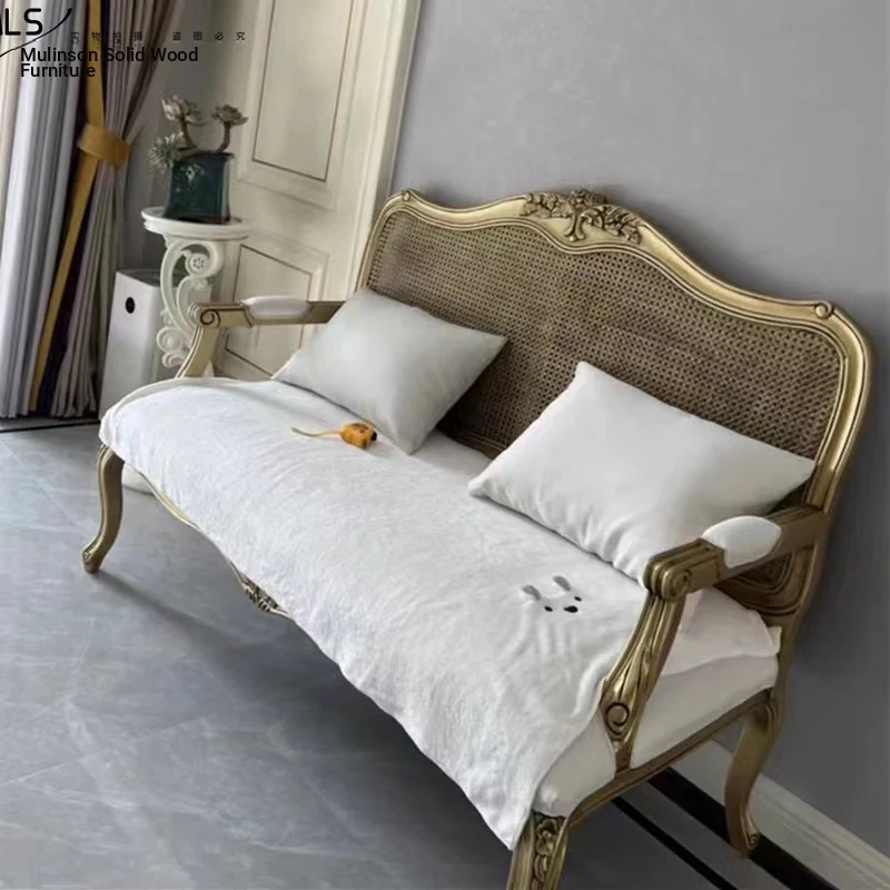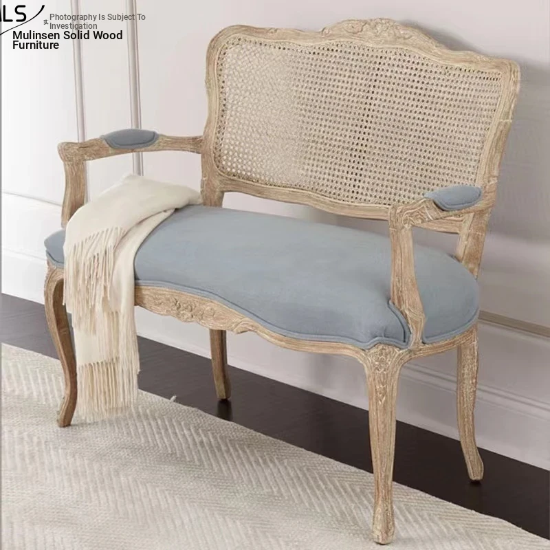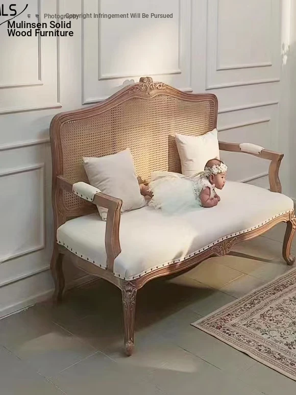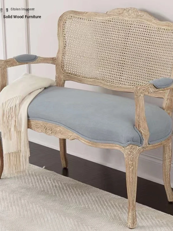 Vintage French-Style White Distressed Solid Wood Double Sofa - Rustic American Country & European Rattan Balcony Photography Chair for Comfort and Elegance