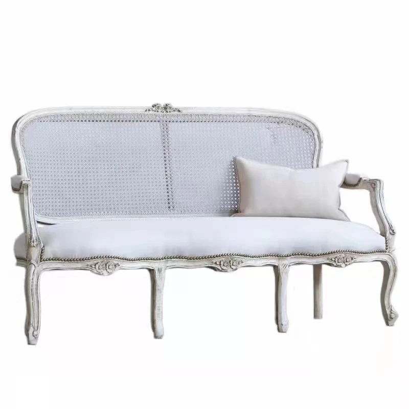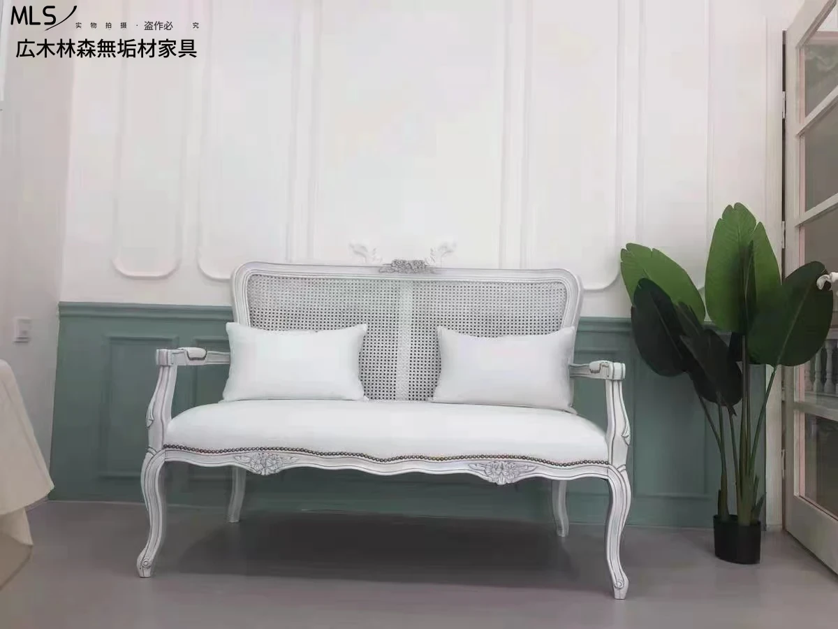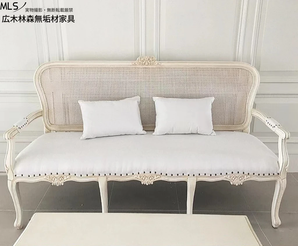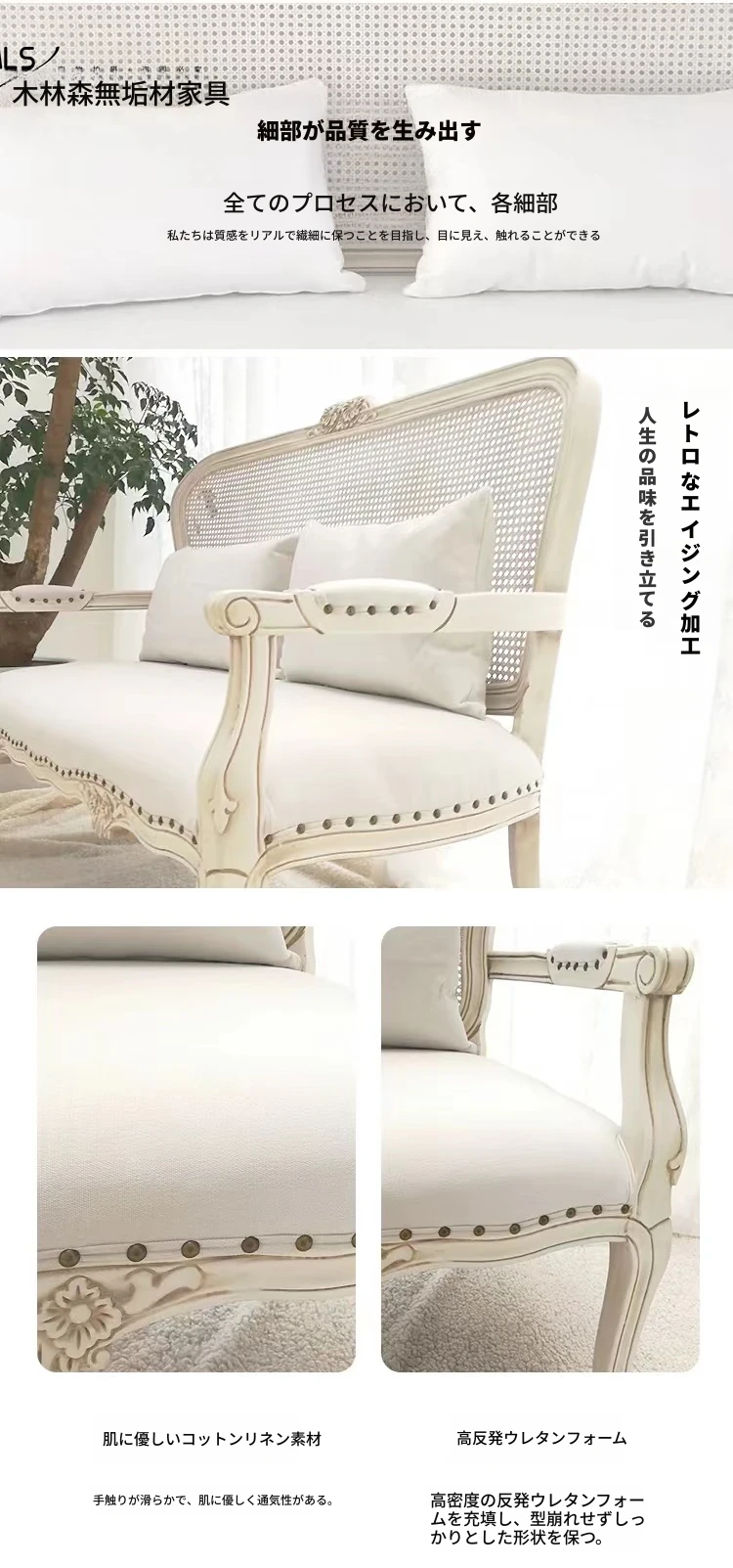 フランス風ヴィンテージホワイト仕上げの無垢材ダブル3人掛けソファ|アメリカンカントリー&ヨーロピアンスタイルのラタンバルコニー&フォトスタジオ用ソファチェアで、優雅なひとときを演出します。
