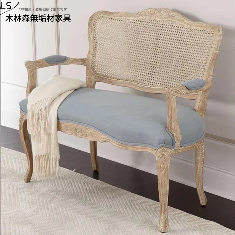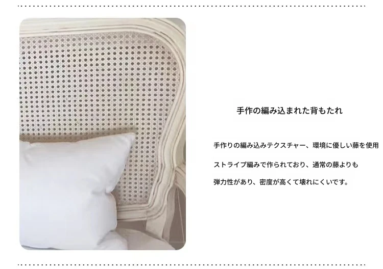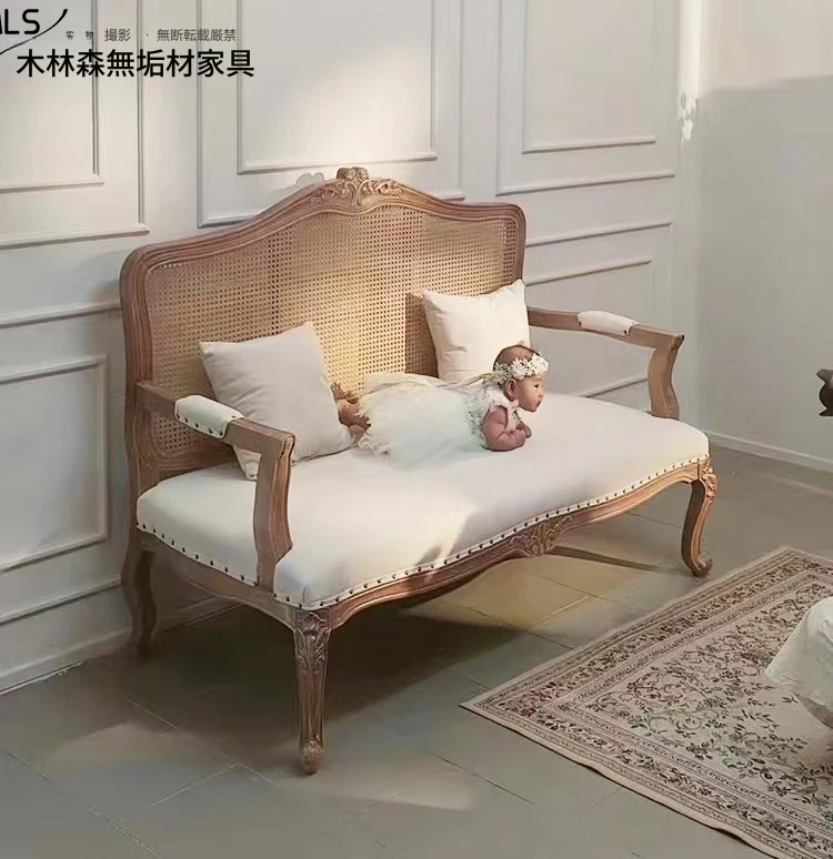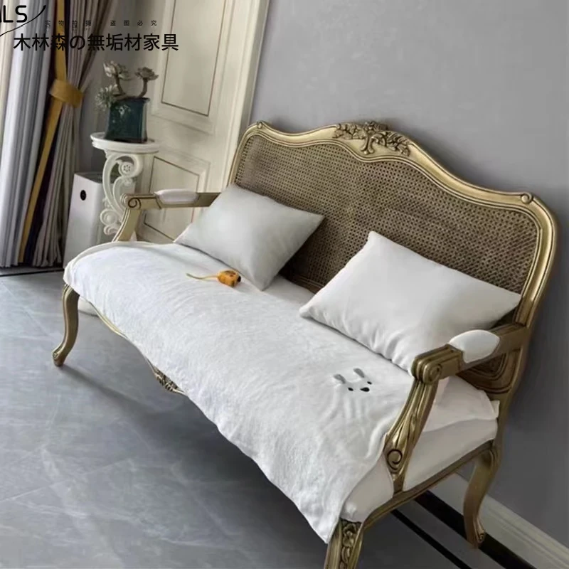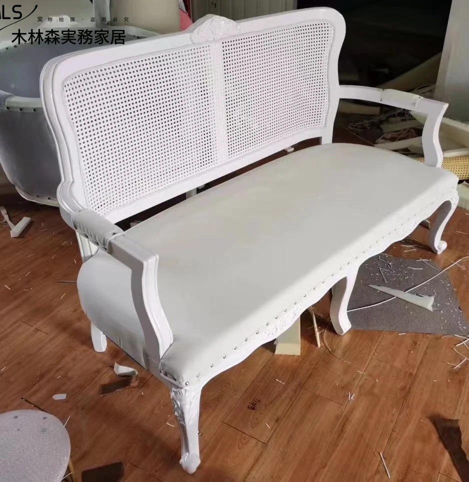 フランス風ヴィンテージホワイト仕上げの無垢材ダブル3人掛けソファ|アメリカンカントリー&ヨーロピアンスタイルのラタンバルコニー&フォトスタジオ用ソファチェアで、優雅なひとときを演出します。