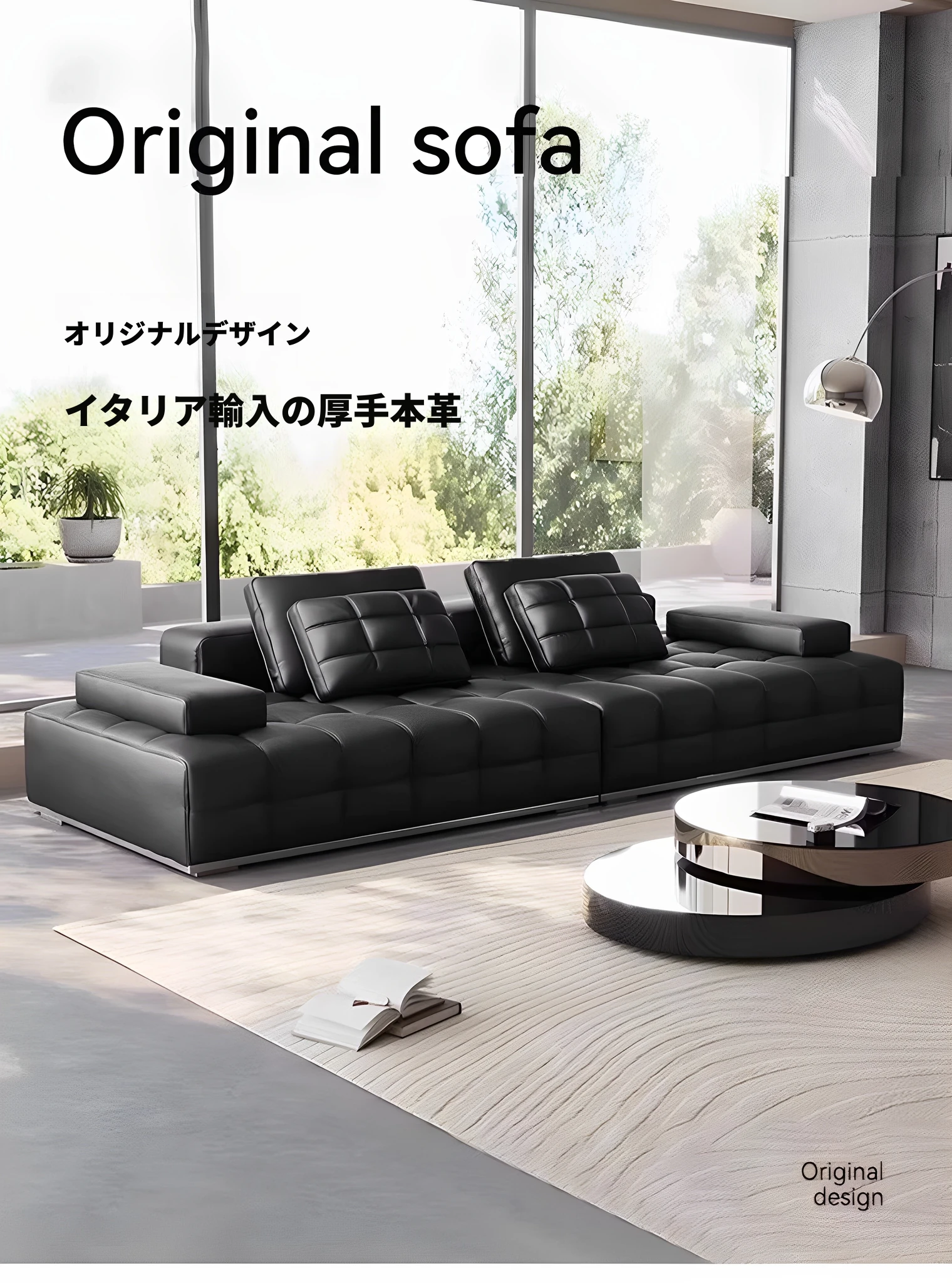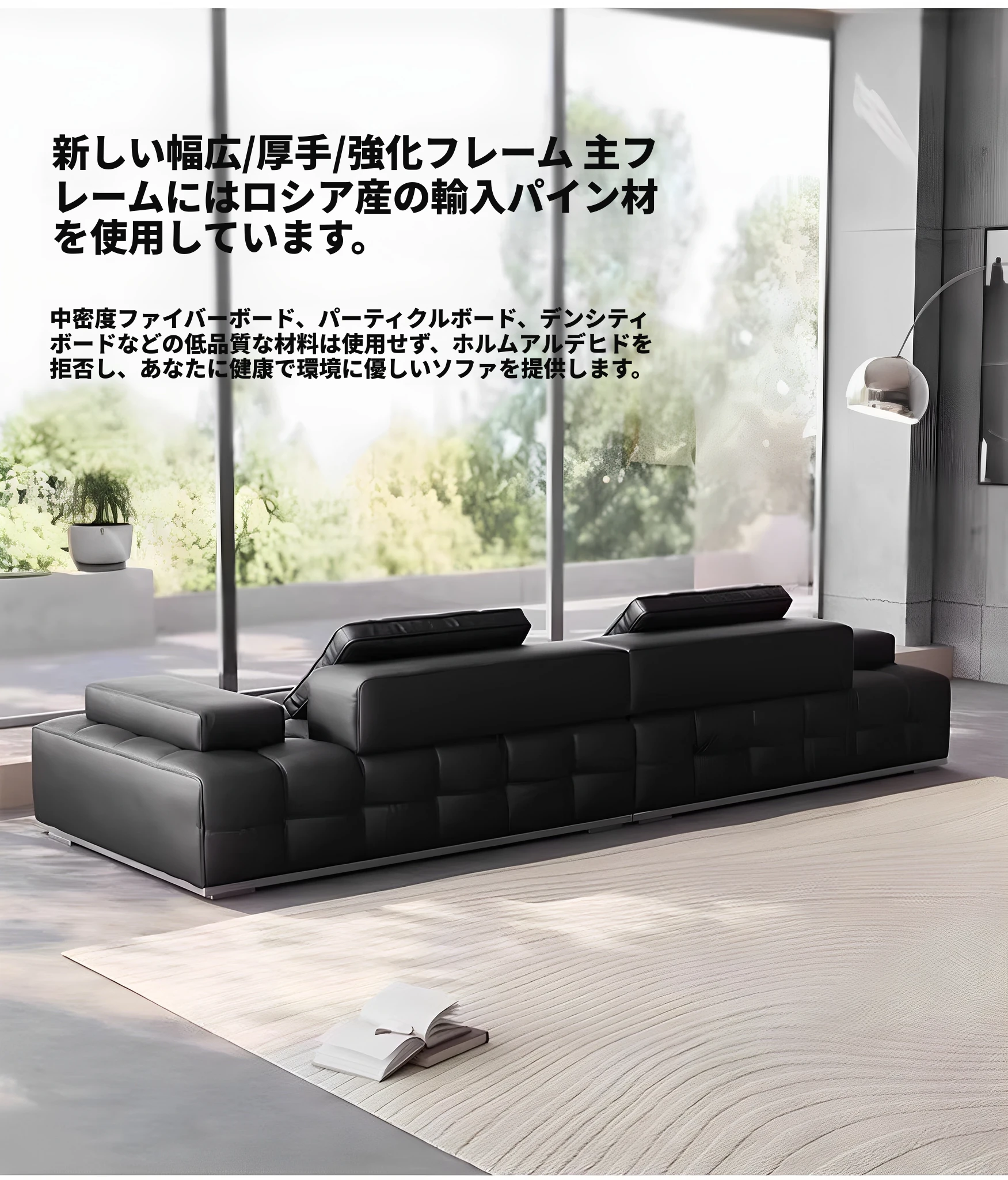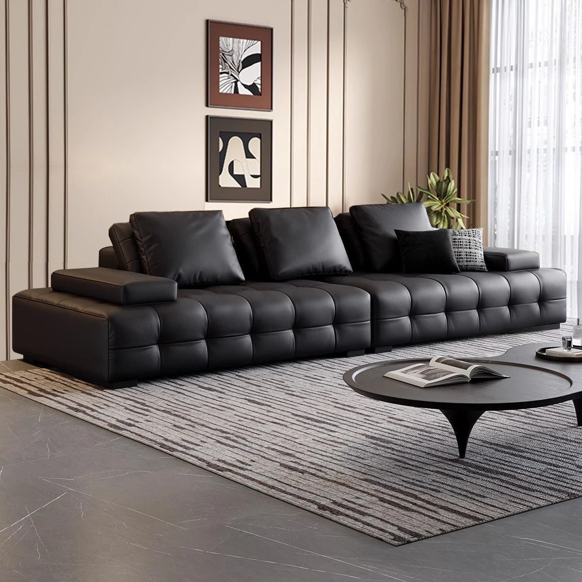 ユンラン ローレンスソファ イタリアンミニマリズム 本革リビングルーム用ラグジュアリー ブラックレザーソファ ストレートデザインで洗練された空間を演出!