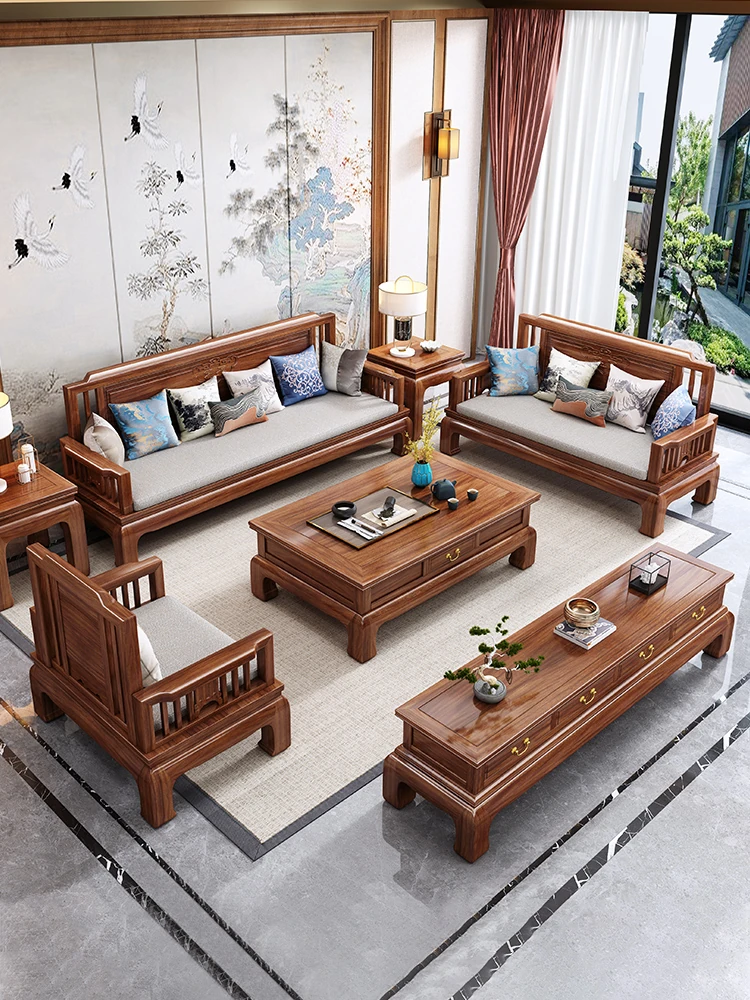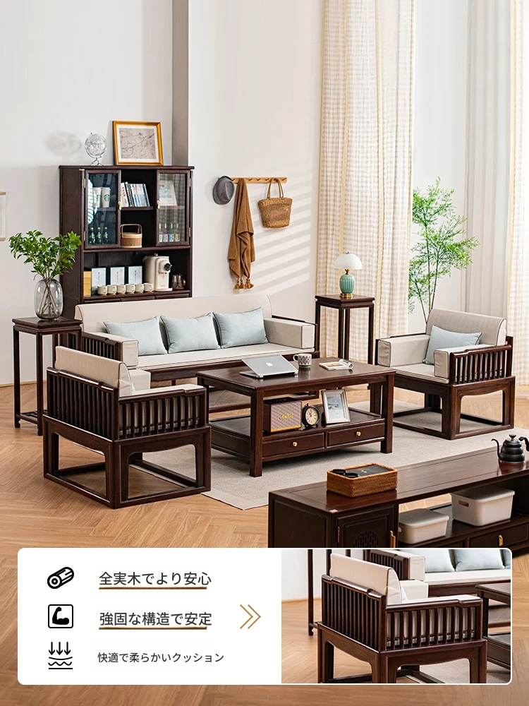 北米産ブラックウォールナットの新中式ソファ!シンプルでモダンなデザイン、広々としたヴィラや大きなリビングに最適な本格的な木製ソファ。上質な布地と耐久性を兼ね備え、リラックスしたひとときを提供します。
