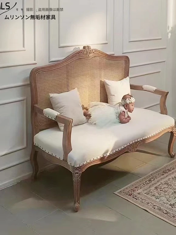 フランス風ヴィンテージホワイト仕上げの無垢材ダブル3人掛けソファ|アメリカンカントリー&ヨーロピアンスタイルのラタンバルコニー&フォトスタジオ用ソファチェアで、優雅なひとときを演出します。