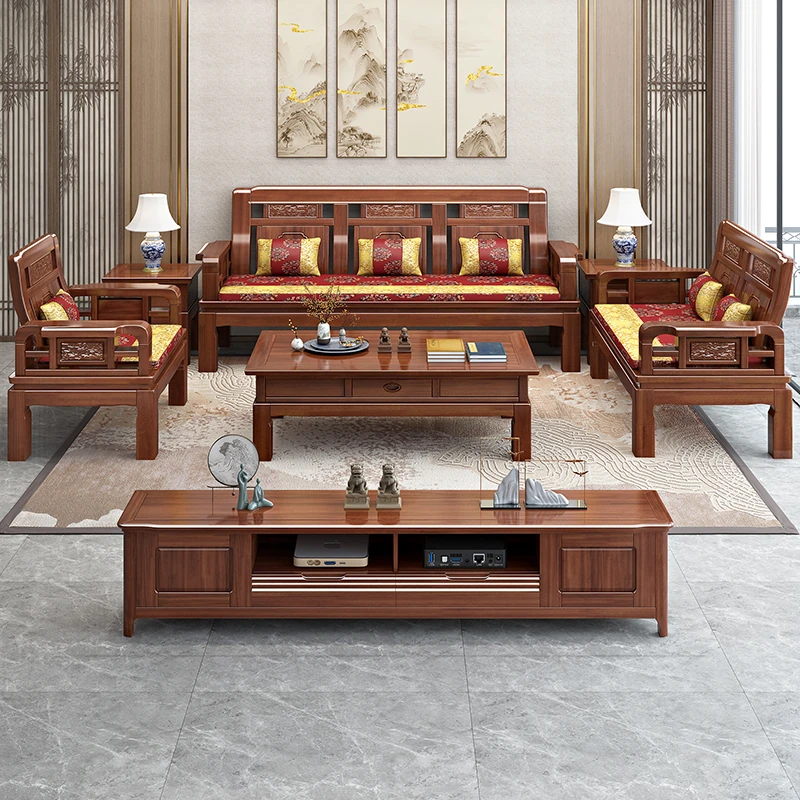 豪華な金花梨木の彫刻付き実木ソファセット - 古典的な中式デザイン、冬夏兼用、シンプルな別荘スタイルの赤木リビング家具。あなたのリビングに優雅さと温かみをプラスします!