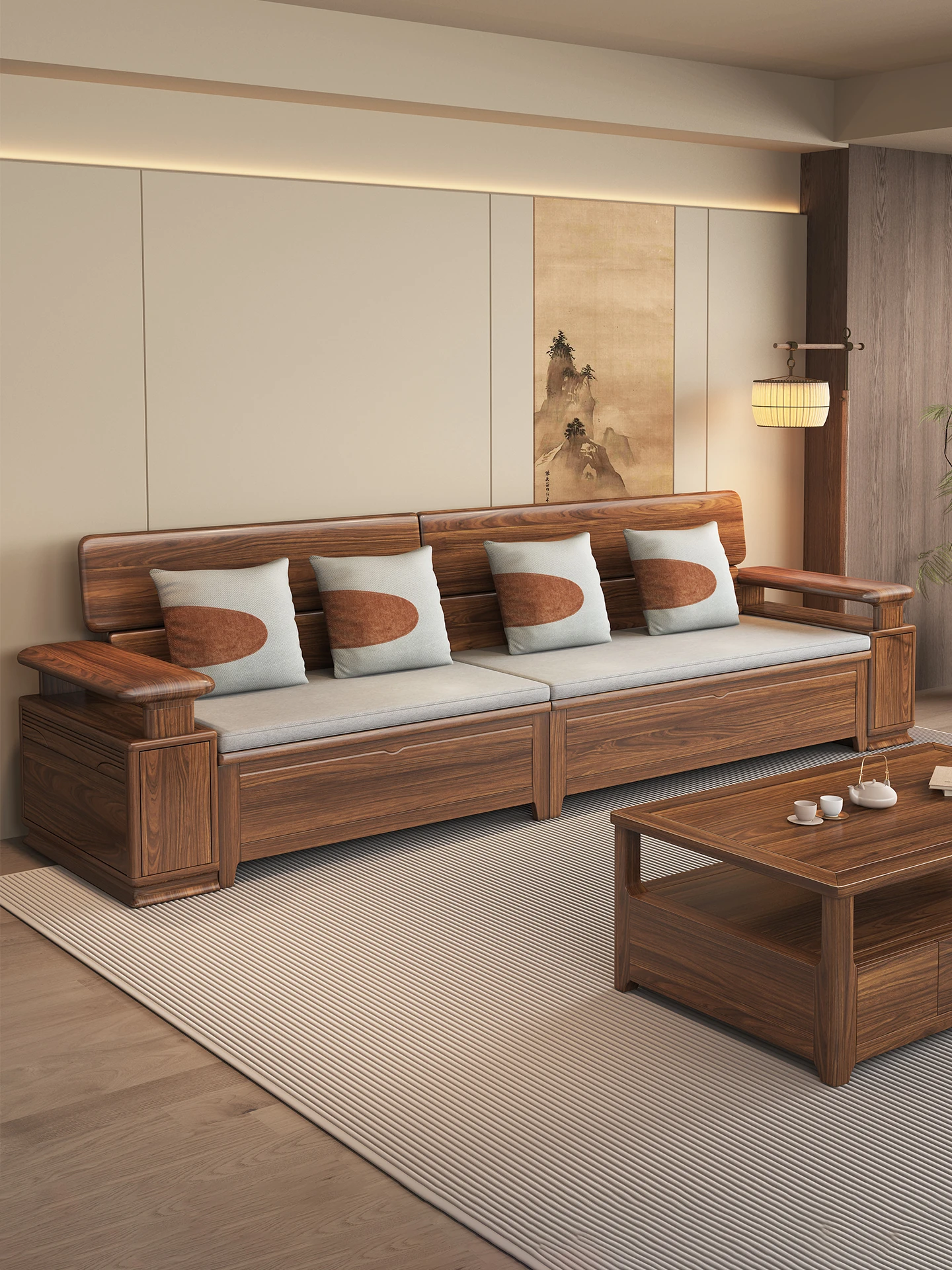 Modern Minimalist New Chinese Style Solid Black Walnut Sofa Set for Spacious Villas – Zen-Inspired Living Room Furniture