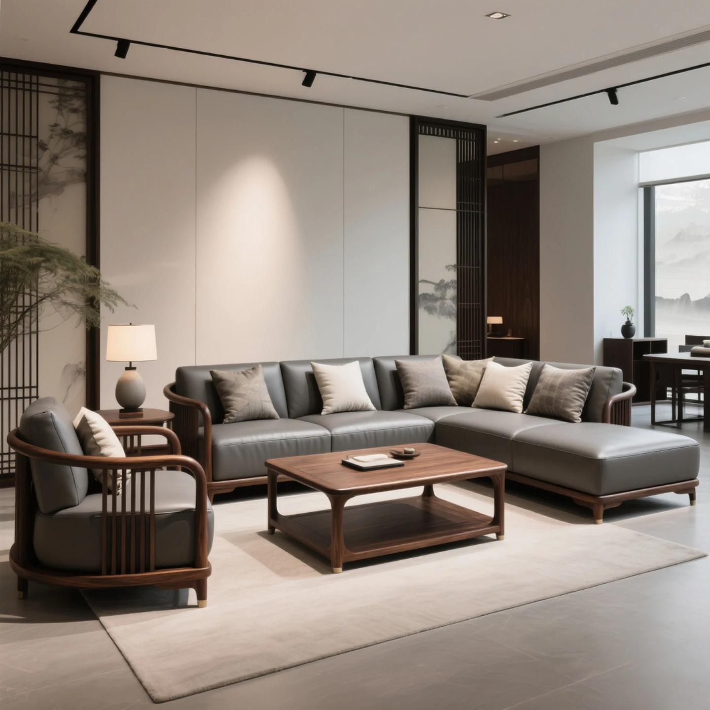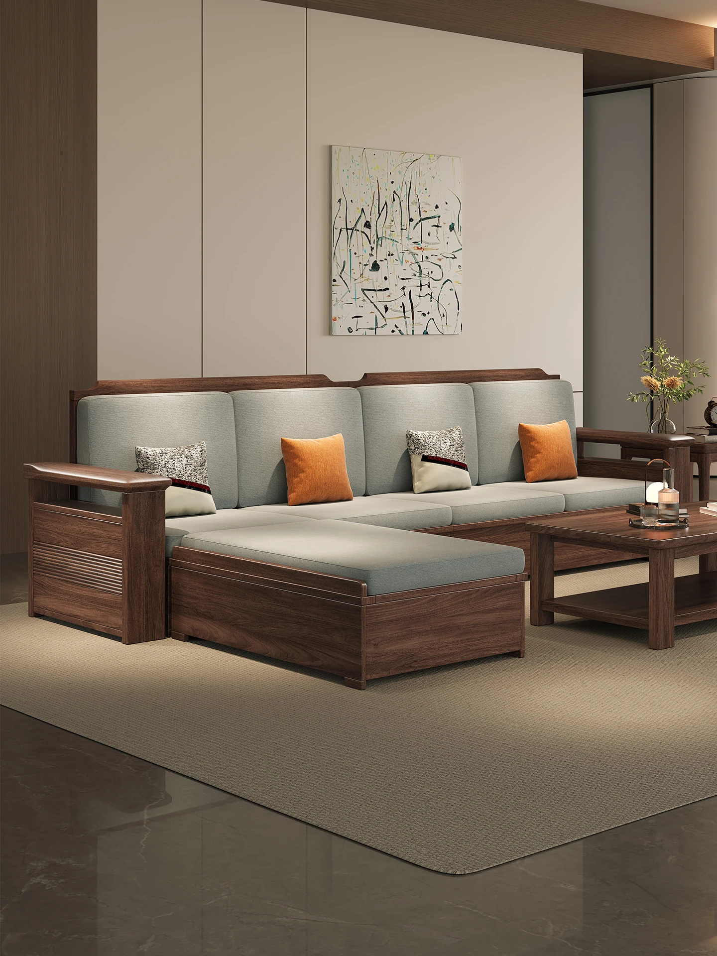 Modern Chinese Style Sofa Set - Elegant Walnut Wood Living Room Sofa for Spacious Homes - Minimalist Solid Wood & Fabric Design