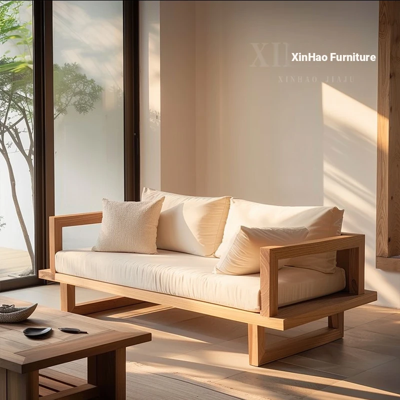 Japanese Wabi-Sabi Style Removable Two-Three Seater Solid Wood Sofa for Small Living Rooms - Perfect for Cozy Rentals and Relaxation
