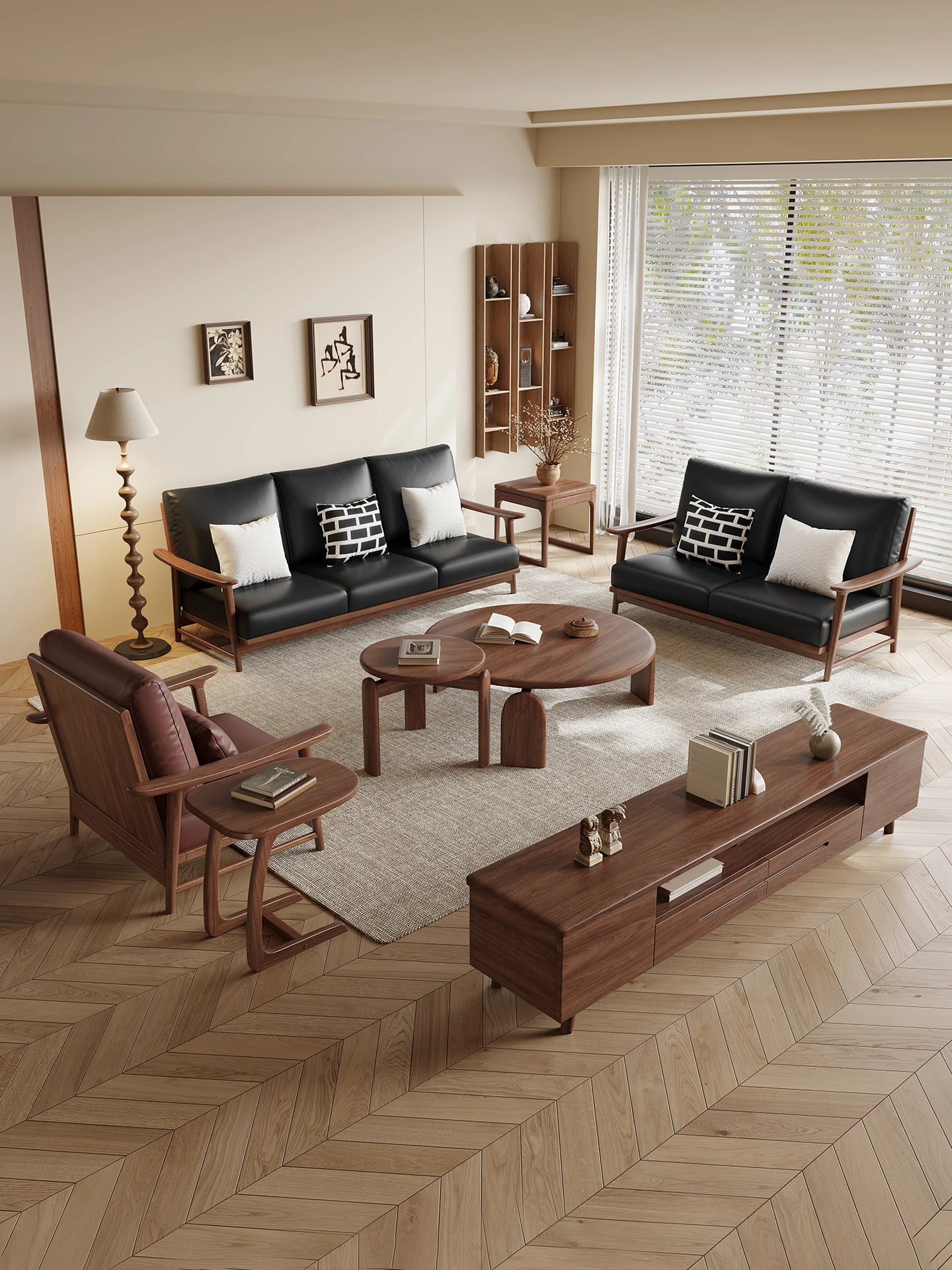 Modern Minimalist Walnut Solid Wood Sofa Set - Genuine Leather for Spacious Villas and Cozy Homes - Zen-inspired Chinese Style Living Room Furniture